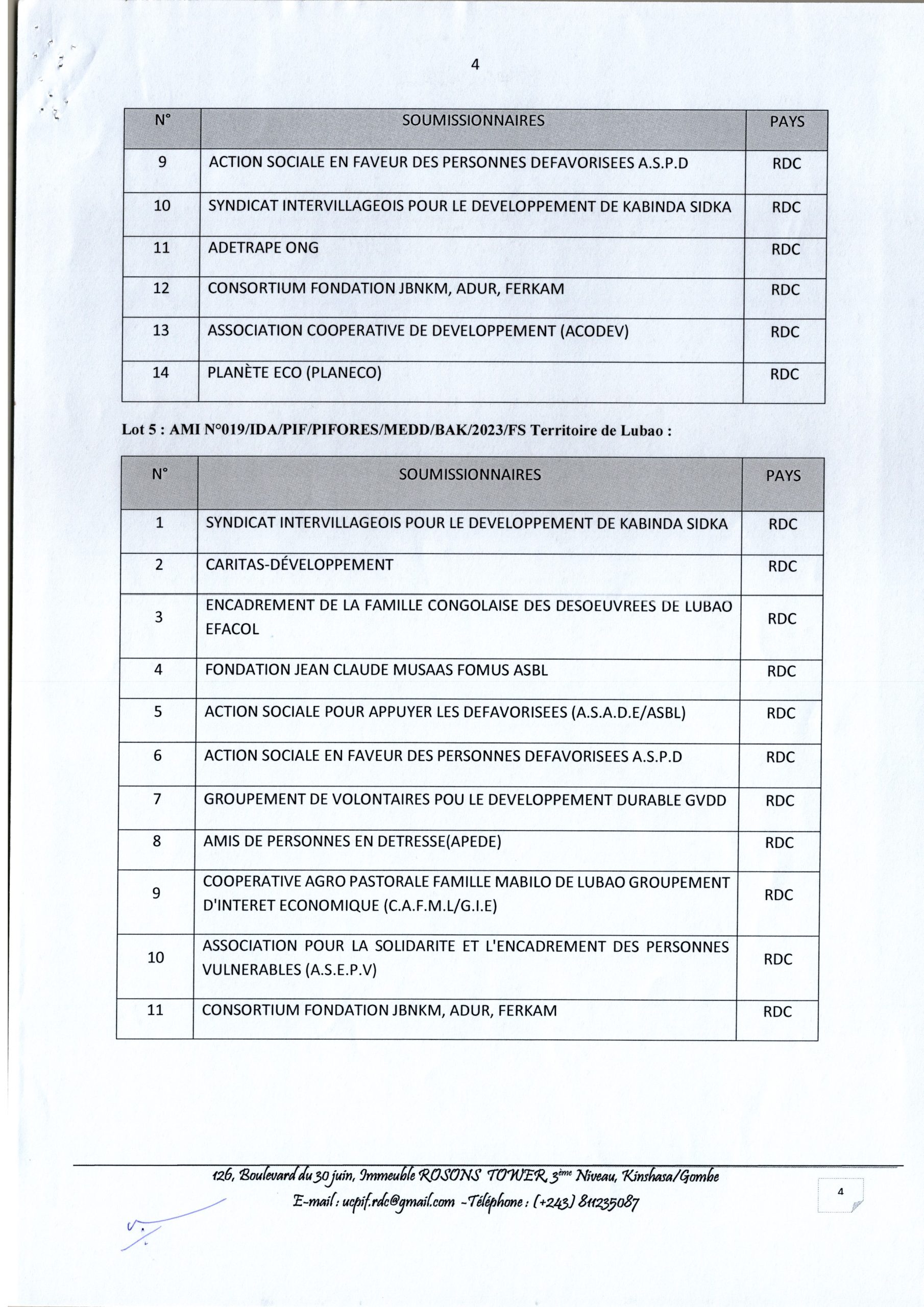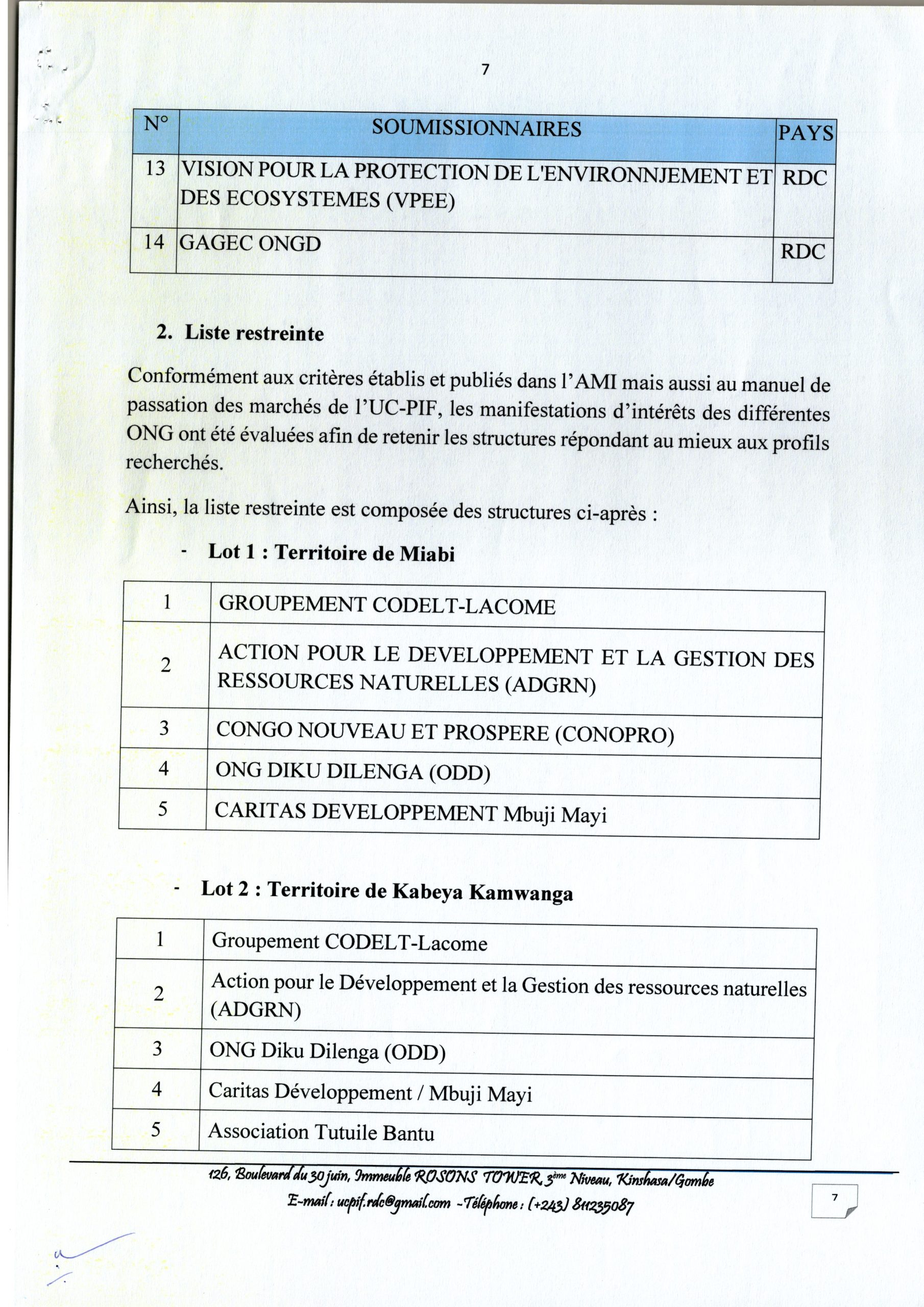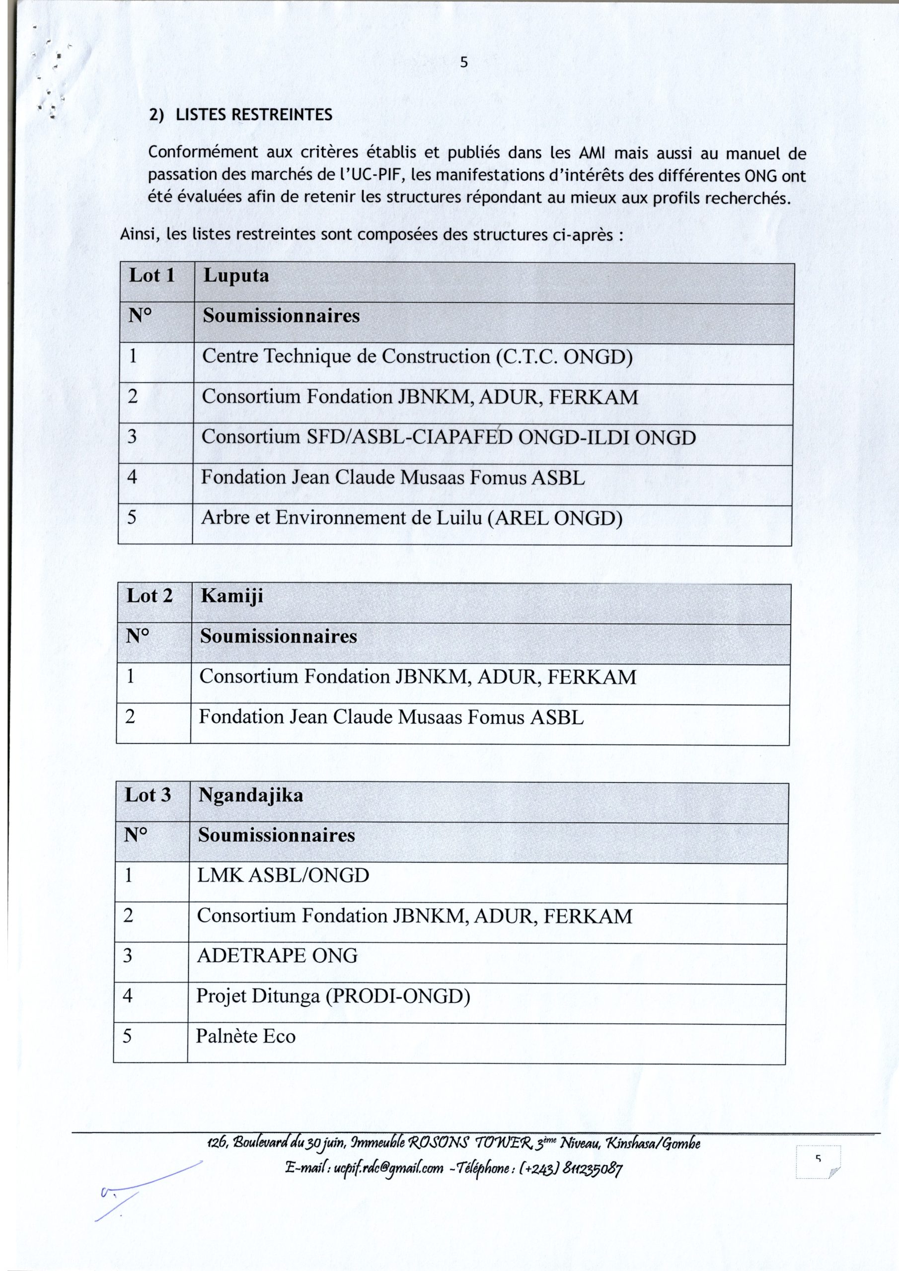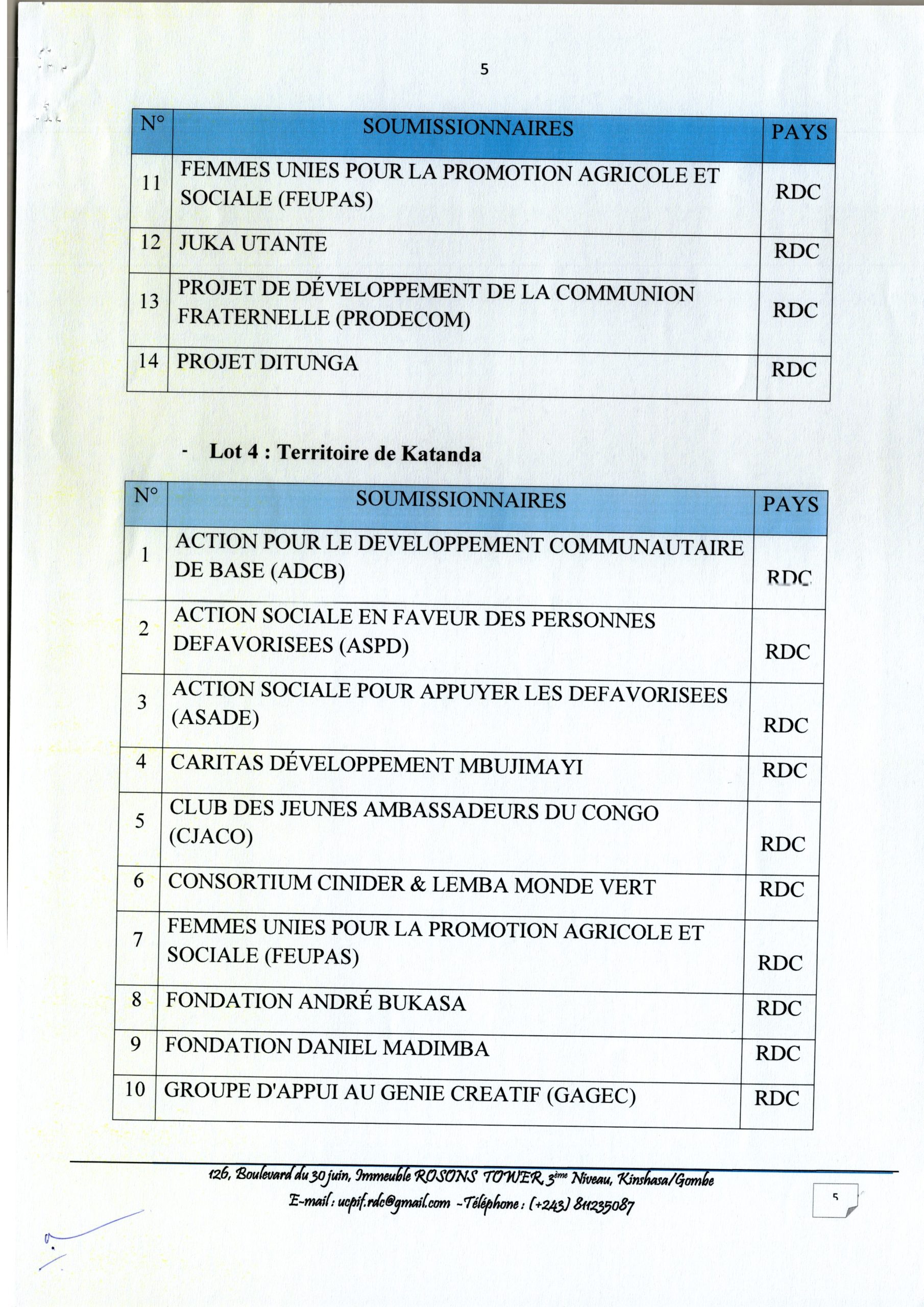 Liste restreinte des agences locales d’exécution en charge de la mise en œuvre des activités communautaires du projet dans la province de Lomami