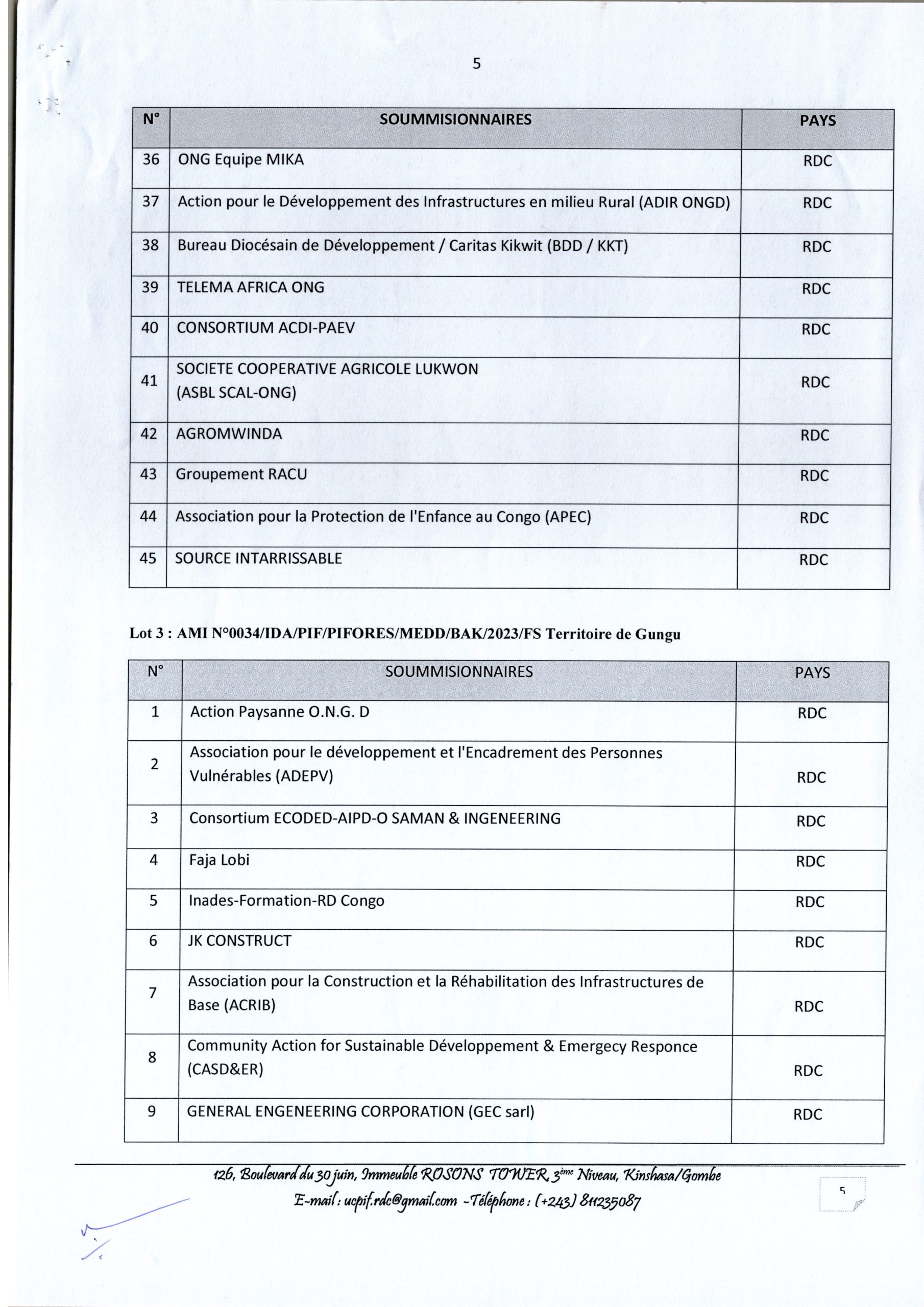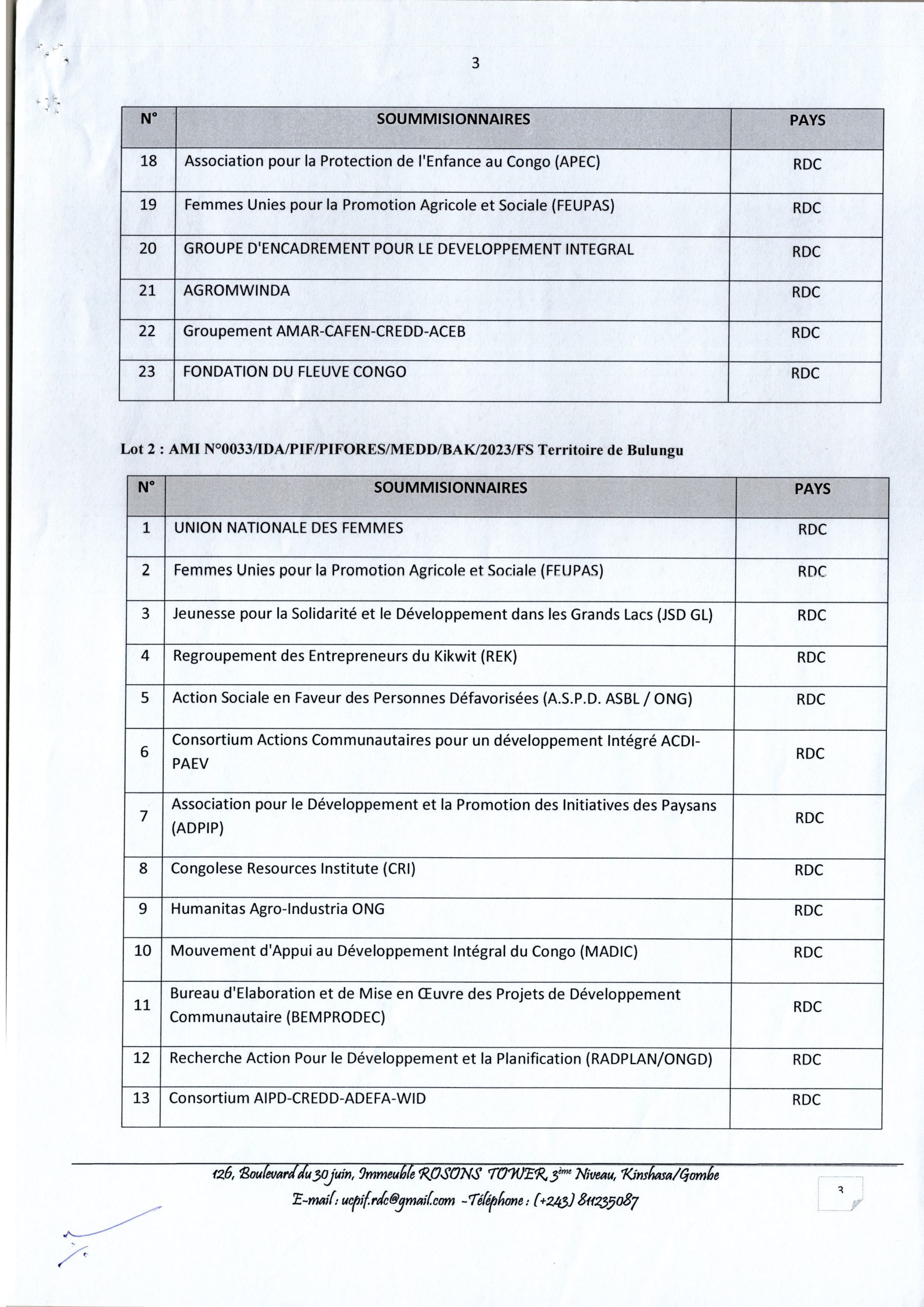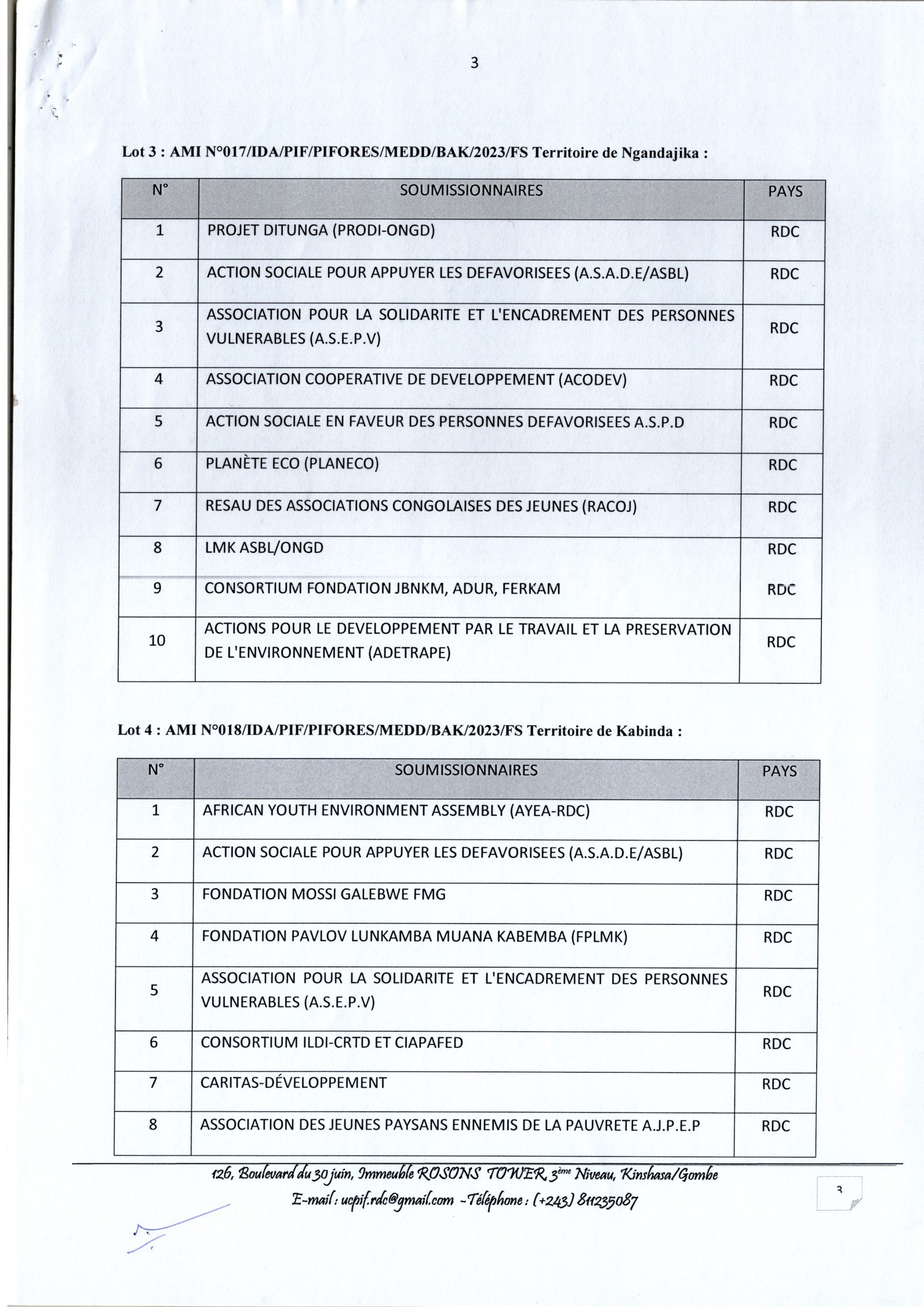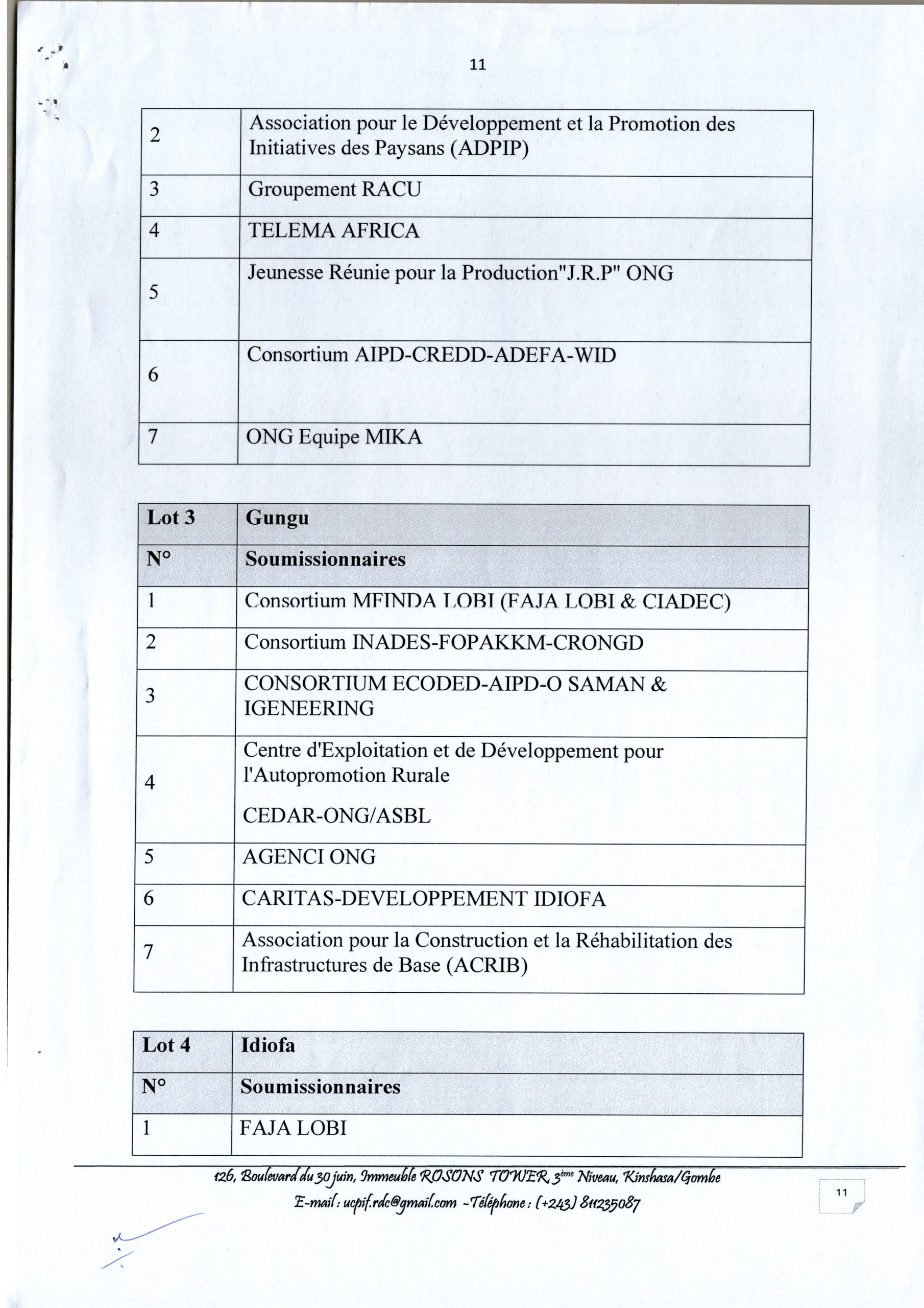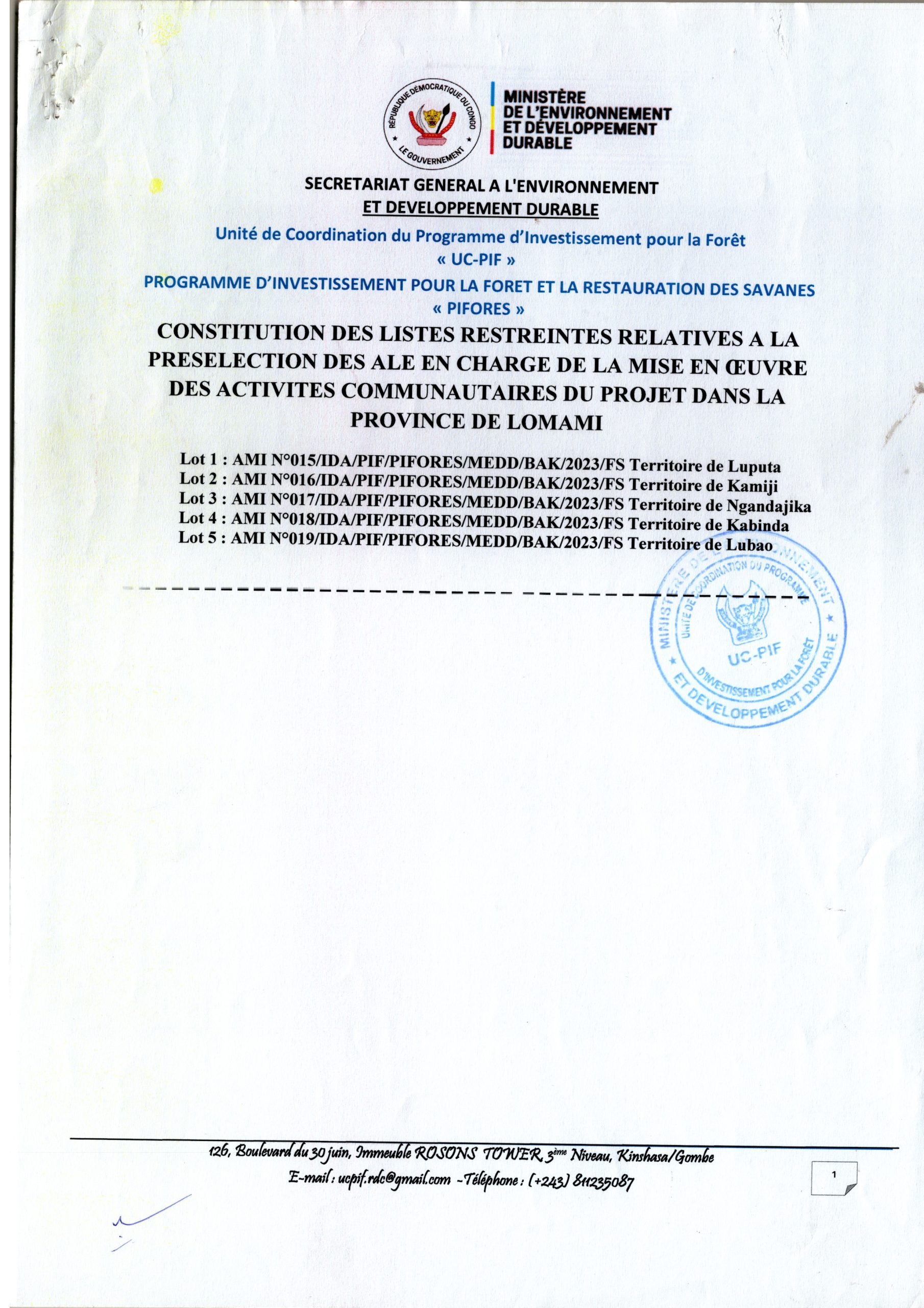 Liste restreinte des agences locales d’exécution en charge de la mise en œuvre des activités communautaires du projet dans la province de Lomami