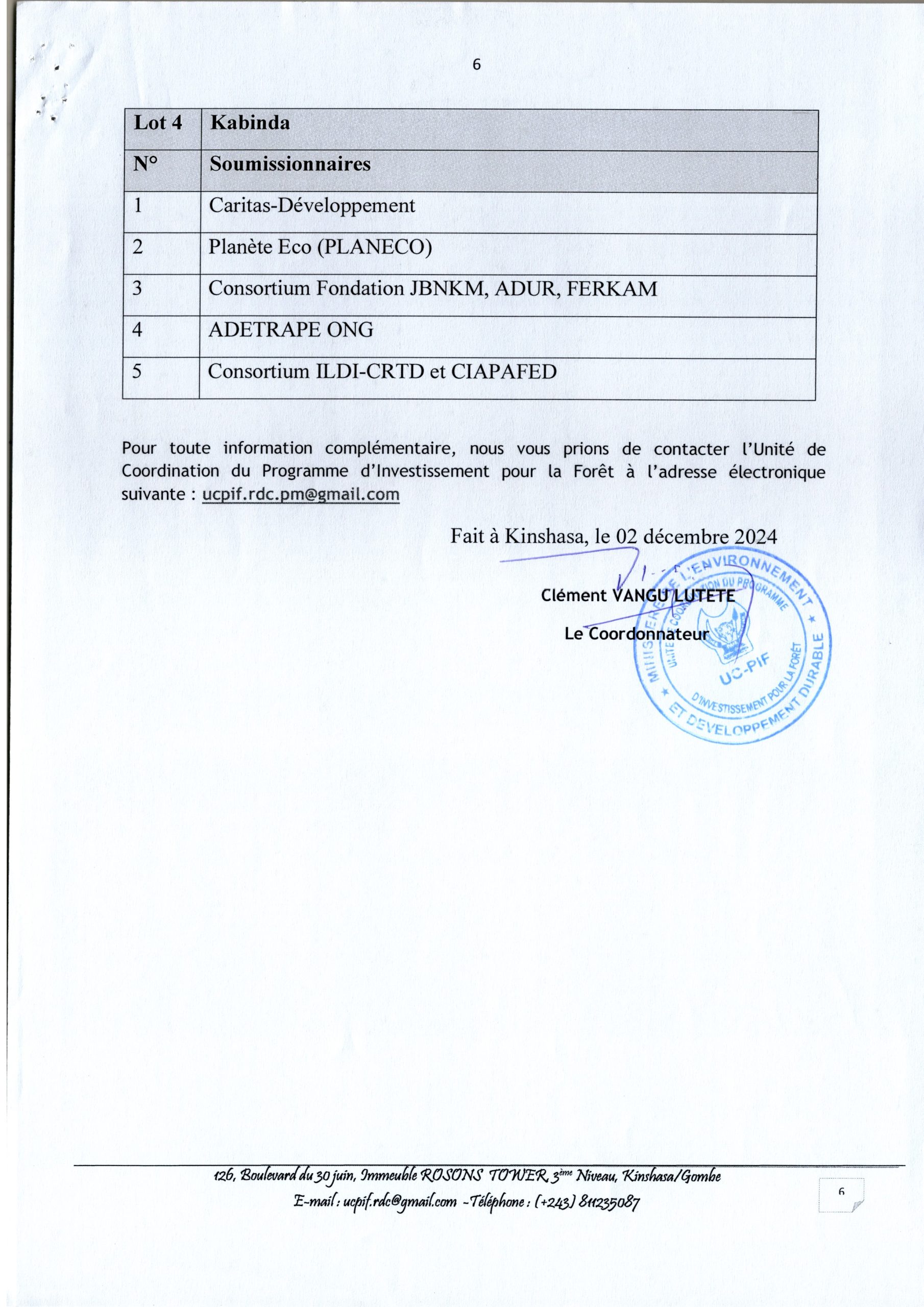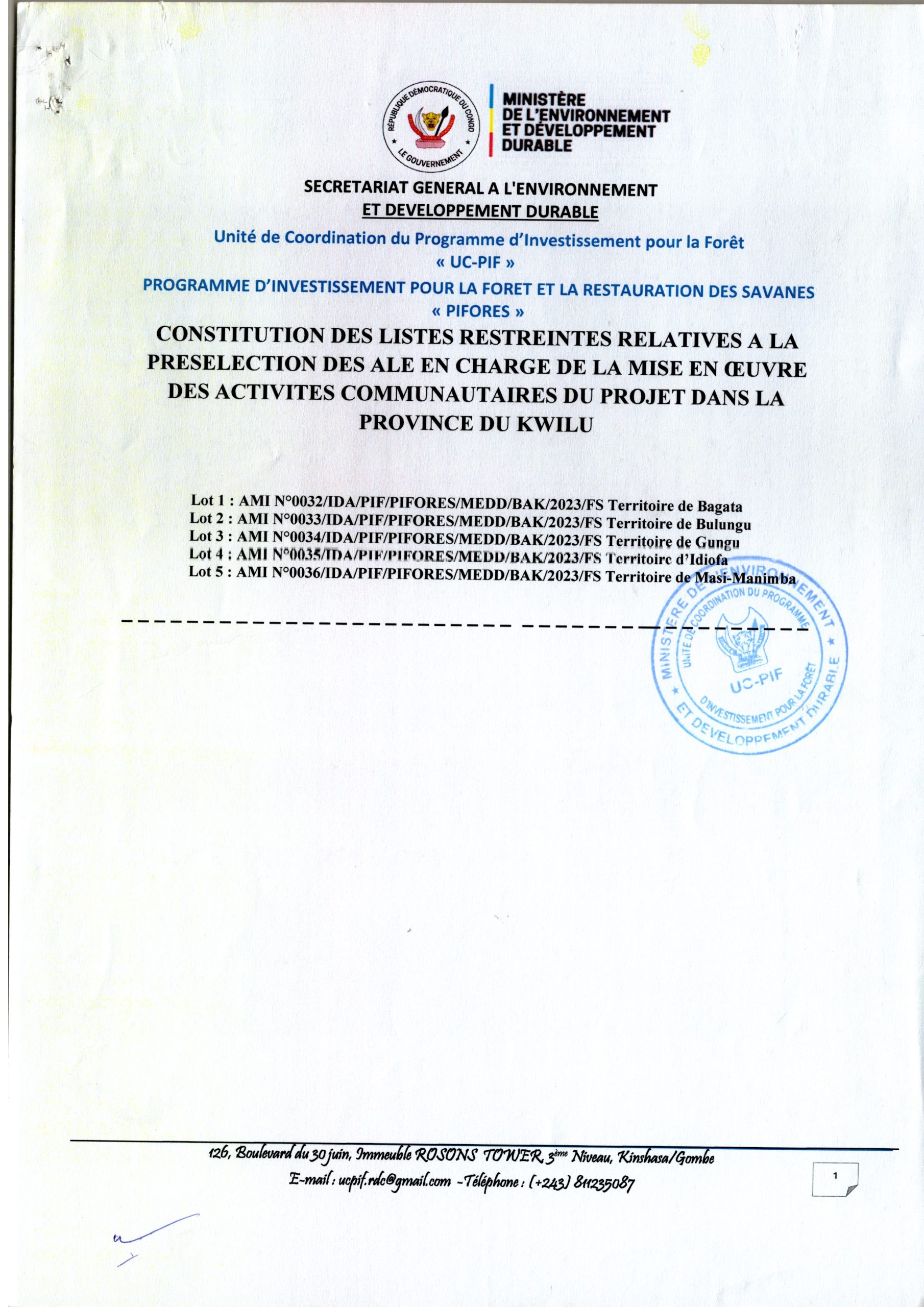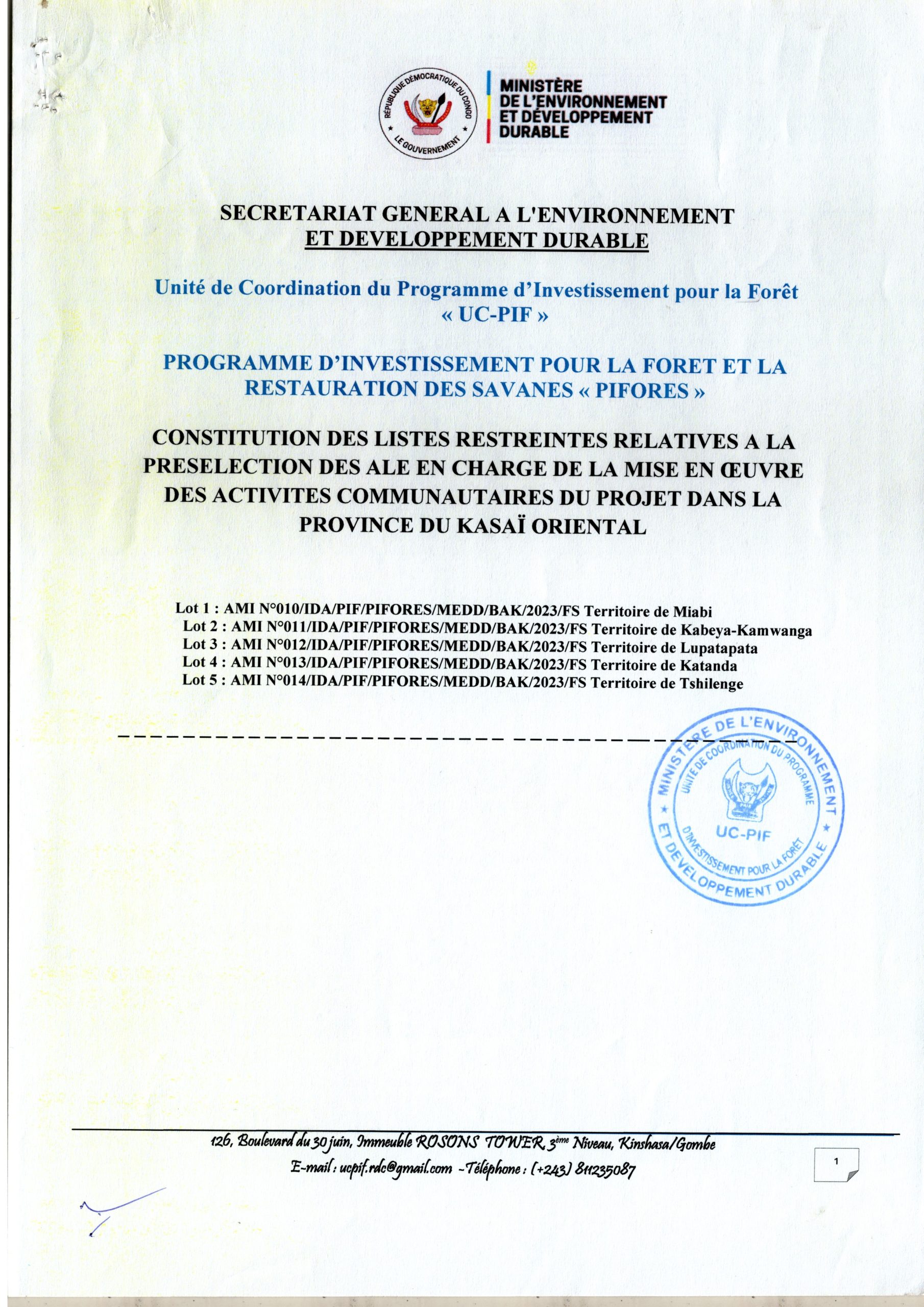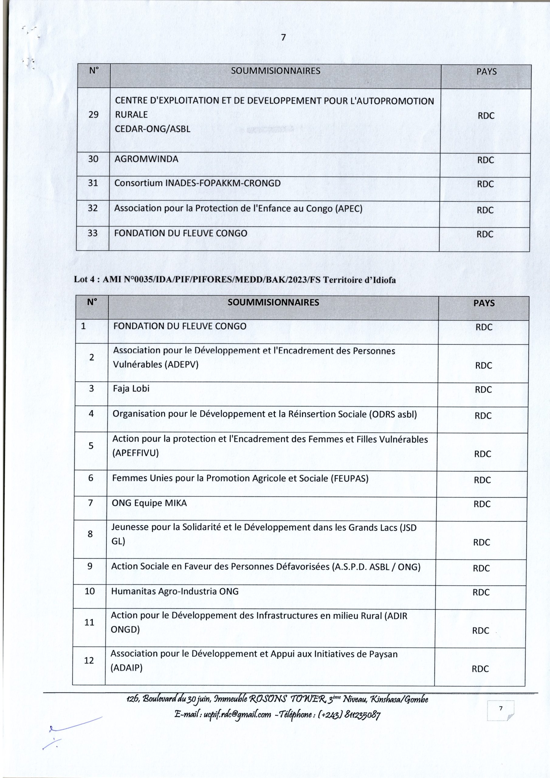 Liste restreinte des agences locales d’exécution en charge de la mise en œuvre des activités communautaires du projet dans la province de Lomami