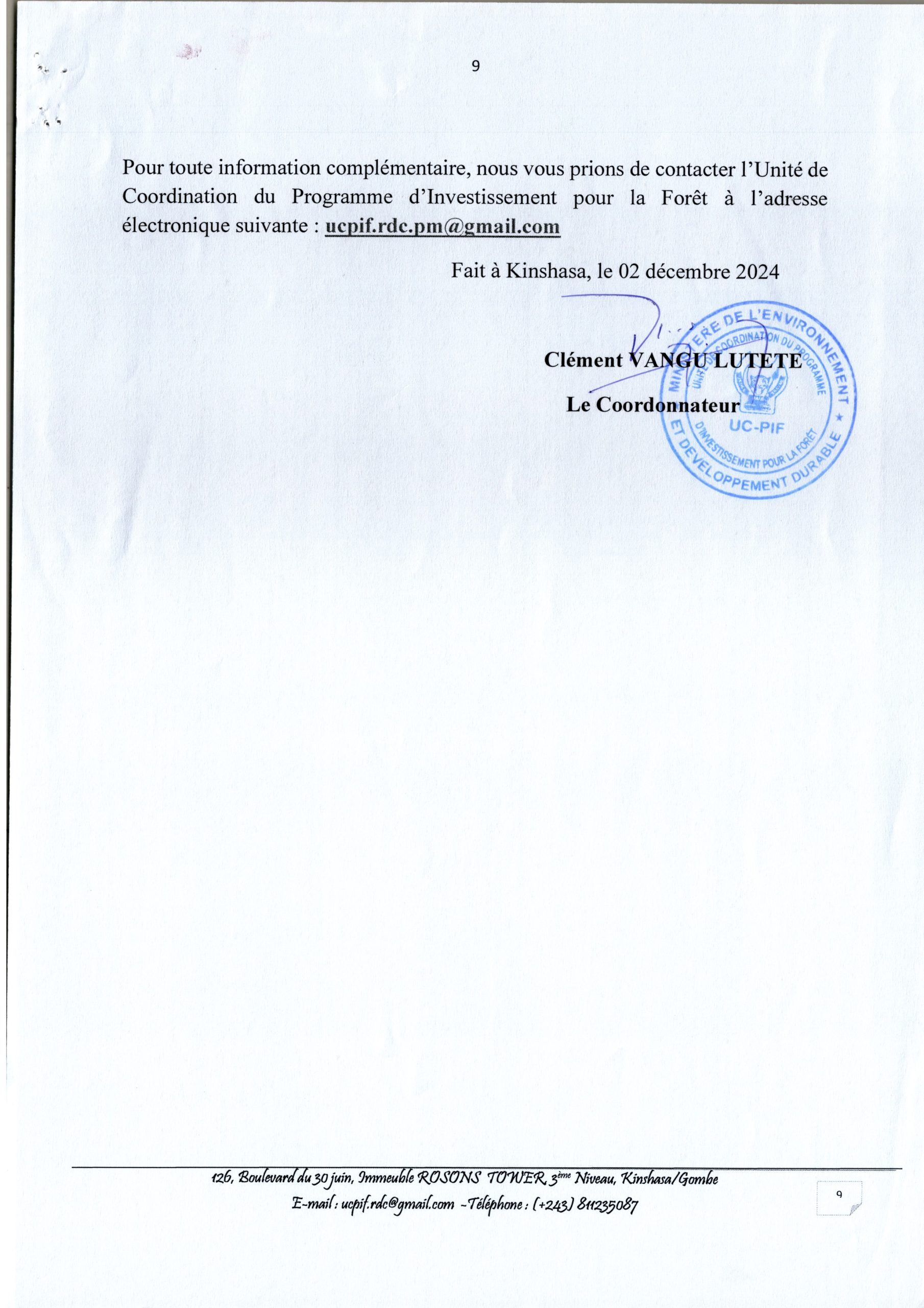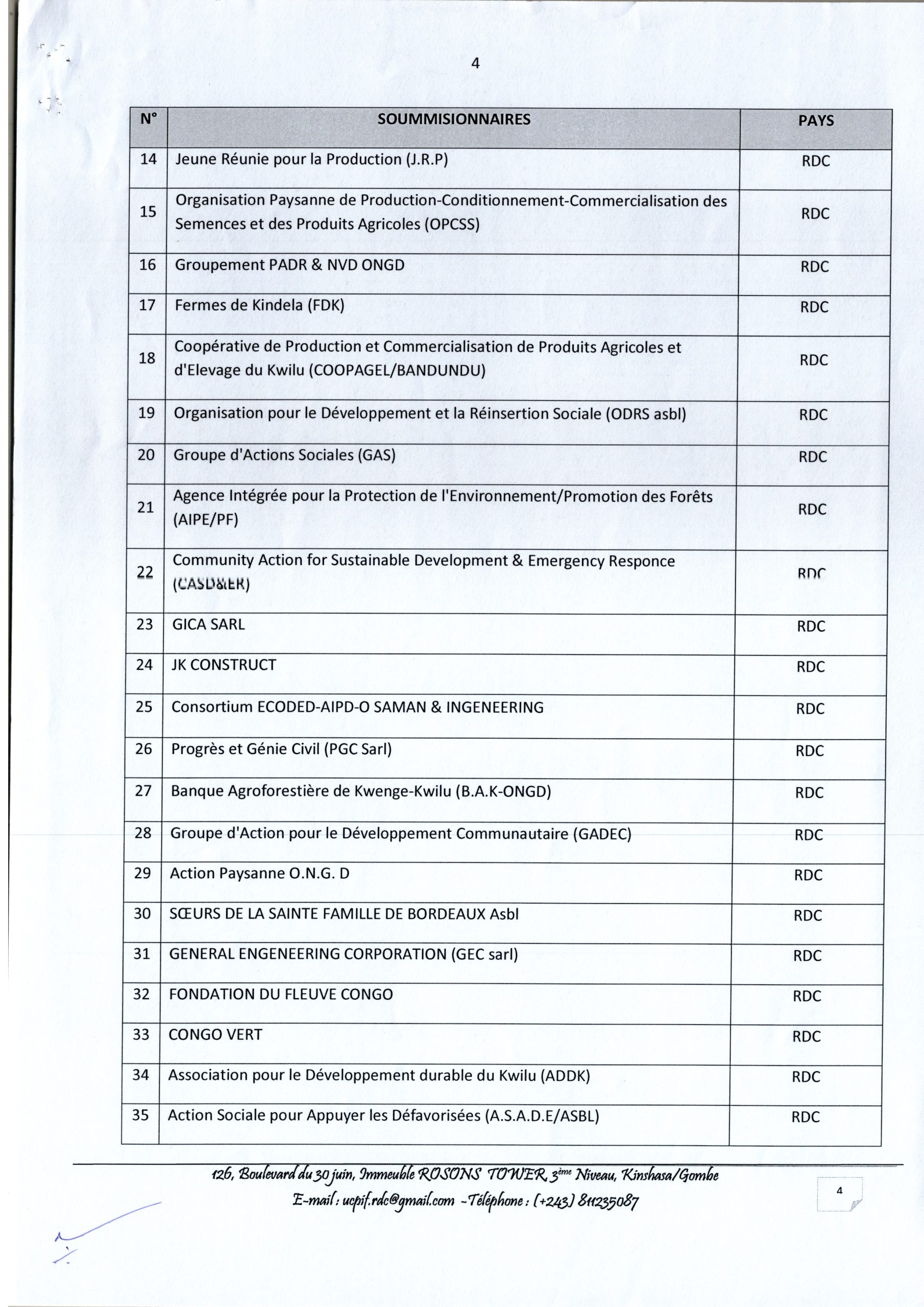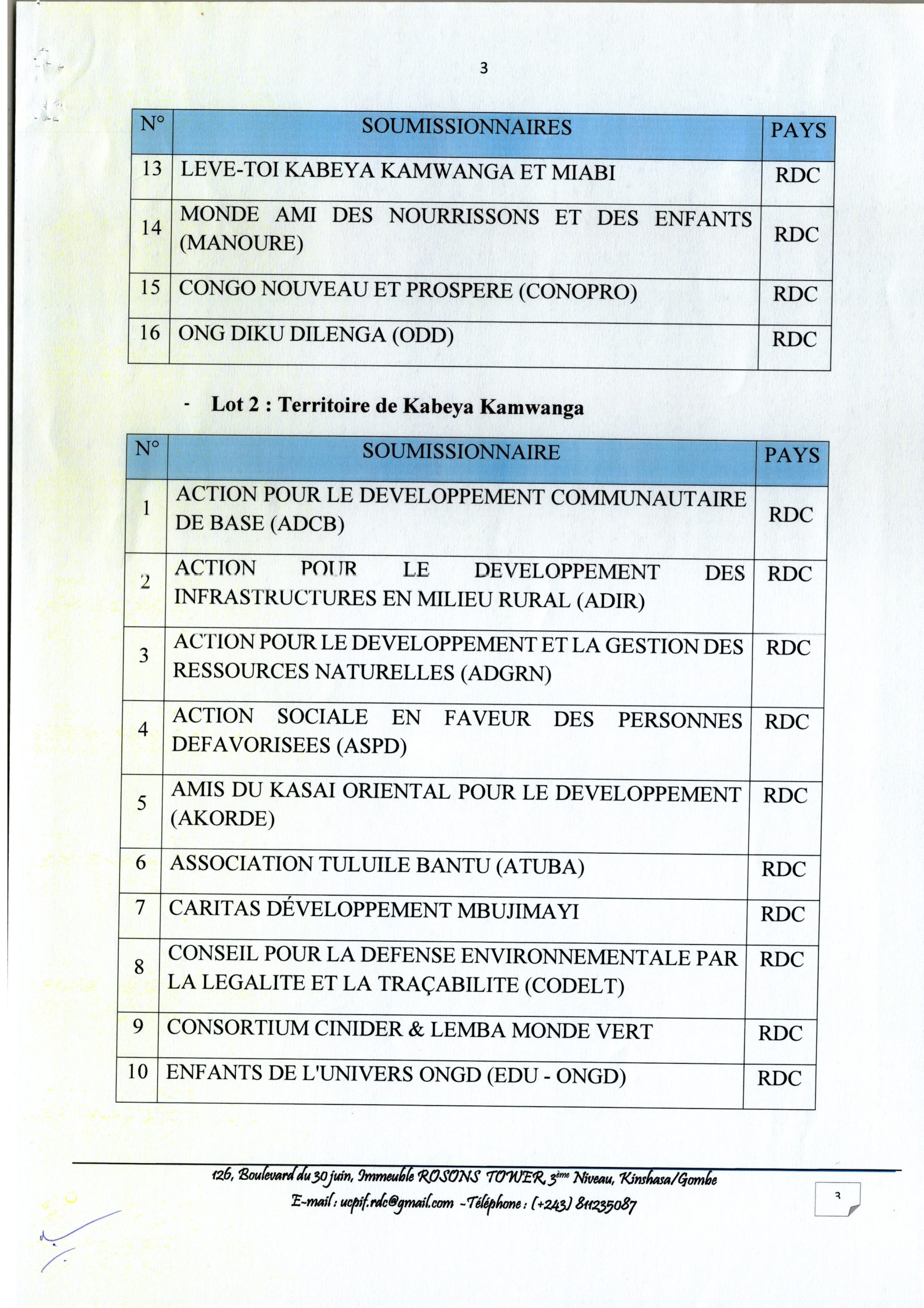 Liste restreinte des agences locales d’exécution en charge de la mise en œuvre des activités communautaires du projet dans la province du Kwilu.