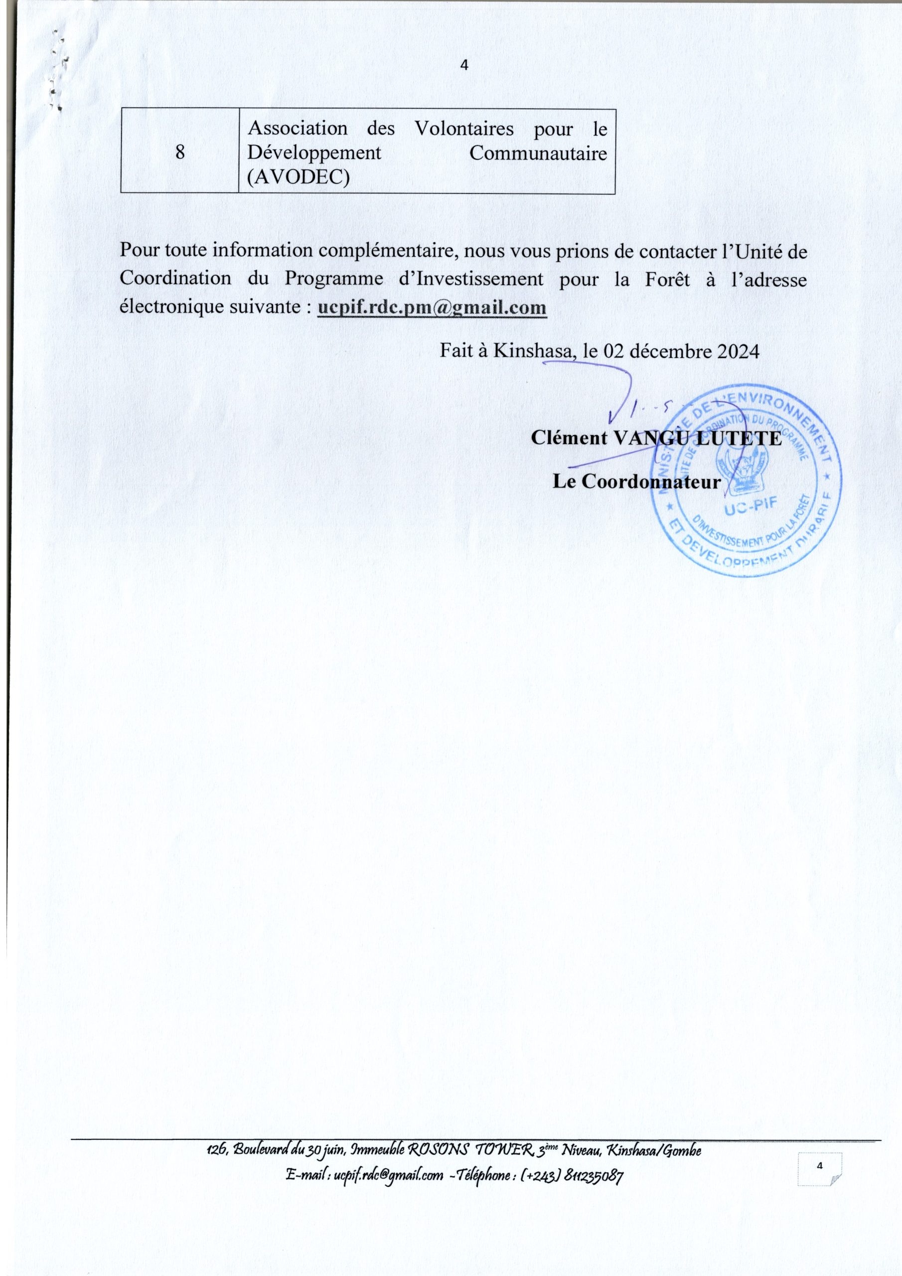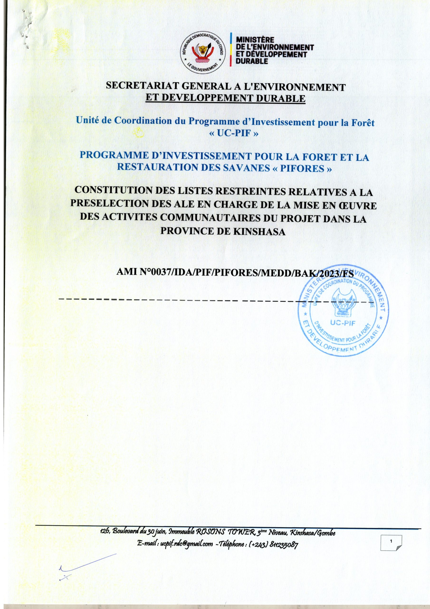 Liste restreinte des agences locales d’exécution en charge de la mise en œuvre des activités communautaires du projet dans la province de Kinshasa