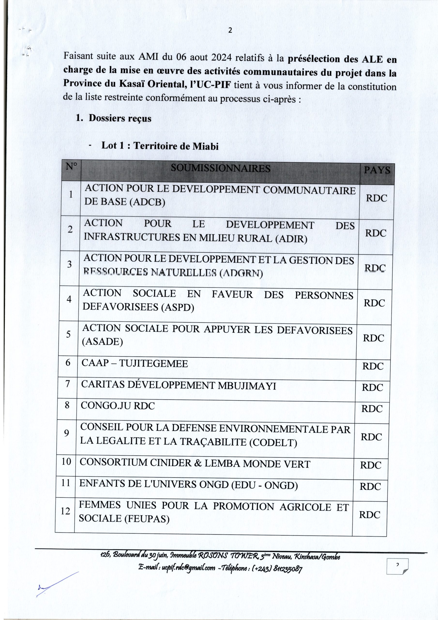 Liste restreinte des agences locales d’exécution en charge de la mise en œuvre des activités communautaires du projet dans la province de Kasaï-Oriental