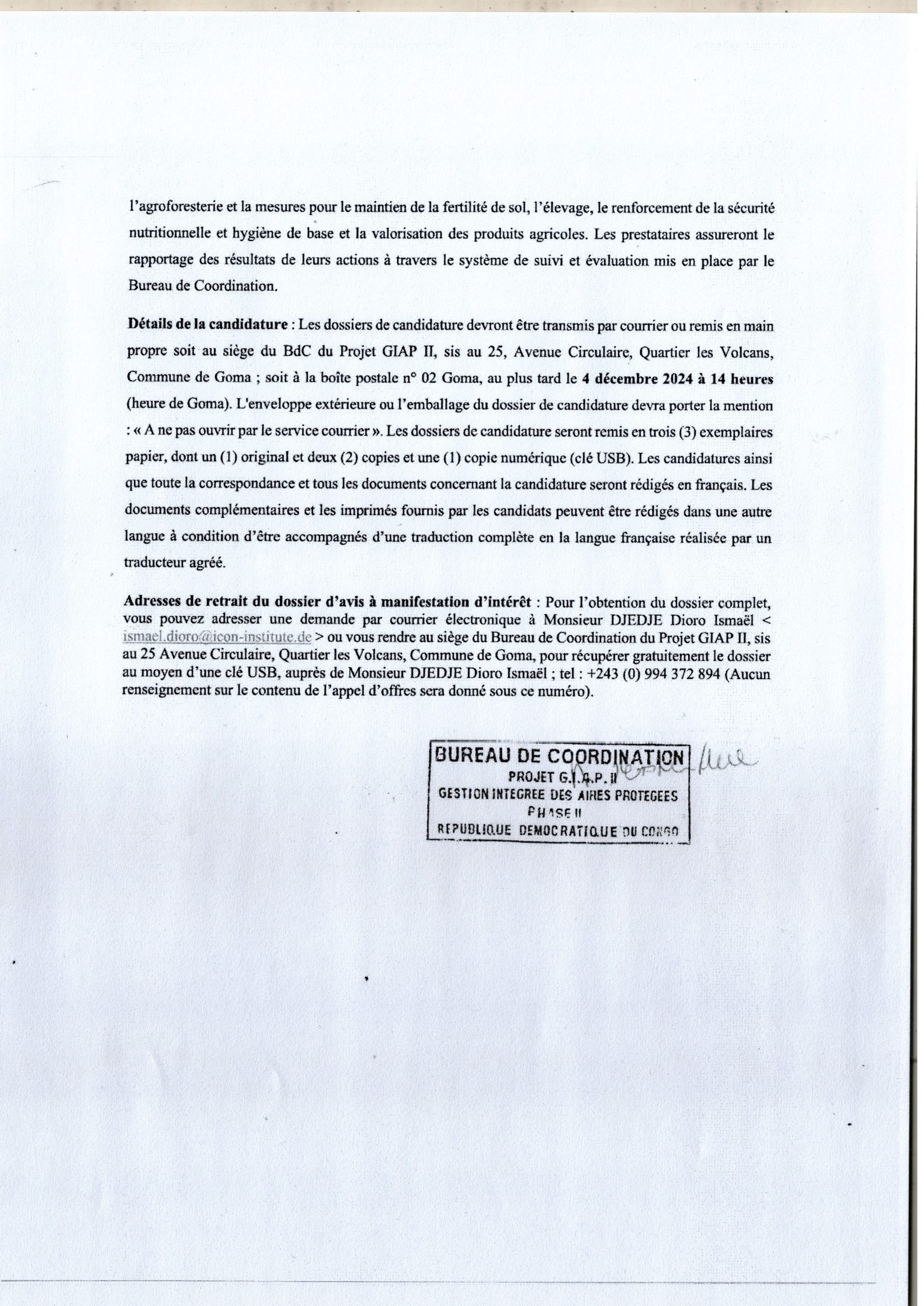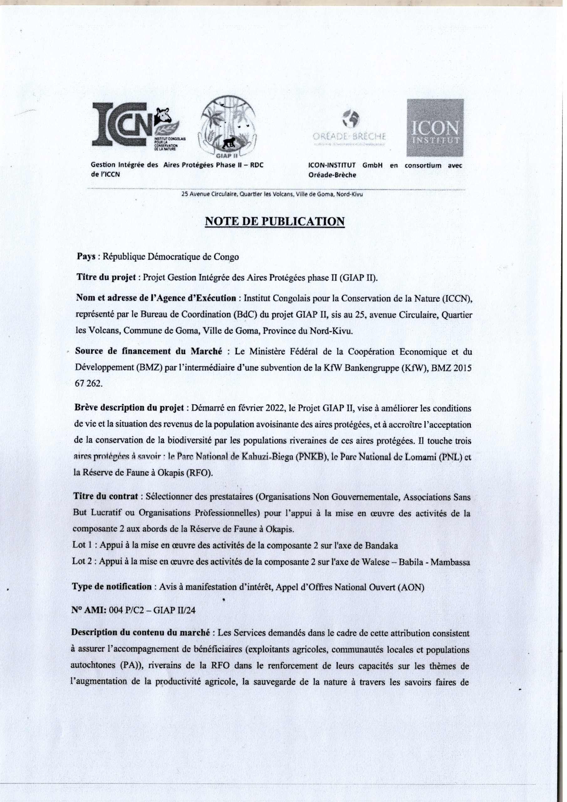 Recrutement des prestataires (Organisations Non Gouvernementales, Associations Sans But lucratif ou Organisation Professionnelles) pour l’appui à la mise en œuvre des activités de la composante 2 aux abords de la Reserve de Faune à Okapis