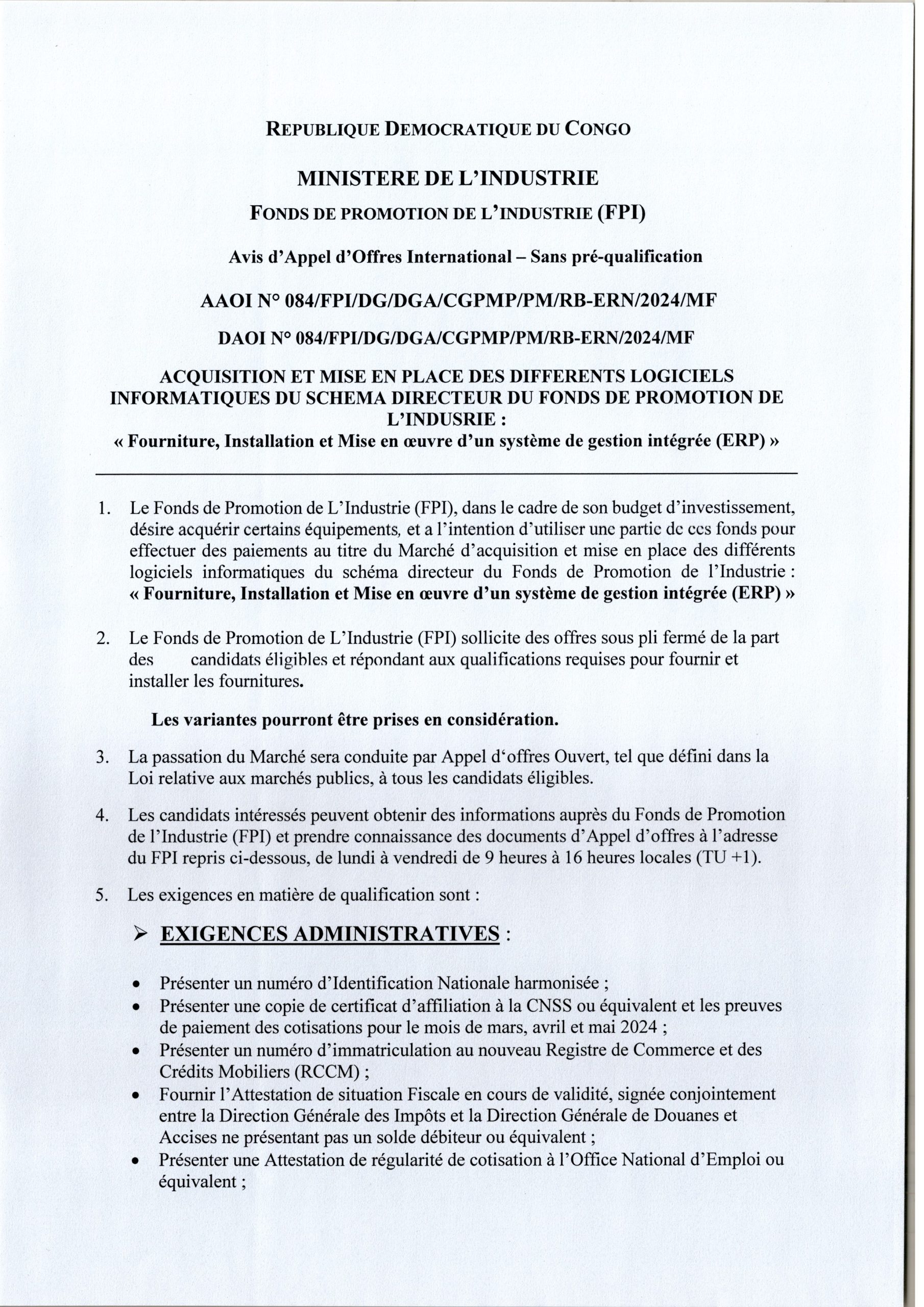 Avis d’appel d’offres International du Fonds de Promotion de l’Industrie (FPI) relatif à l’acquisition et mise en place des différents logiciels Informatiques du Schéma directeur du Fonds de Promotion de l’Industrie.