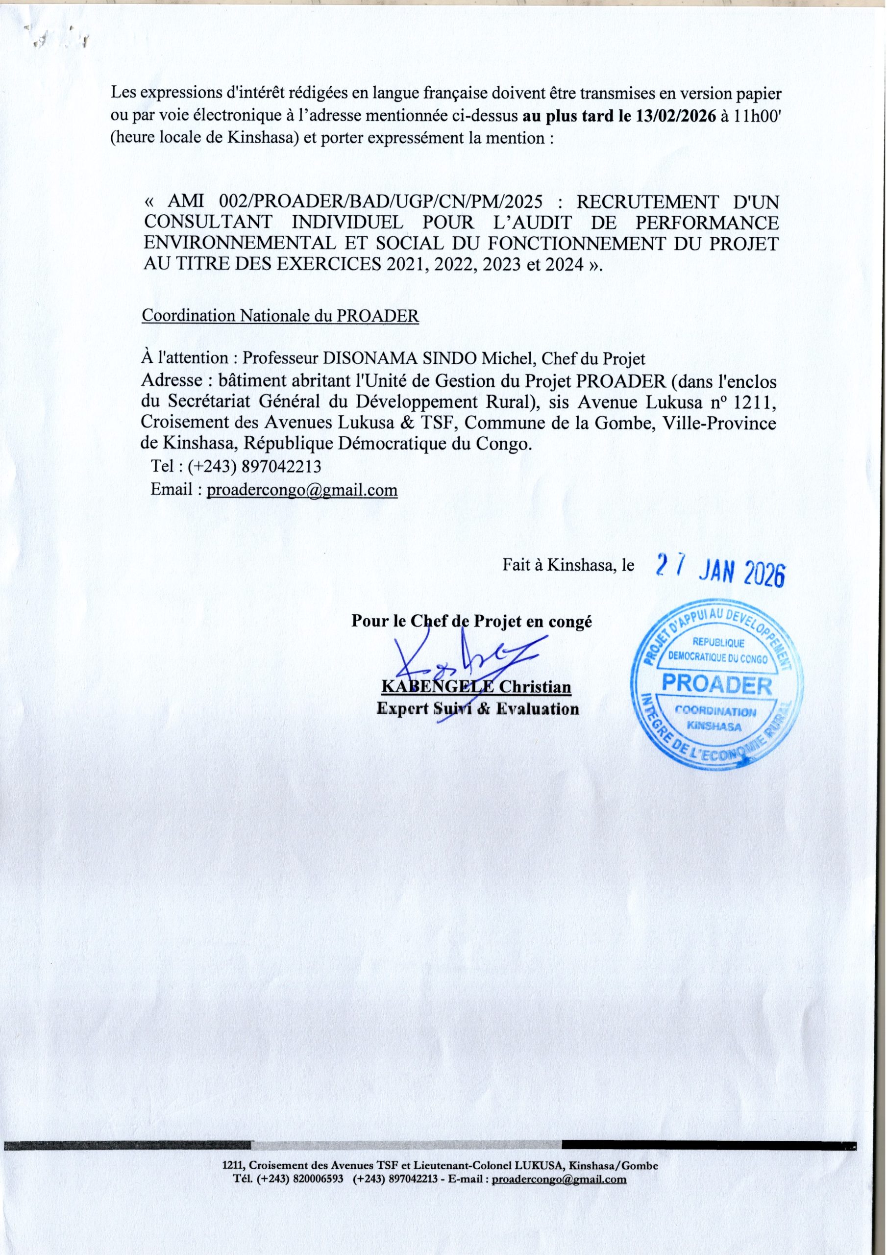 Recrutement d’un consultant individuel pour l’audit de performance environnemental et social du fonctionnement du projet au titre des exercices 2021,2022,2023 et 2024.