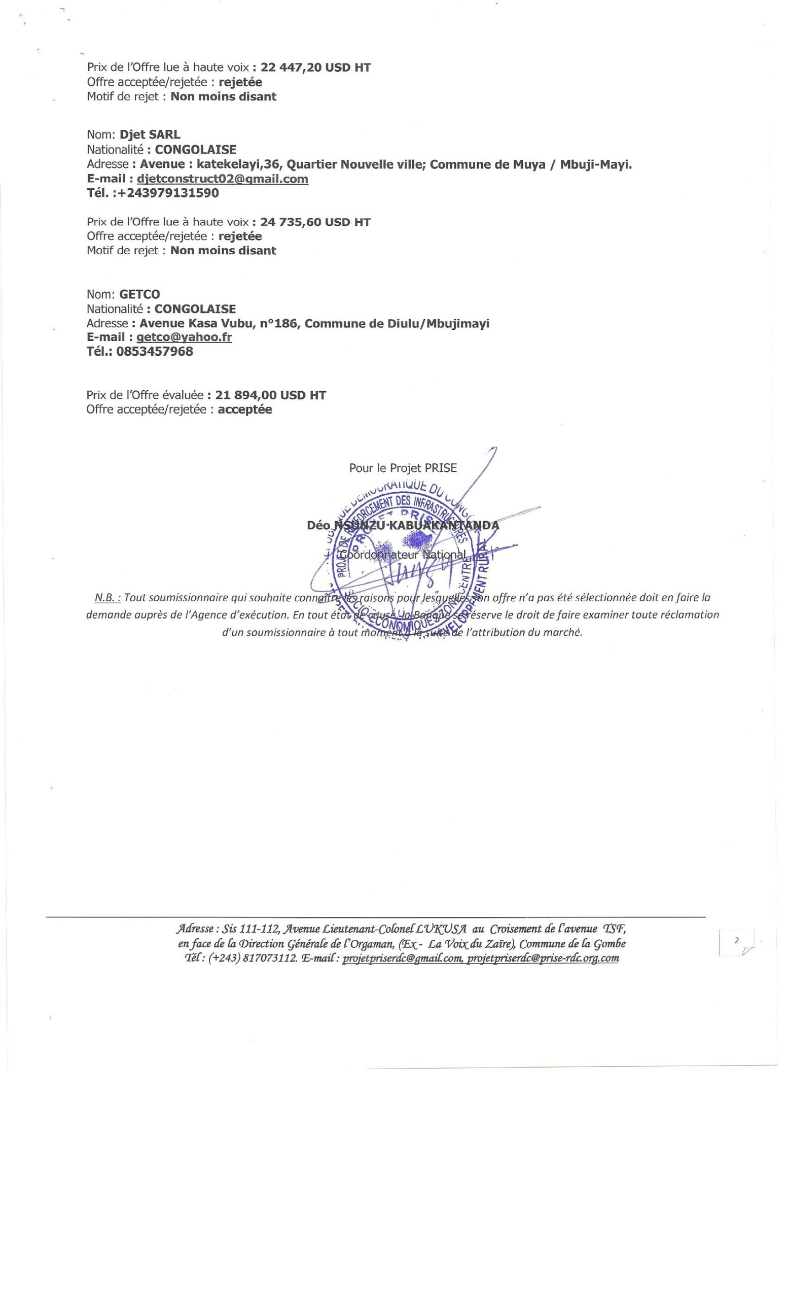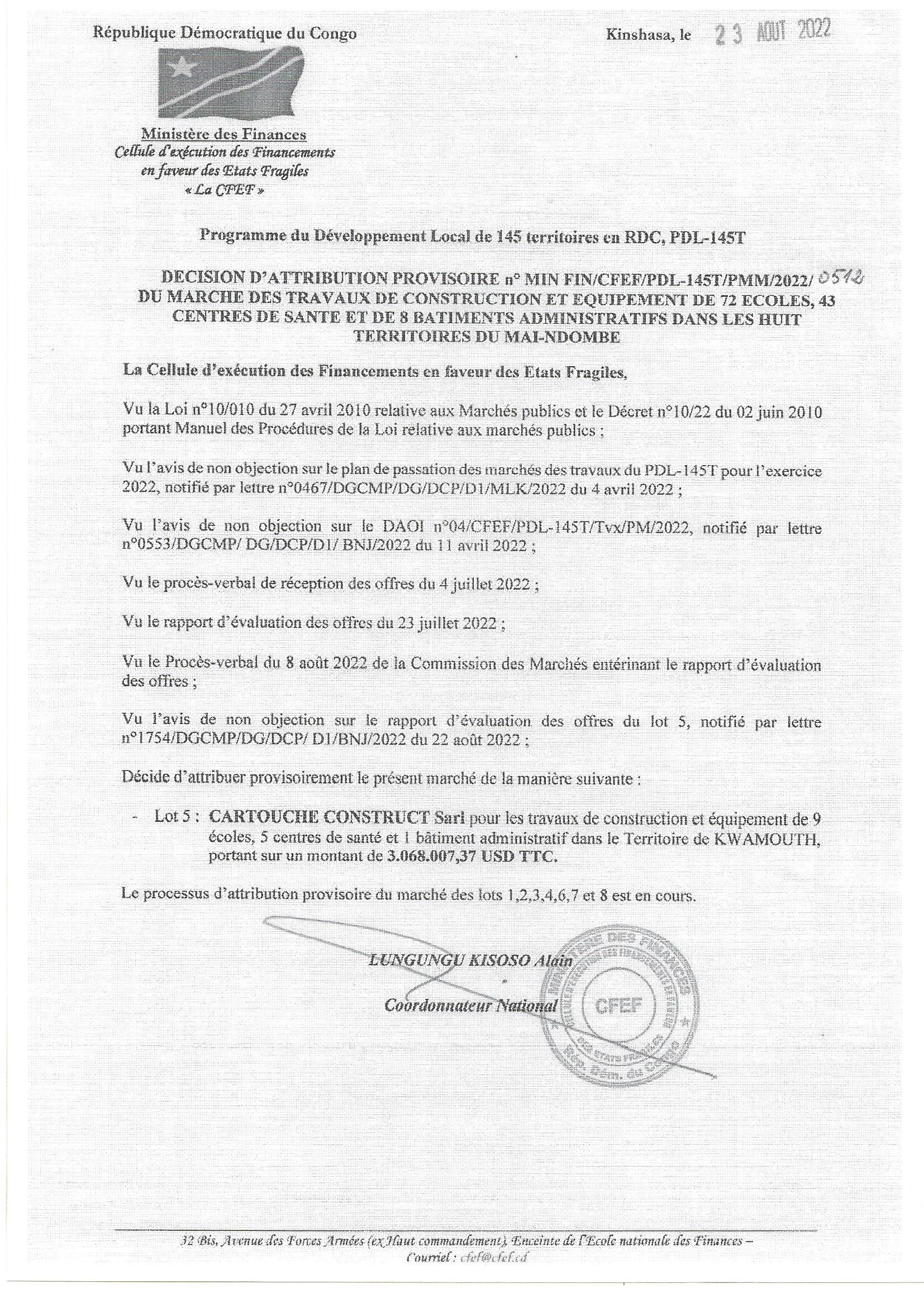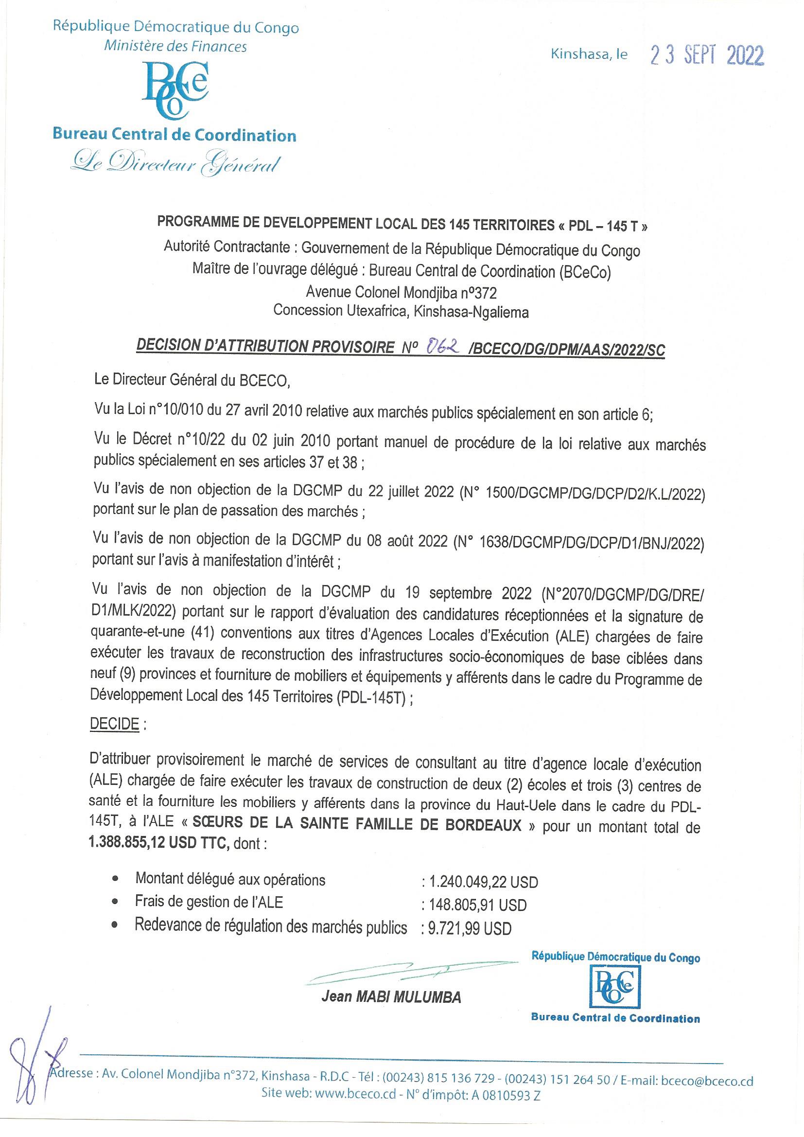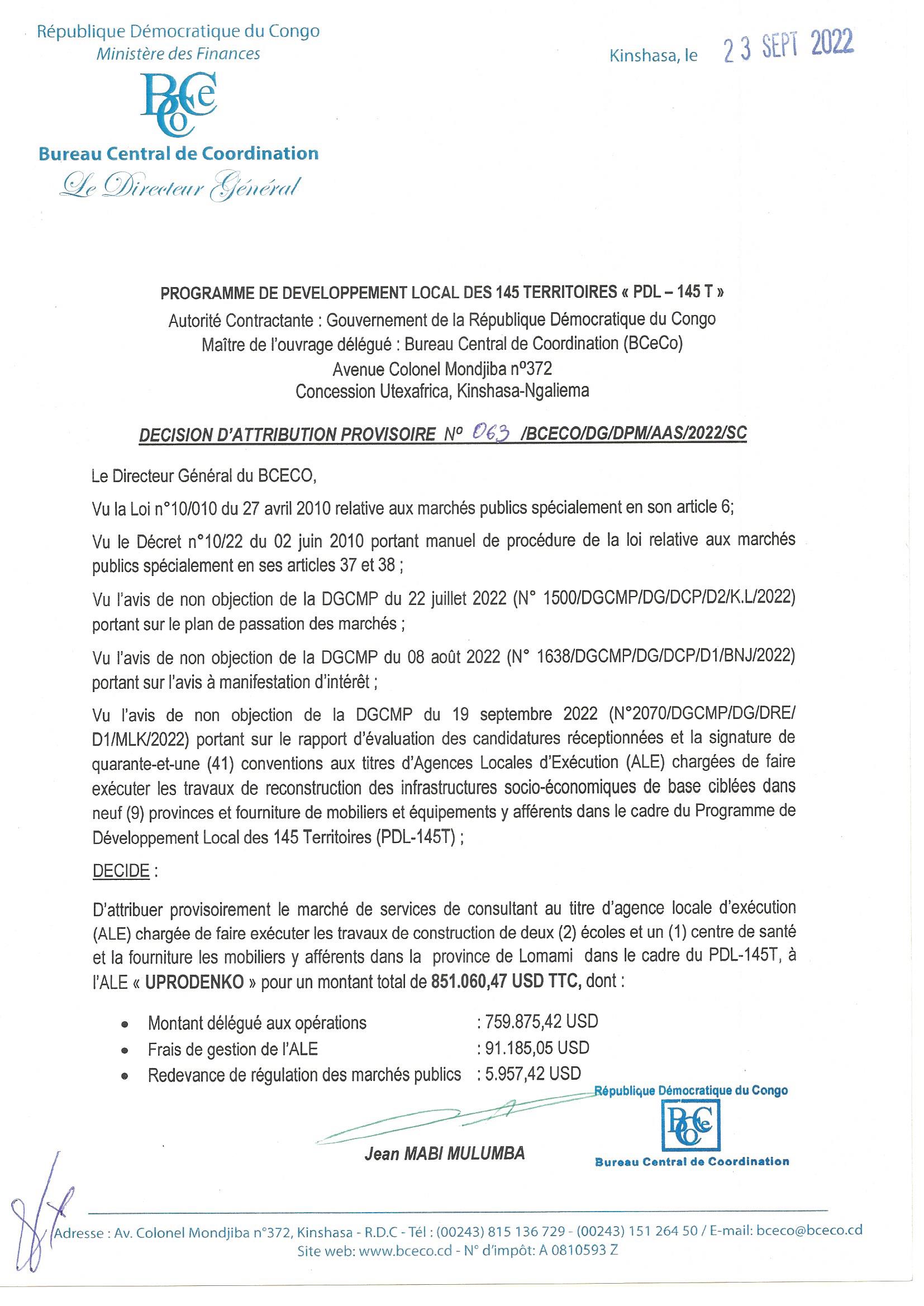 DECISION D’ATTRIBUTION PROVISOIRE ACCORDEE A ALE «UPRODENKO » RELATIVE AU SERVICES DE CONSULTANT AU TITRE D’AGENCE LOCALE D’EXECUTION (ALE) CHARGEE DE FAIRE EXECUTER LES TRAVAUX DE CONSTRUCTION DE DEUX (2) ECOLES ET UN (1) CENTRES DE SANTE ET LA FOURNITURE…