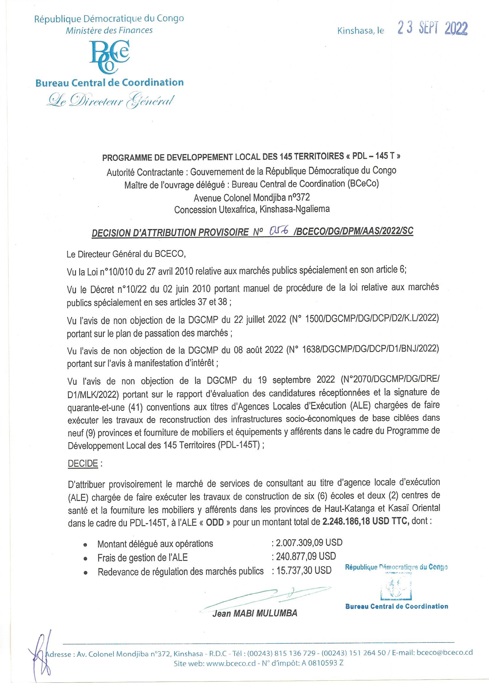 ATTRIBUTION PROVISOIRE ACCORDEE A L’ALE “ODD” LE MARCHE RELATIF AUX TRAVAUX DE CONSTRUCTION DE 6 ECOLES ET 2 CENTRES DE SANTE ET LA FOURNITURE DES MOBILIERS Y AFFERENTS DANS LES PROVINCES DU HAUT-KATANGA ET KASAI ORIENTAL.
