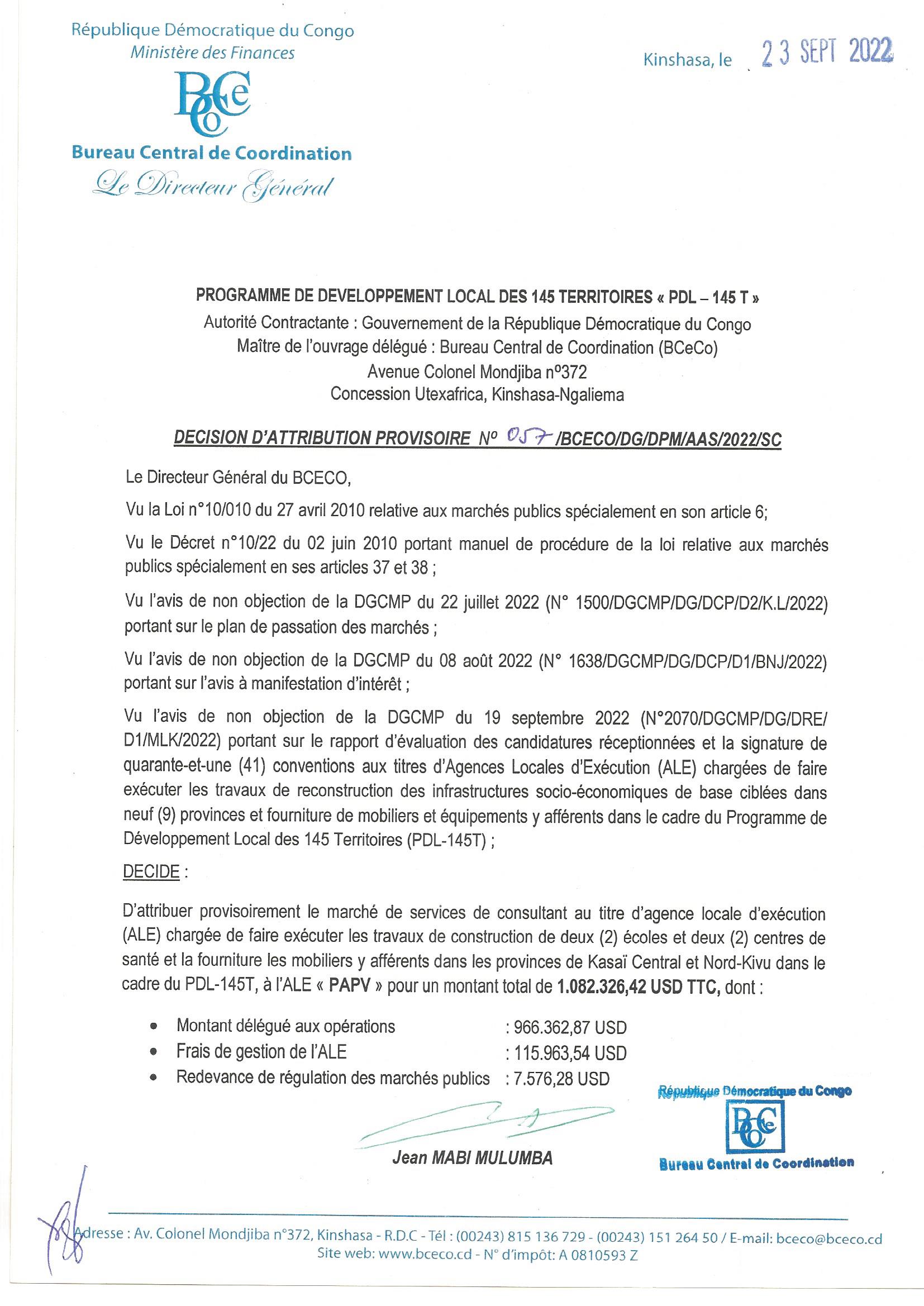 ATTRIBUTION PROVISOIRE ACCORDEE A L’ALE “PAPV” LE MARCHE RELATIF AUX TRAVAUX DE CONSTRUCTION DE 2 ECOLES ET 2 CENTRES DE SANTE ET LA FOURNITURE DES MOBILIERS Y AFFERENTS DANS LES PROVINCES DU KASAI CENTRAL ET NORD-KIVU.