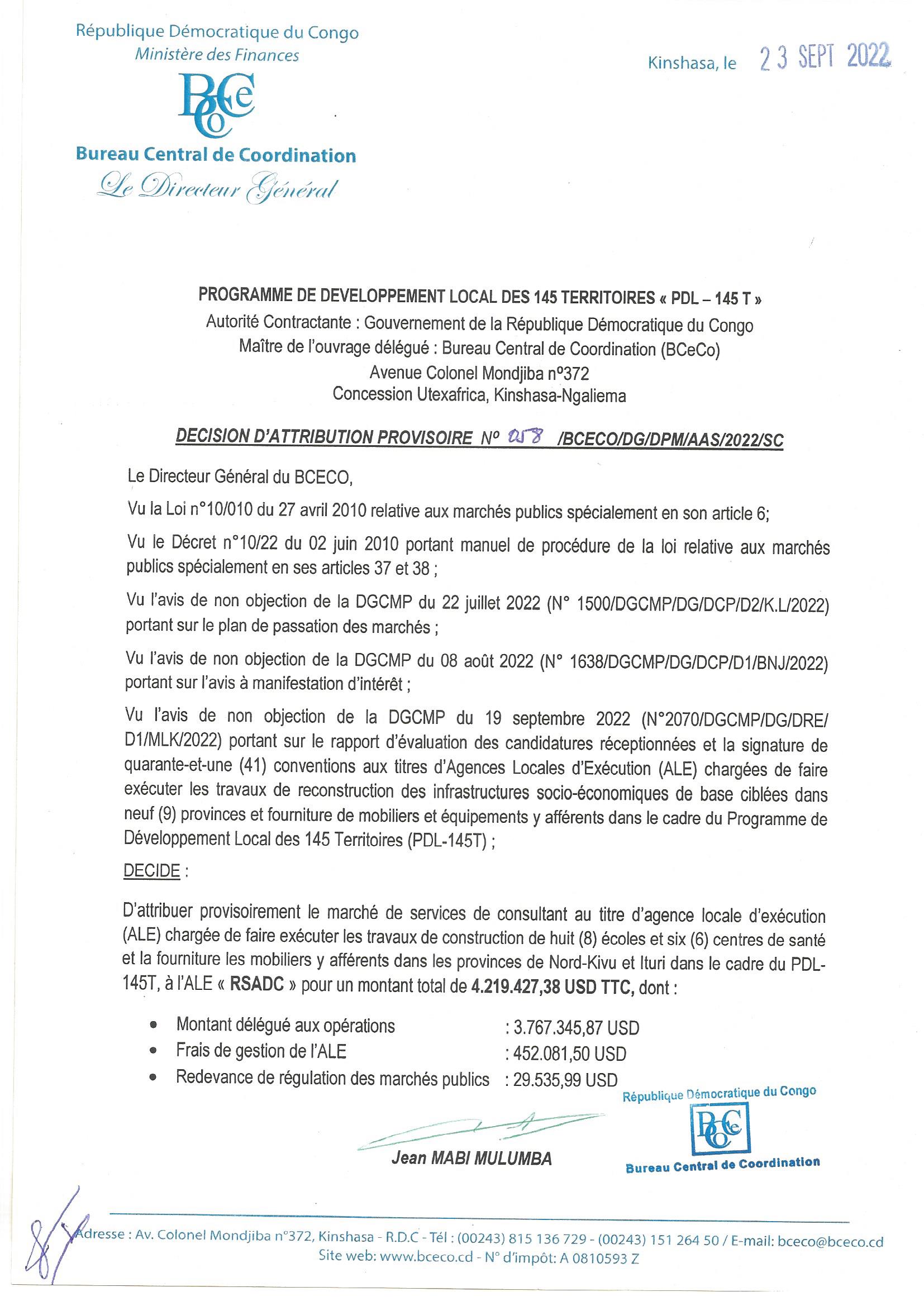 ATTRIBUTION PROVISOIRE ACCORDEE A L’ALE “RSADC” LE MARCHE RELATIF AUX TRAVAUX DE CONSTRUCTION DE 8 ECOLES ET 6 CENTRES DE SANTE ET LA FOURNITURE DES MOBILIERS Y AFFERENTS DANS LES PROVINCES DU NORD-KIVU ET ITURI.