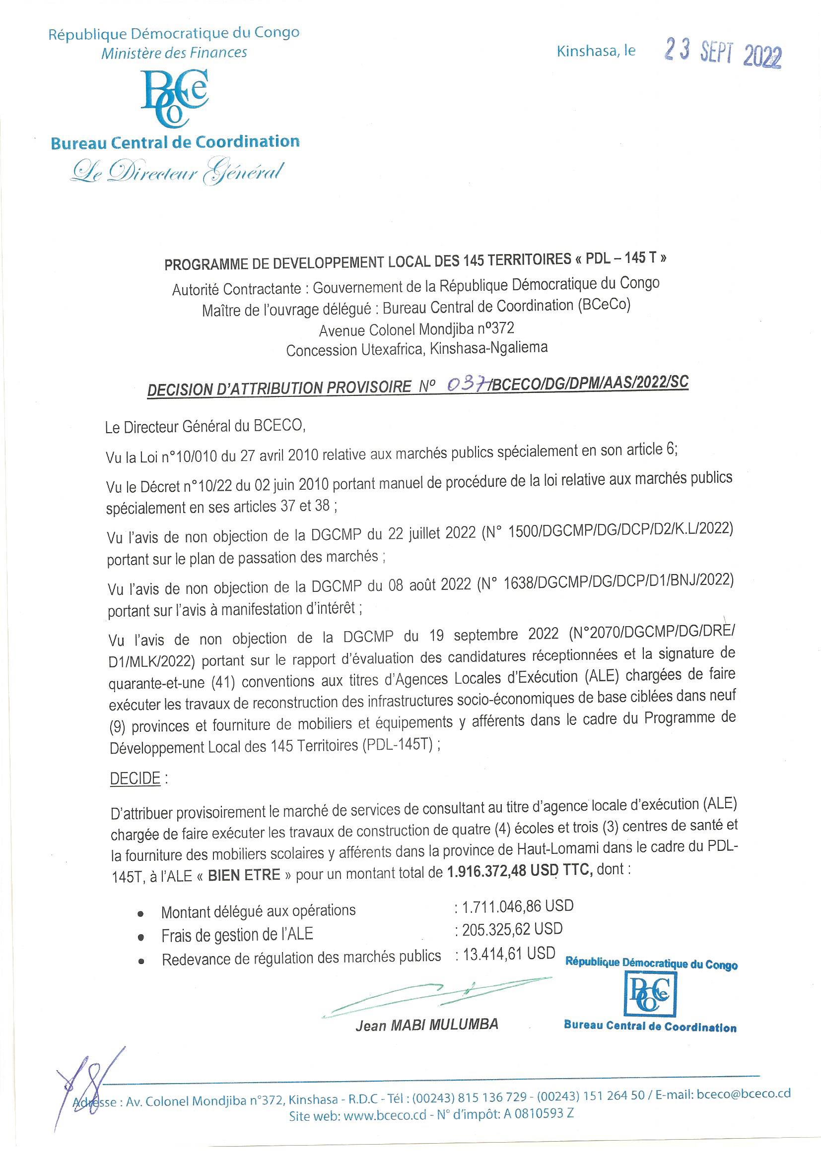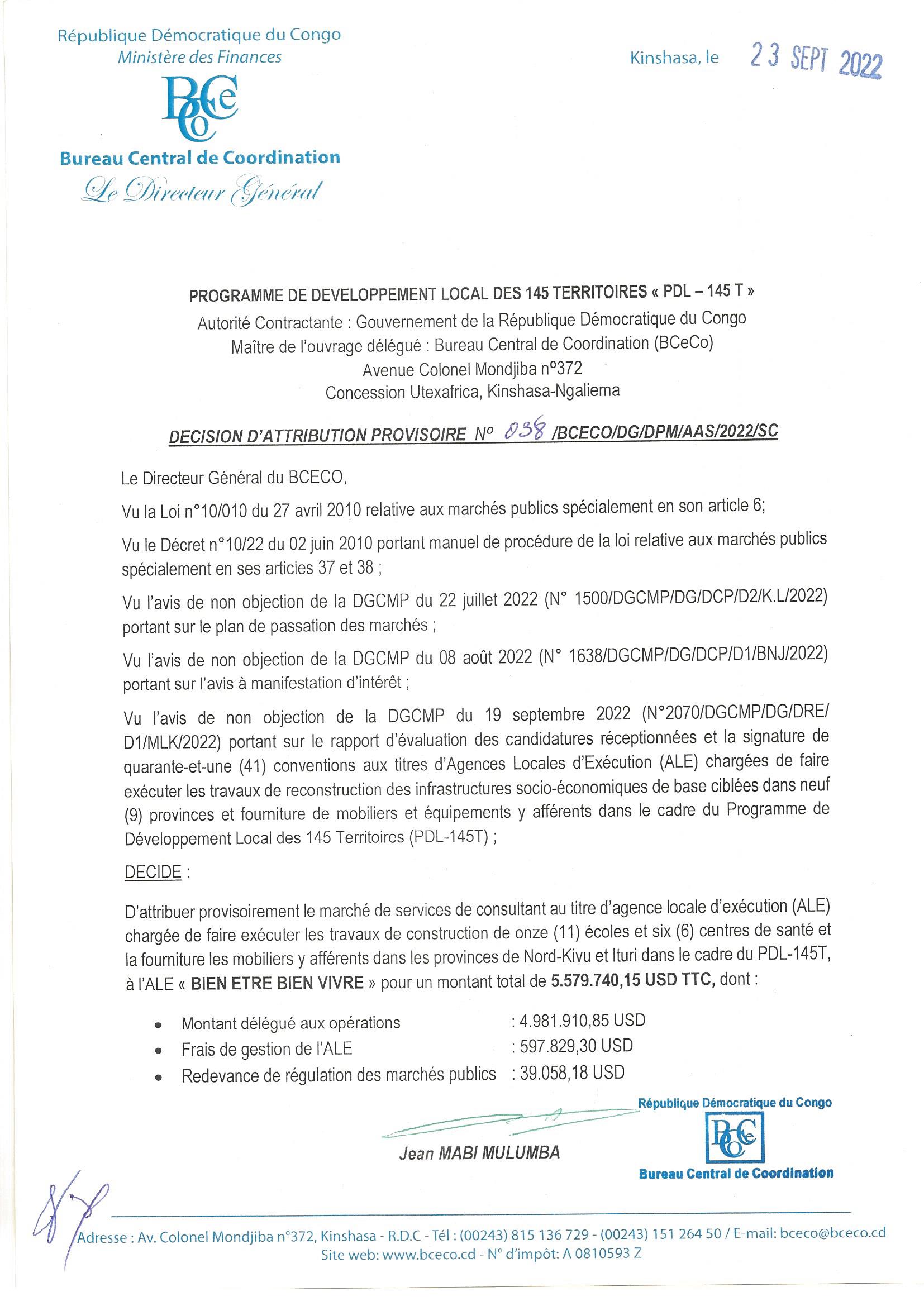 ATTRIBUTION PROVISOIRE ACCORDEE A ALE « BIEN ETRE BIEN VIVRE » RELATIVE AU SERVICES DE CONSULTANT AU TITRE D’AGENCE LOCALE D’EXECUTION (ALE) CHARGEE DE FAIRE EXECUTER LES TRAVAUX DE CONSTRUCTION DE ONZE (11) ECOLES ET SIX (6) CENTRES DE SANTE.