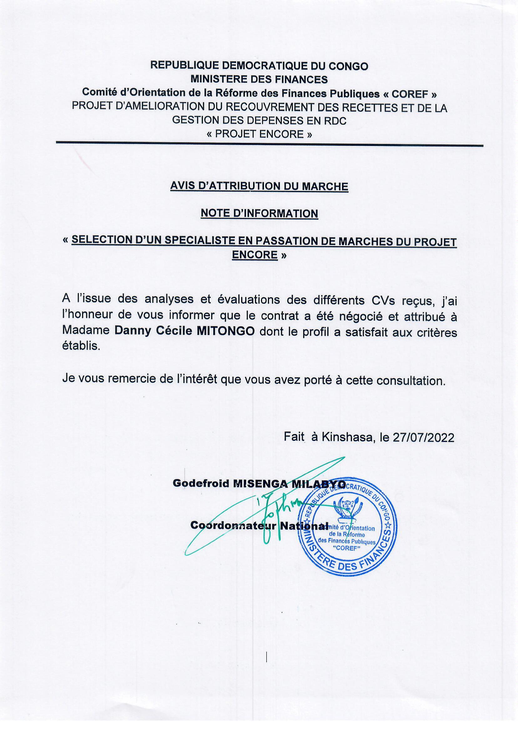 Attribution du marché pour la sélection d’un spécialiste en passation de marchés du projet encore à madame Danny Cécile MITONGO