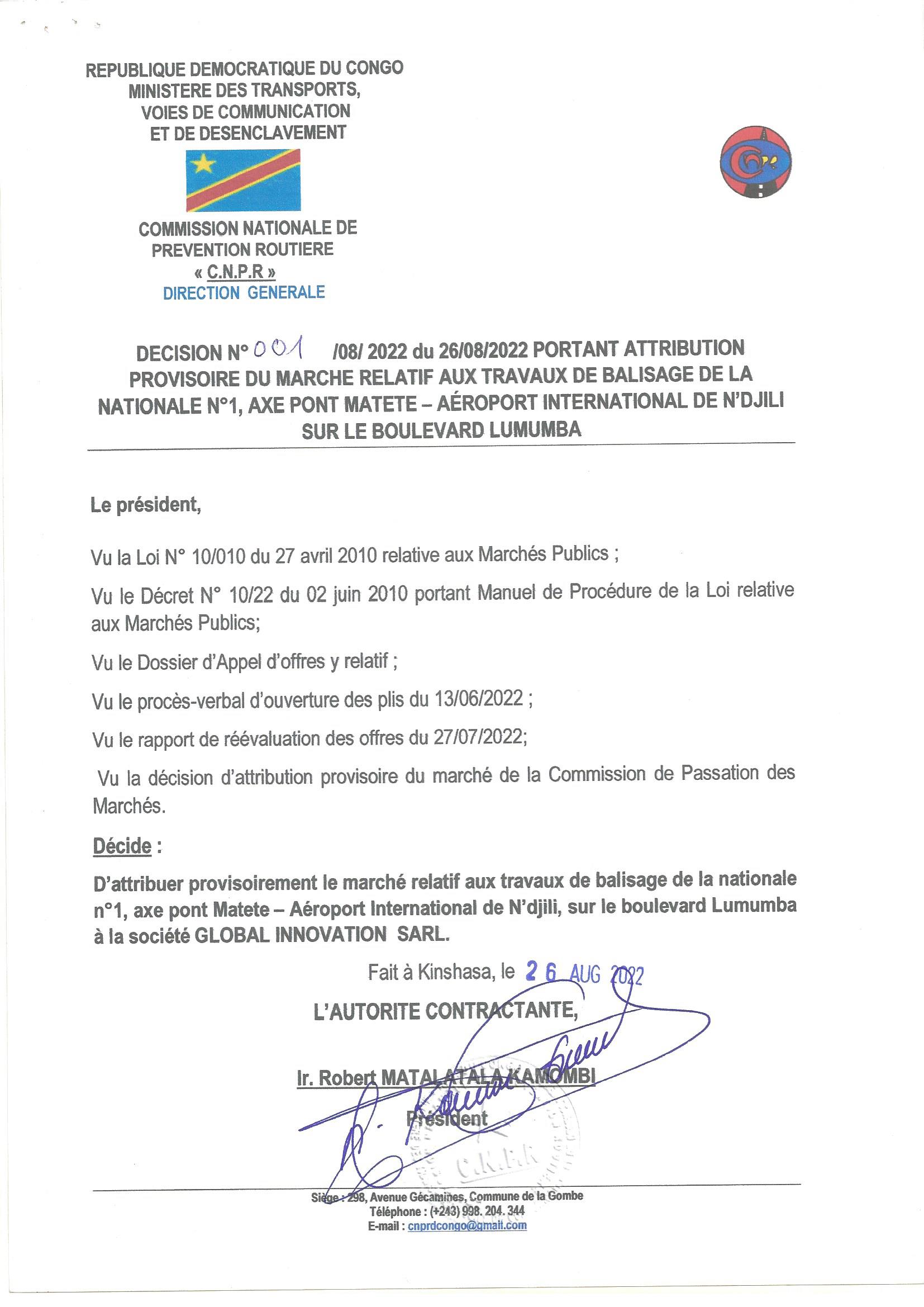 ATTRIBUTION PROVISOIRE ACCORDEE A LA SOCIETE GLOBAL INNOVATION Sarl RELATIVE AU MARCHE DES TRAVAUX DE BALLISAGE DE LA NATIONALE N°1, AXE PONT MATETE -AEROPORT INTERNATIONAL DE NDJILI, SUR LE BOULEVARD LUMUMBA .