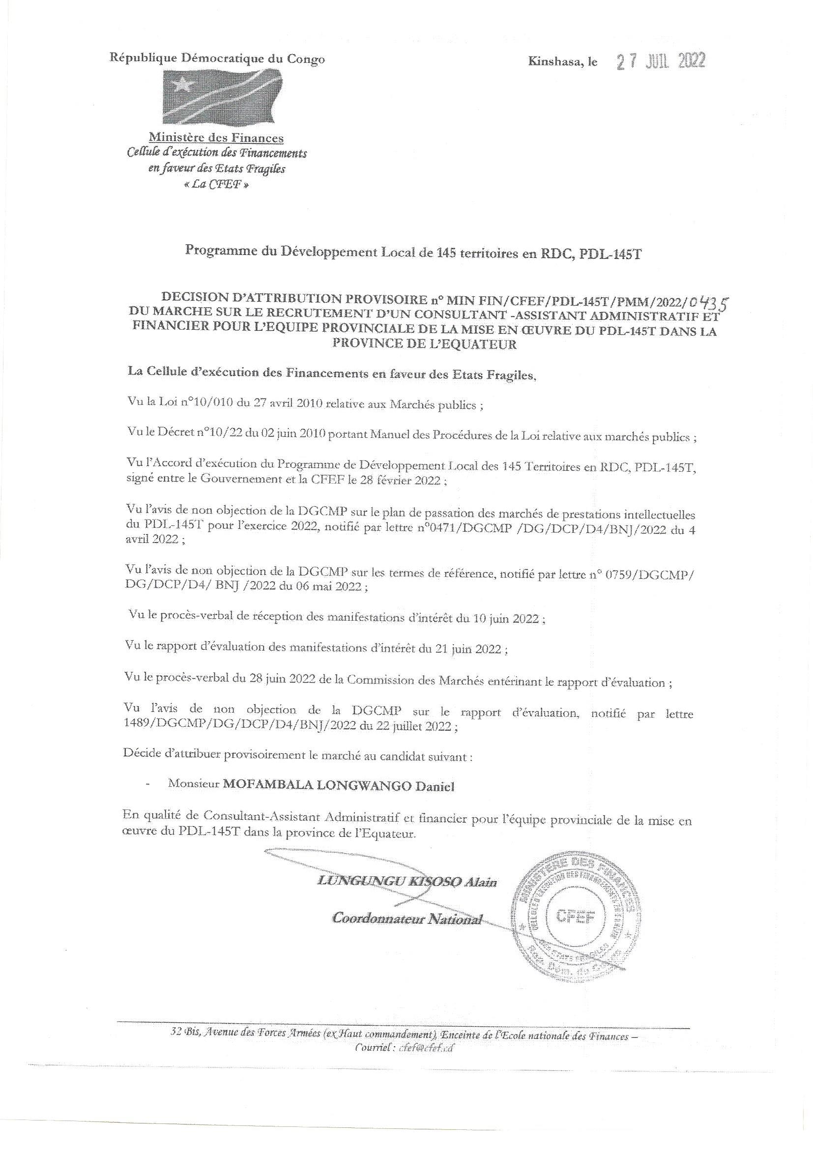 ATTRIBUTION PROVISOIRE ACCORDEE A Mr MOFAMBALA LONGWANGO DANIEL EN QUALITE DE CONSULTANT – ASSISTANT ADMINISTRATIF ET FINANCIER POUR L’ EQUIPE PROVINCIALE DE LA MISE EN ŒUVRE DU PDL- 145T DANS LA PROVINCE DE L’EQUATEUR.