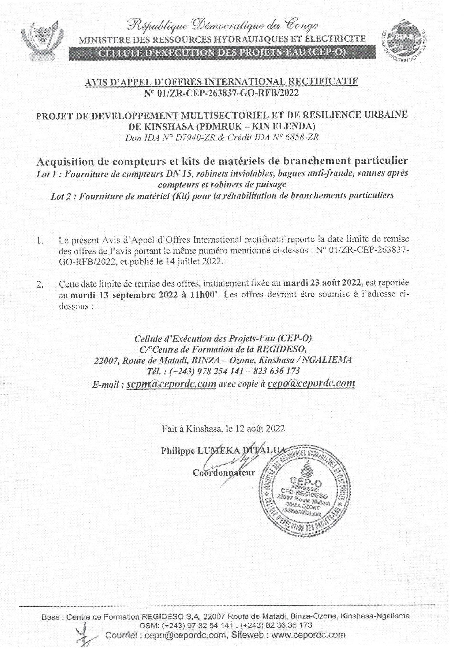Recrutement d’un Consultant chargé du contrôle et de la surveillance des travaux de réhabilitation des ouvrages et équipements de modules 1, 2 et 3 de l’usine de N’djili dans la ville Kinshasa.