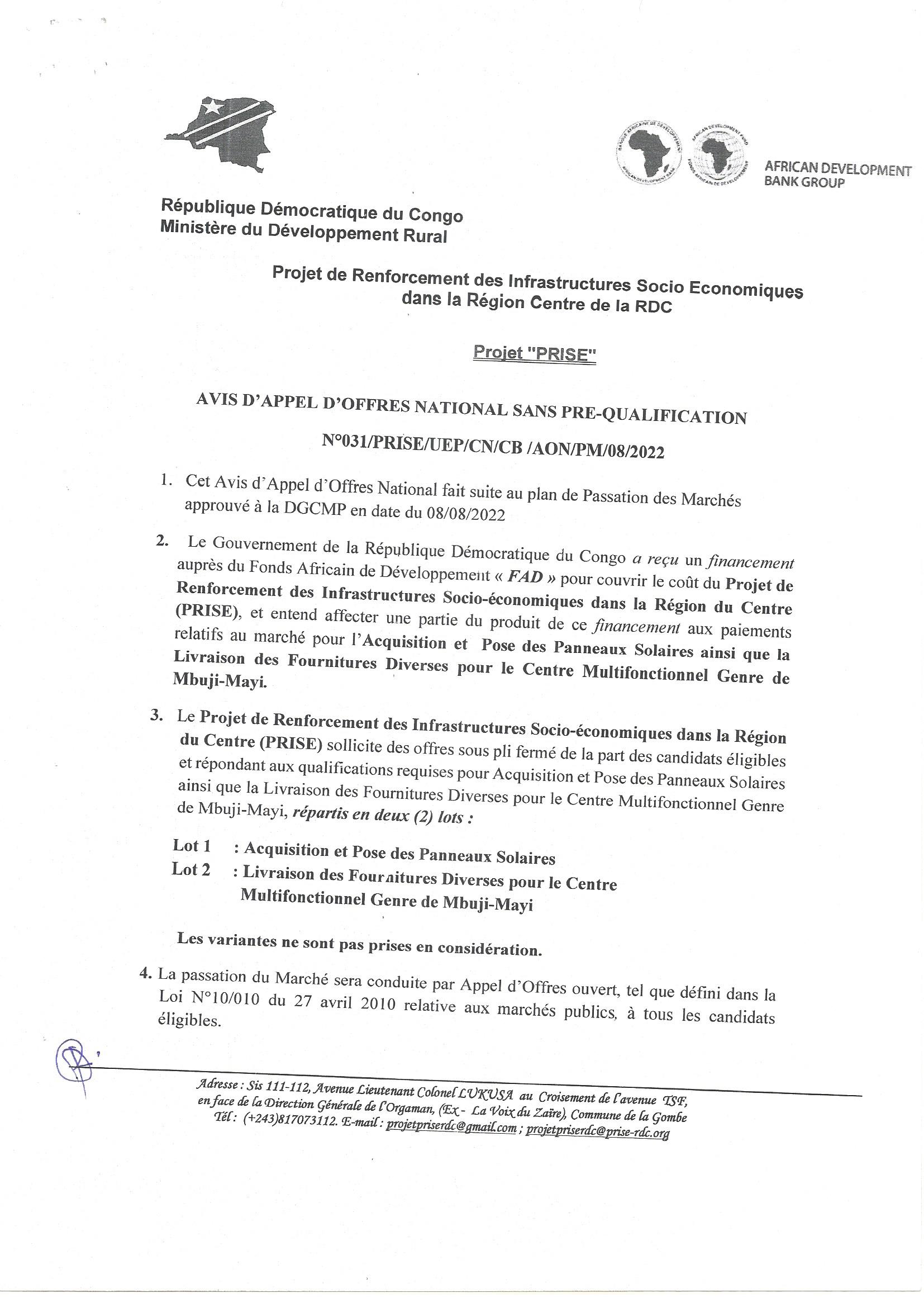 Acquisition et pose des panneaux solaires ainsi que la livraison des fournitures diverses pour le centre multifonctionnel genre de Mbuji-Mayi
