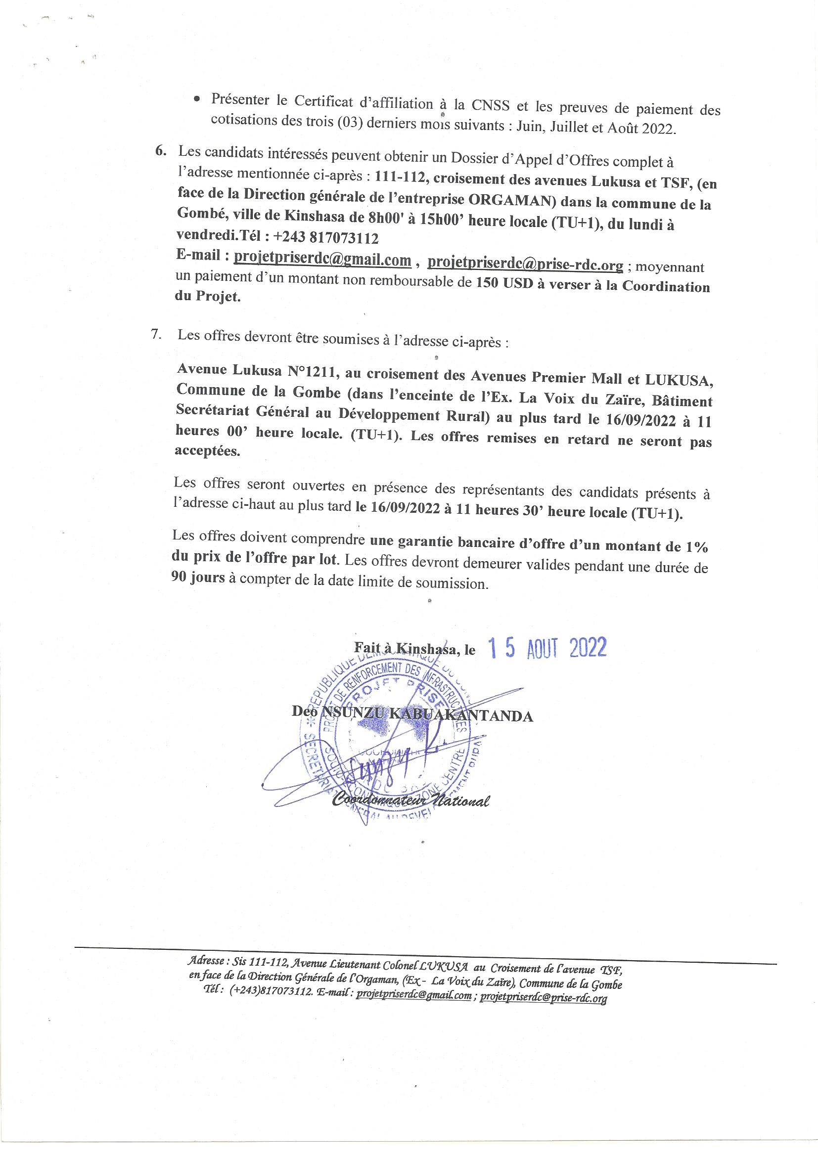 Attribution de marche de travaux du bâtiment administratif abritant le programme cadre de création d’emplois et de revenus (PROCER) À KINSHASA/GOMBE à Entreprise BAT STAR SARL.