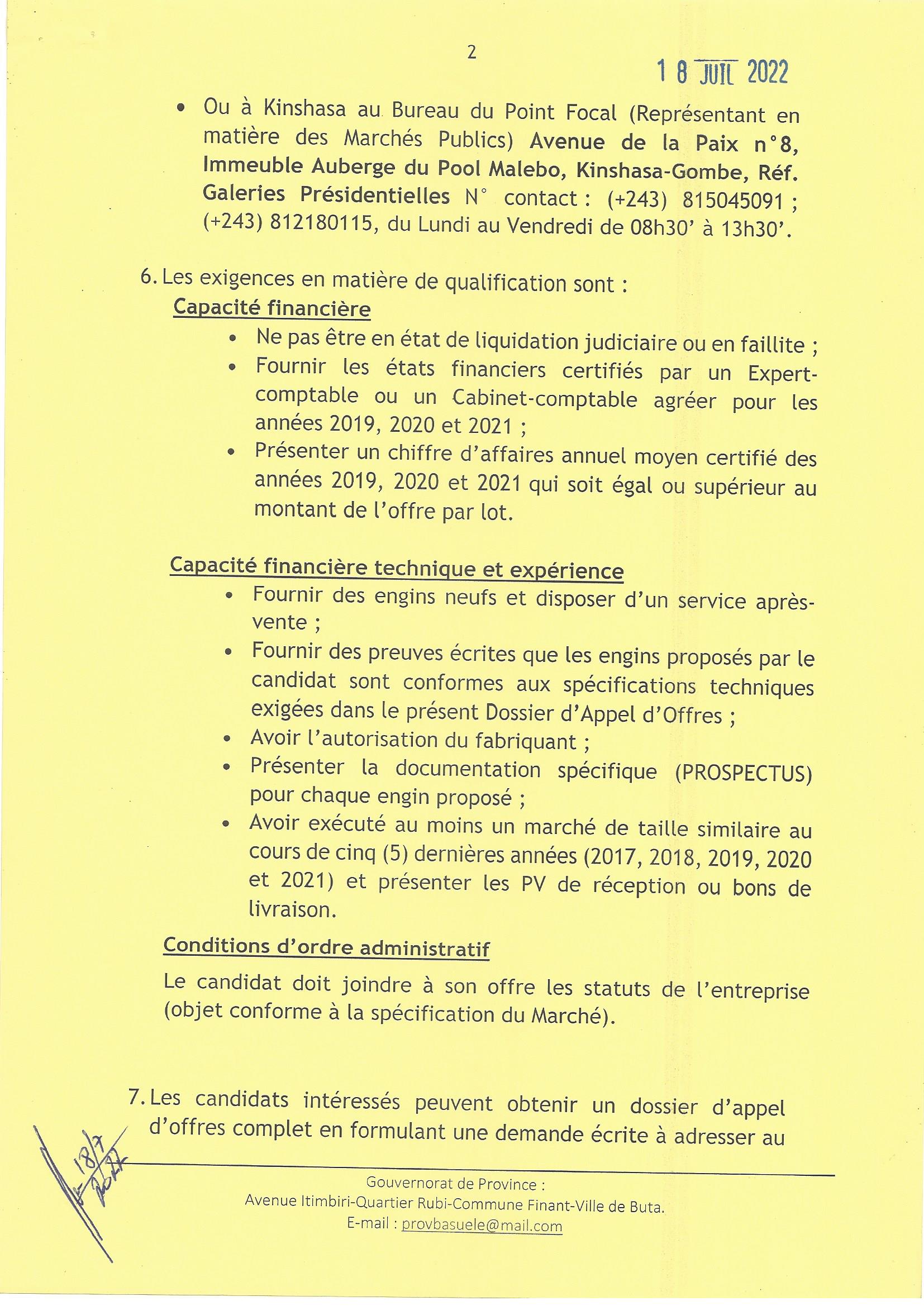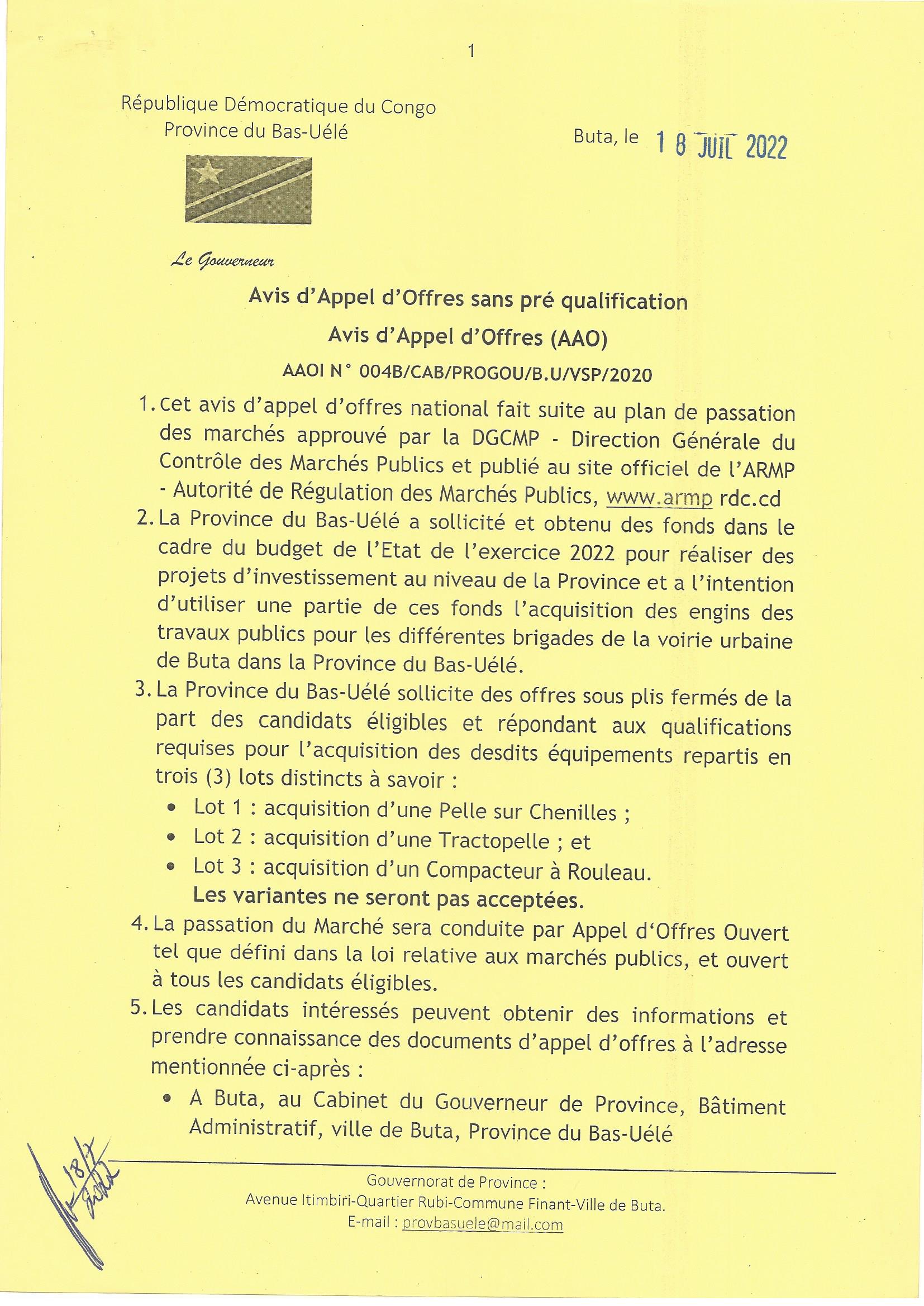 Acquisition des engins des travaux publics pour les différentes brigades de la voirie urbaine de buta dans la province du BAS-UELE, marché reparti en 3 lots.