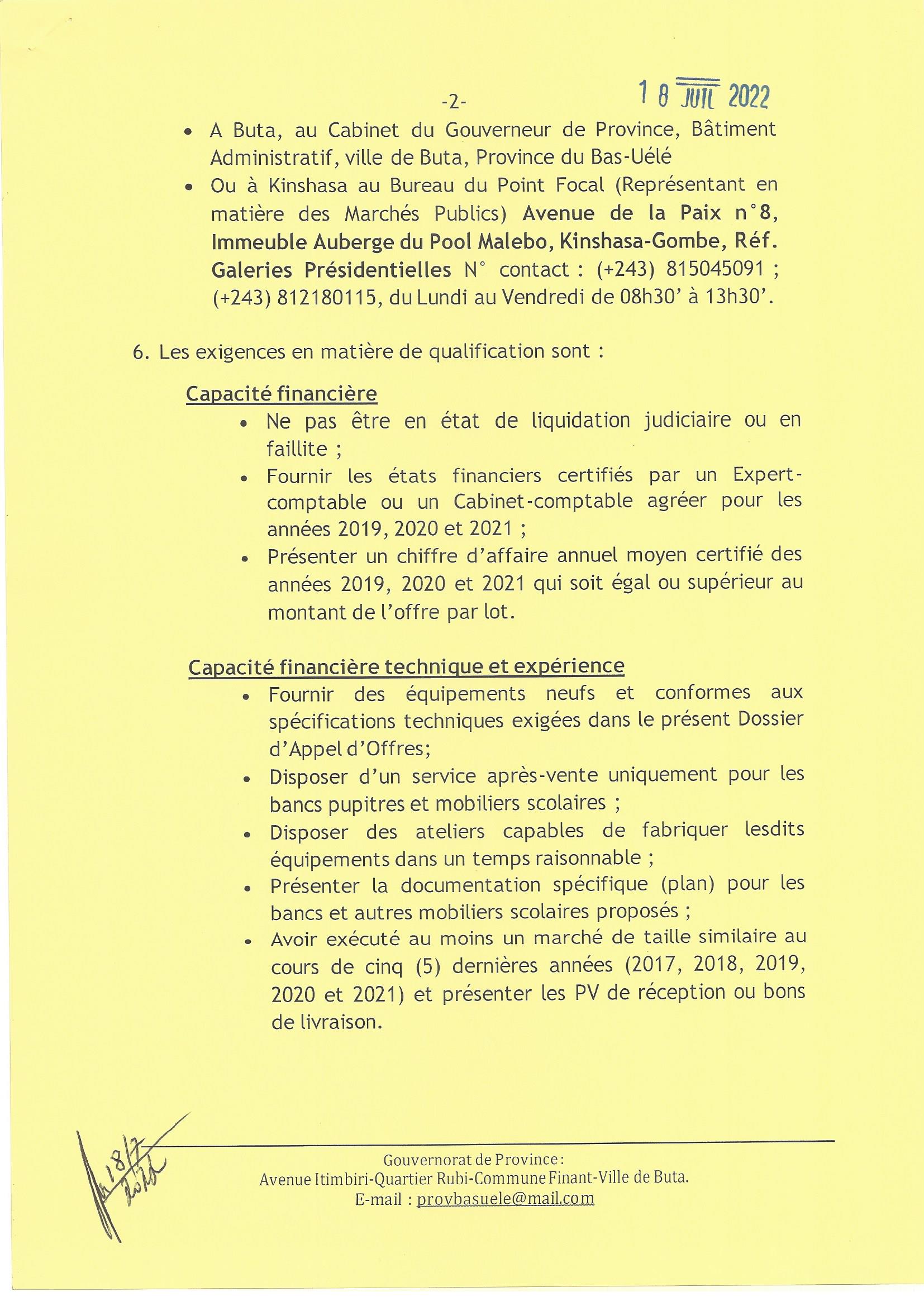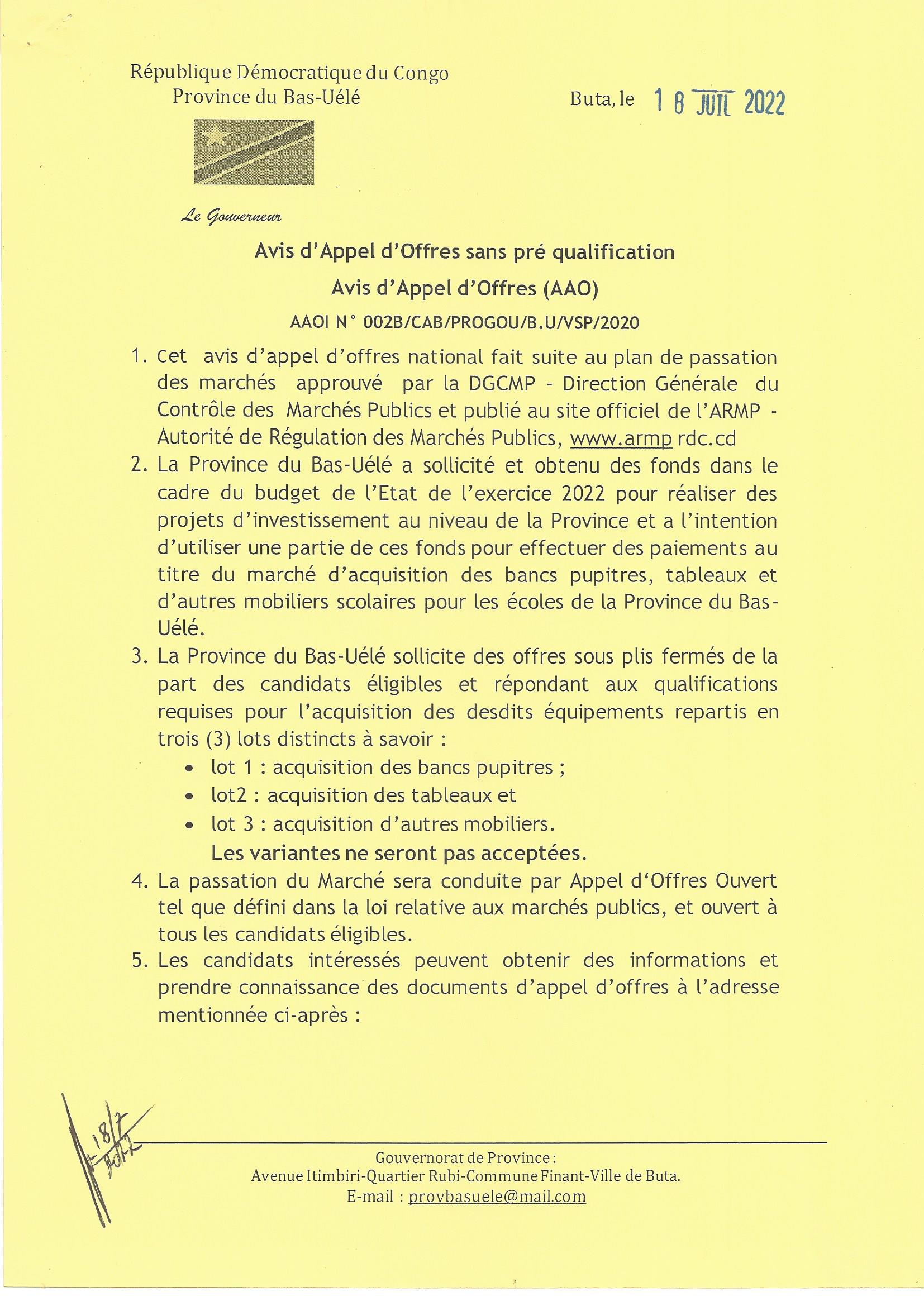 Marche d’acquisition des bancs pupitres, tableaux et d’autres mobiliers scolaires pour les écoles de la province du BAS-UELE.
