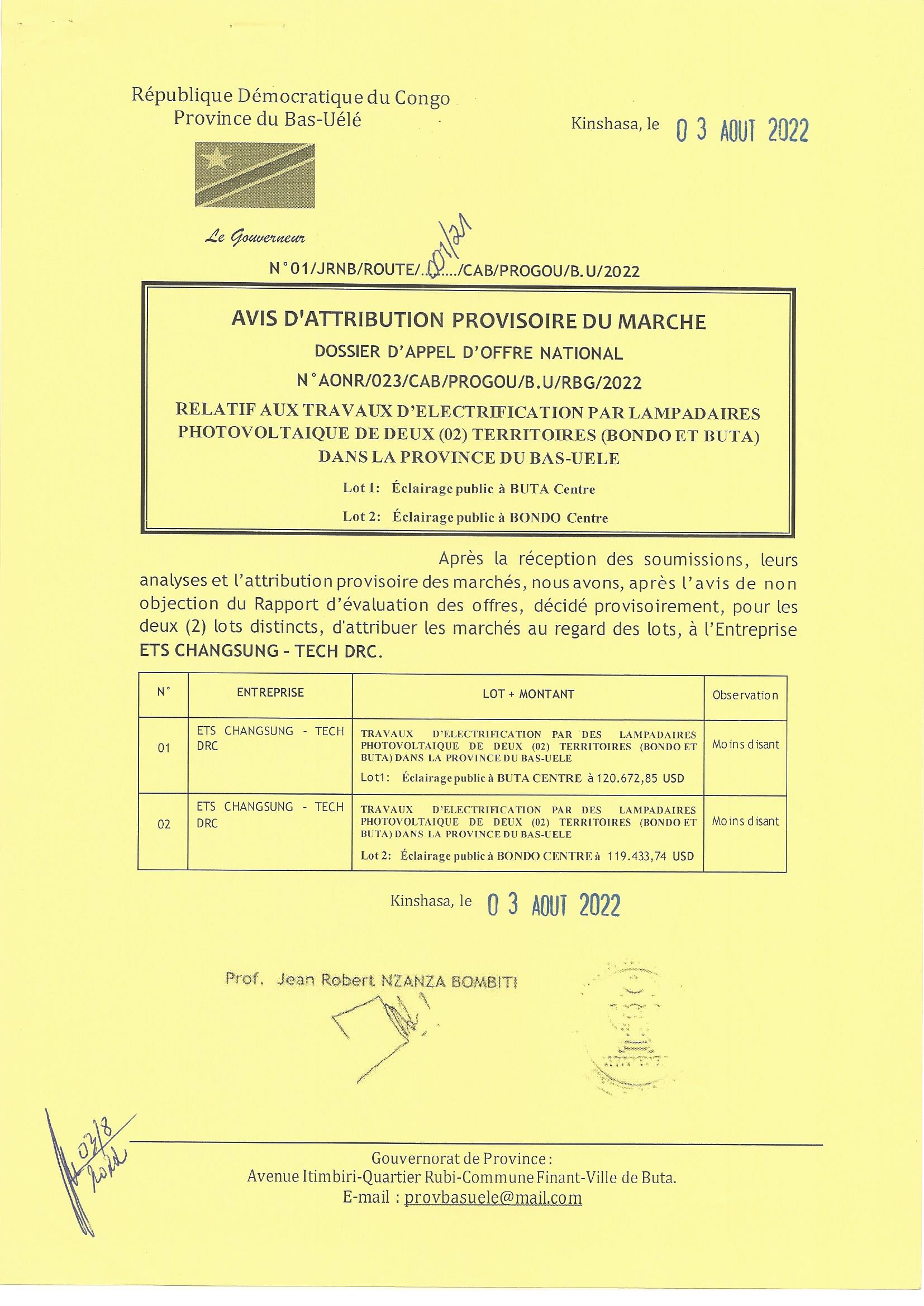 TRAVAUX D’ELECTRIFICATION PAR LAMPADAIRES PHOTOVOLTAIQUE DE DEUX (02) TERRITOIRES ( BONDO ET BUTA ) DANS LA PROVINCE DU BAS-UELE.