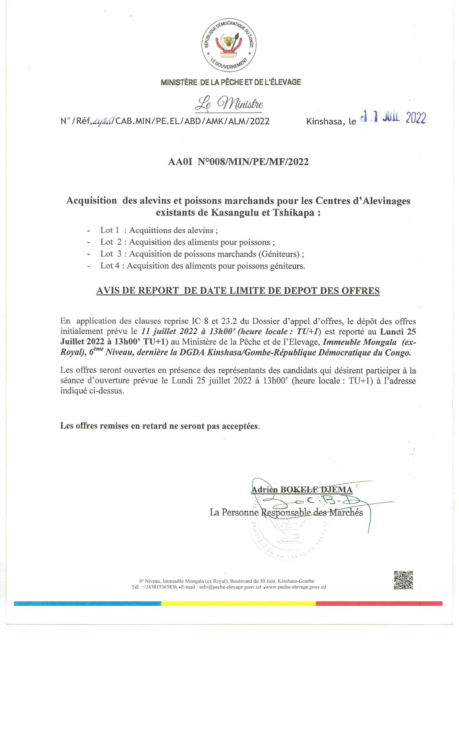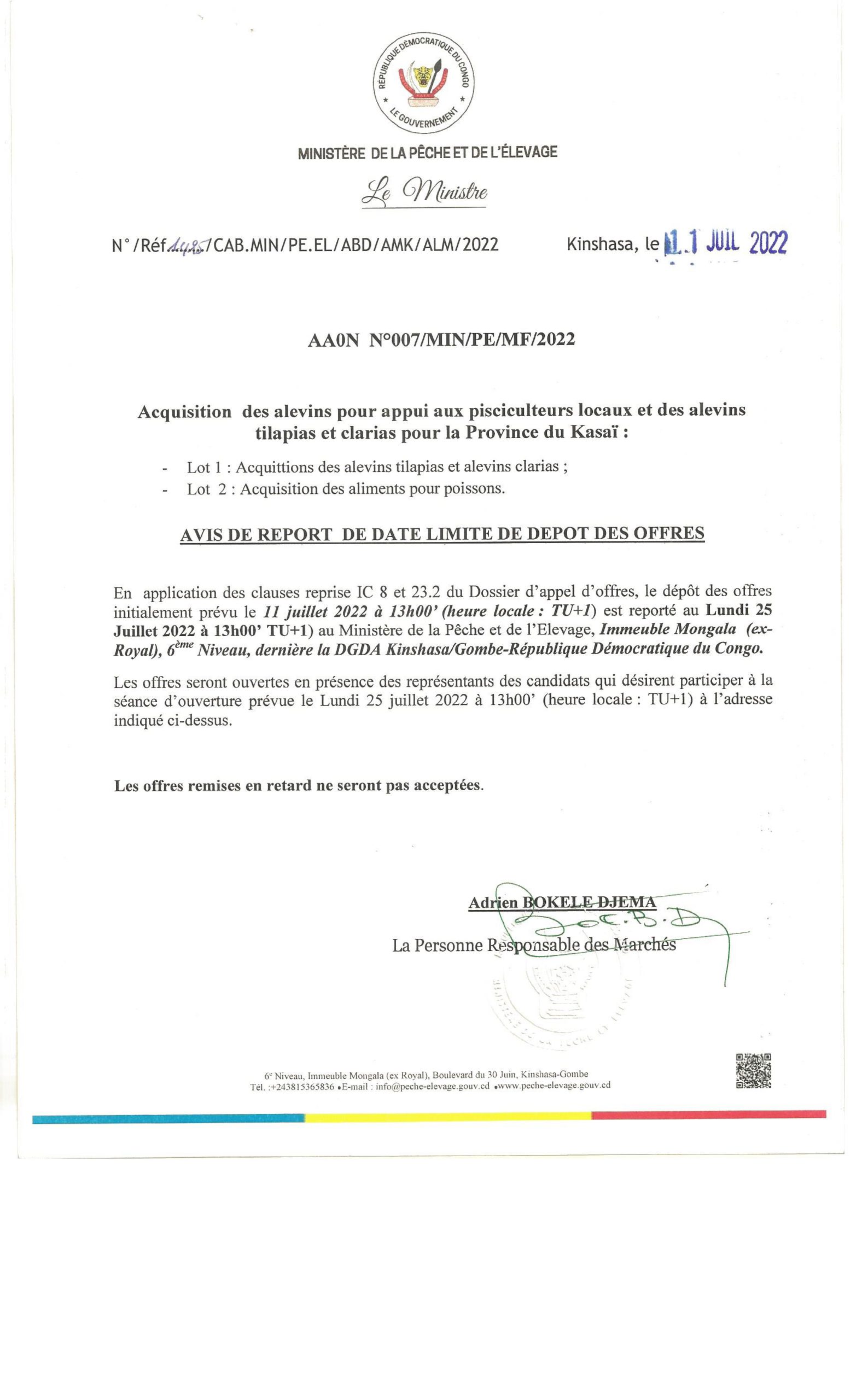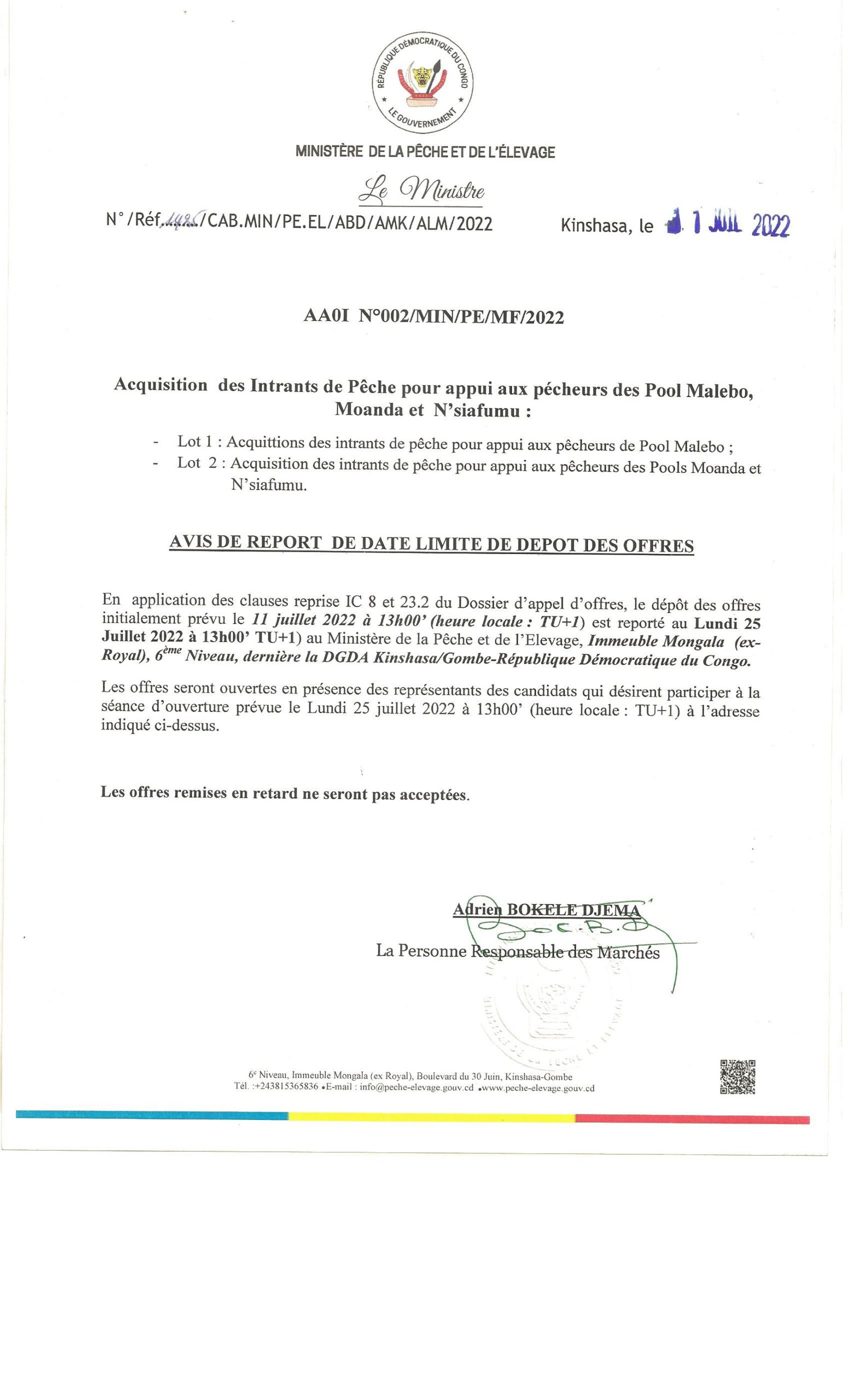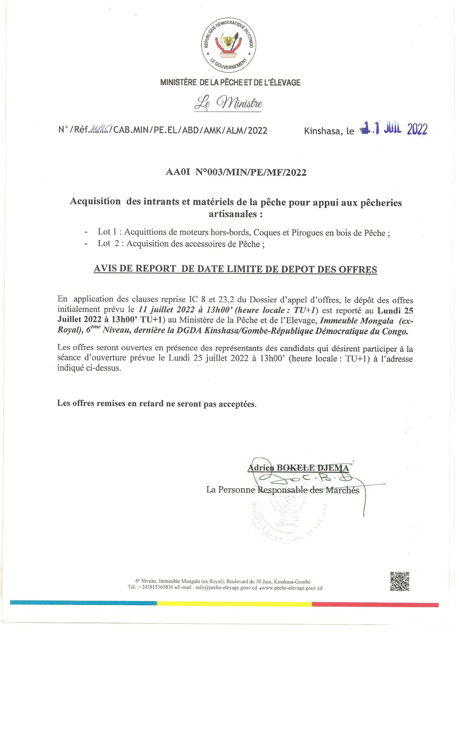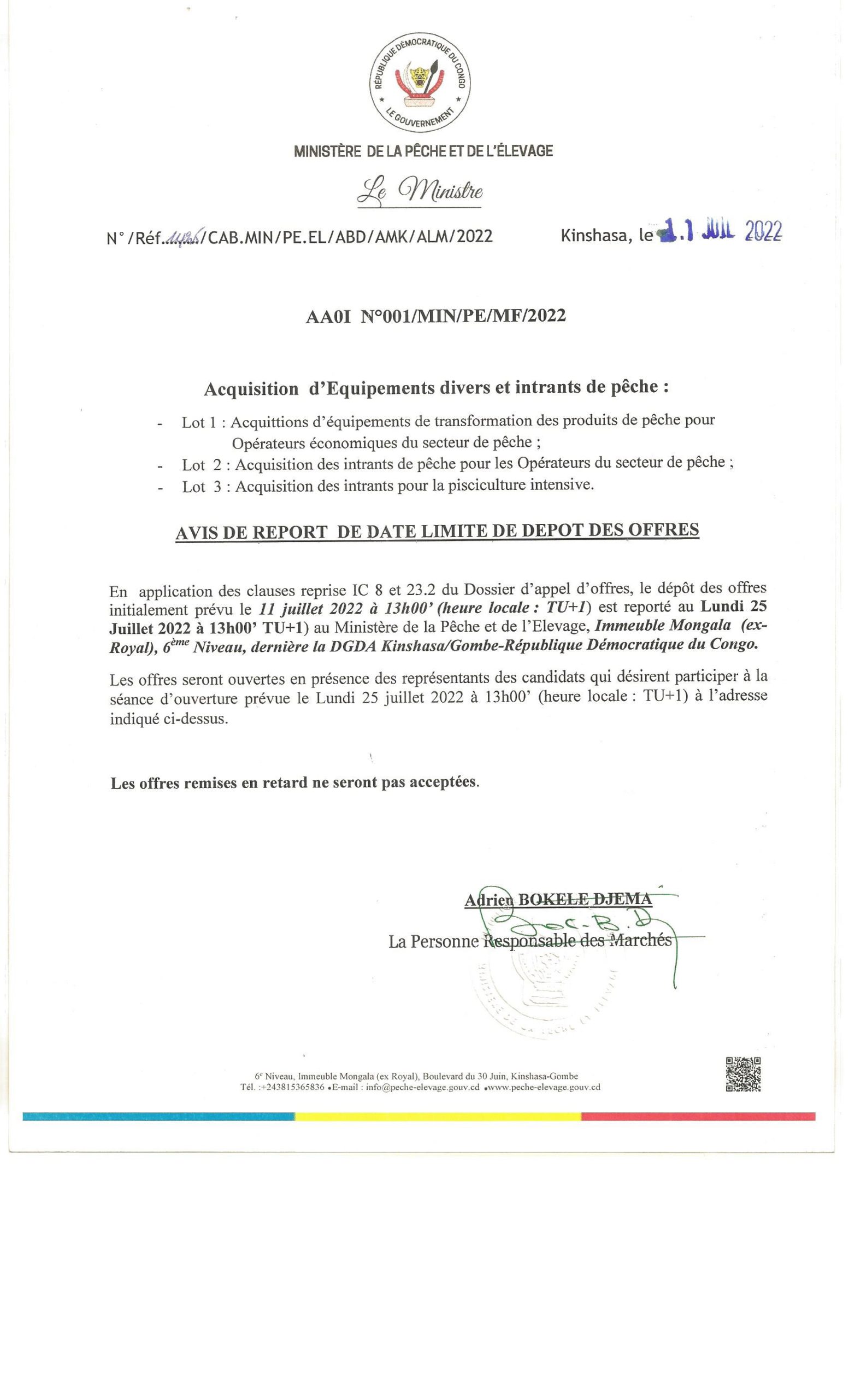 Avis de report de date limite de dépôt des offres N°001/MIN/PE/MF/2022 relatif à l’acquisition d’équipements divers et intrants de pêche. (lot1 ; lot 2 et lot 3)