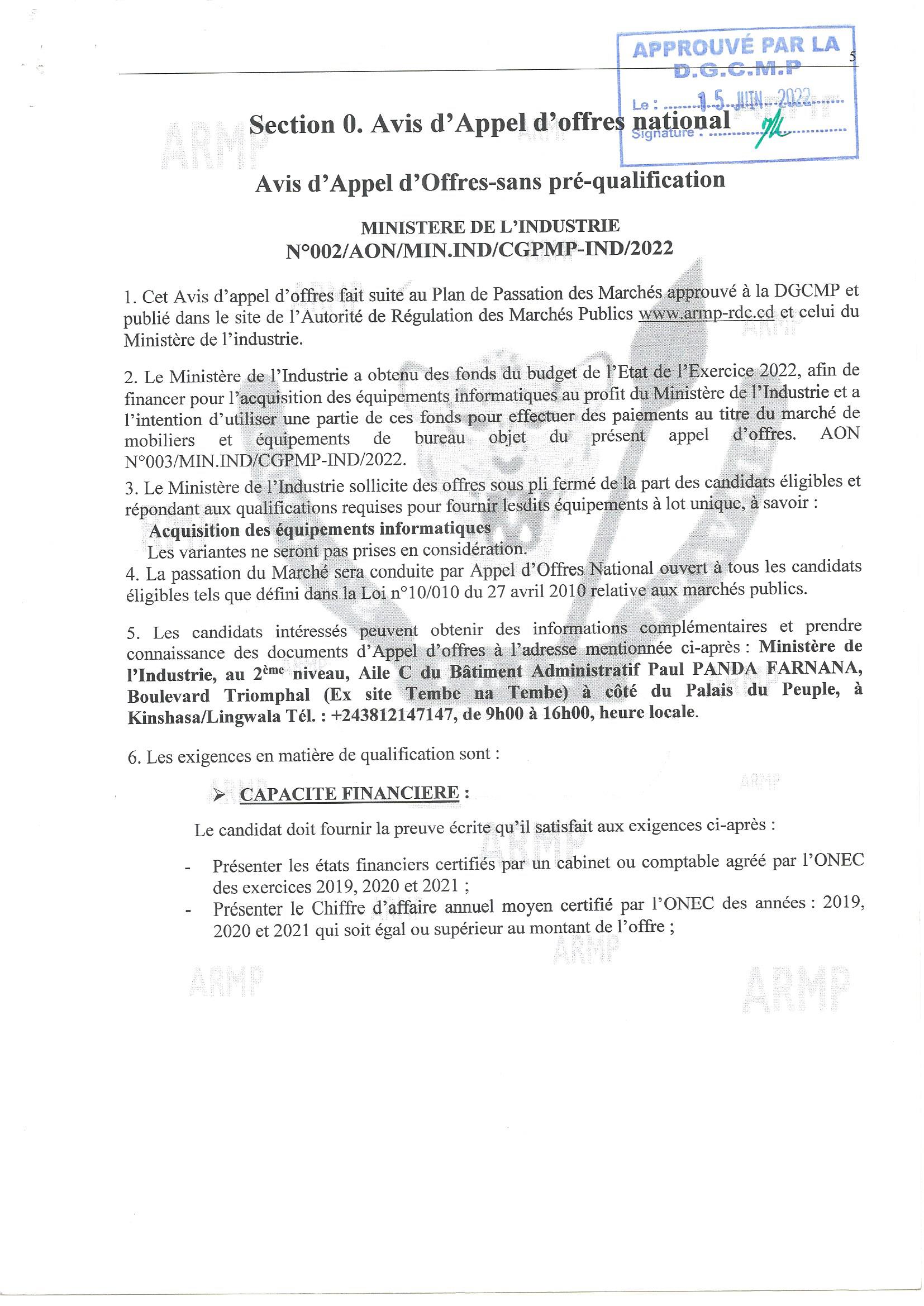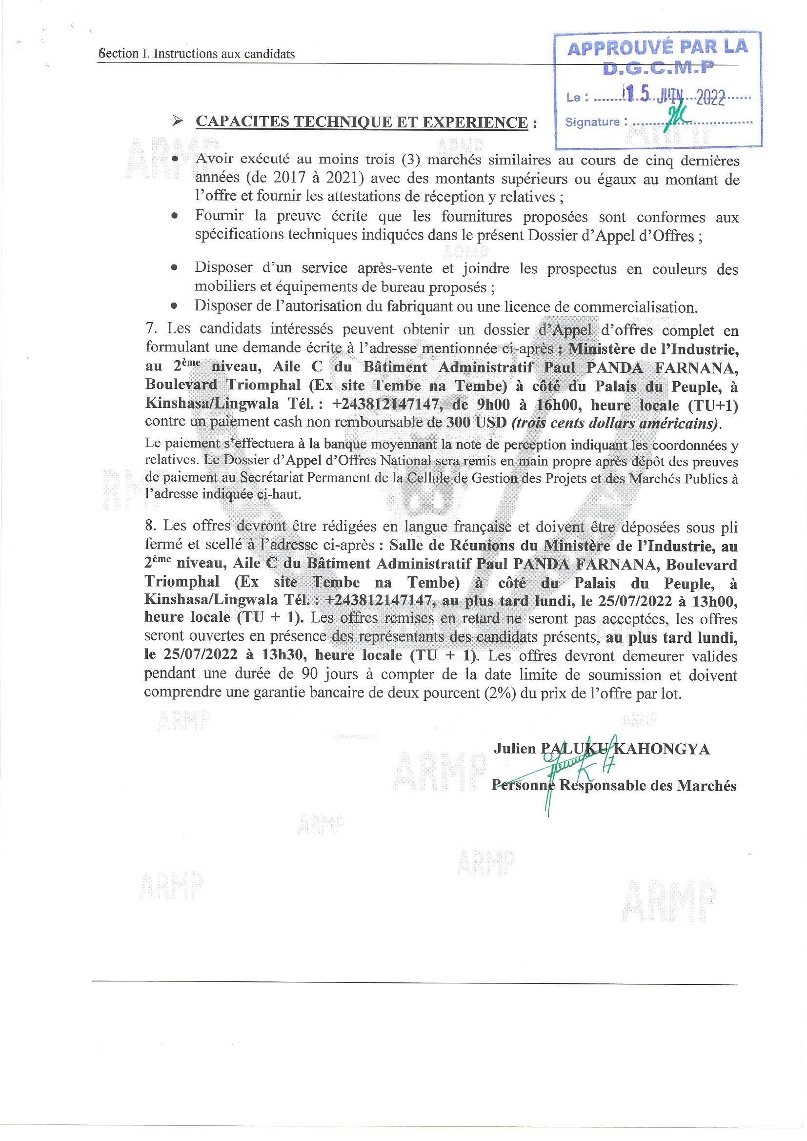 Acquisition des mobiliers en (2) lots au profit du secrétariat général a l’industrie…