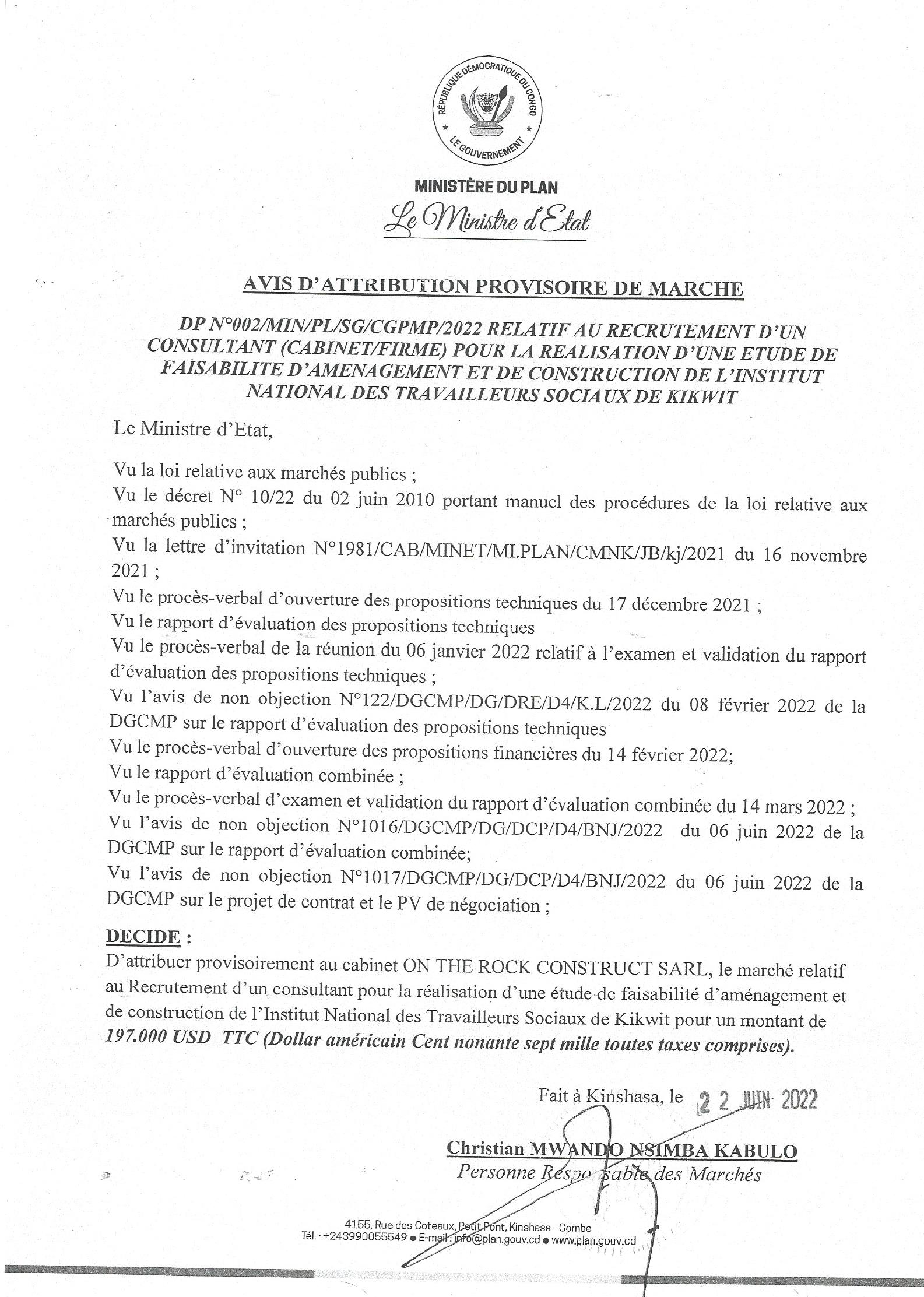Attribution Provisoire du marché relatif au recrutement d’un Consultant pour la réalisation d’une étude de faisabilité d’Aménagement et de Construction de l’institut National des Travailleurs Sociaux de Kikwit au Cabinet ON THE ROCK CONSTRUCT SARL.