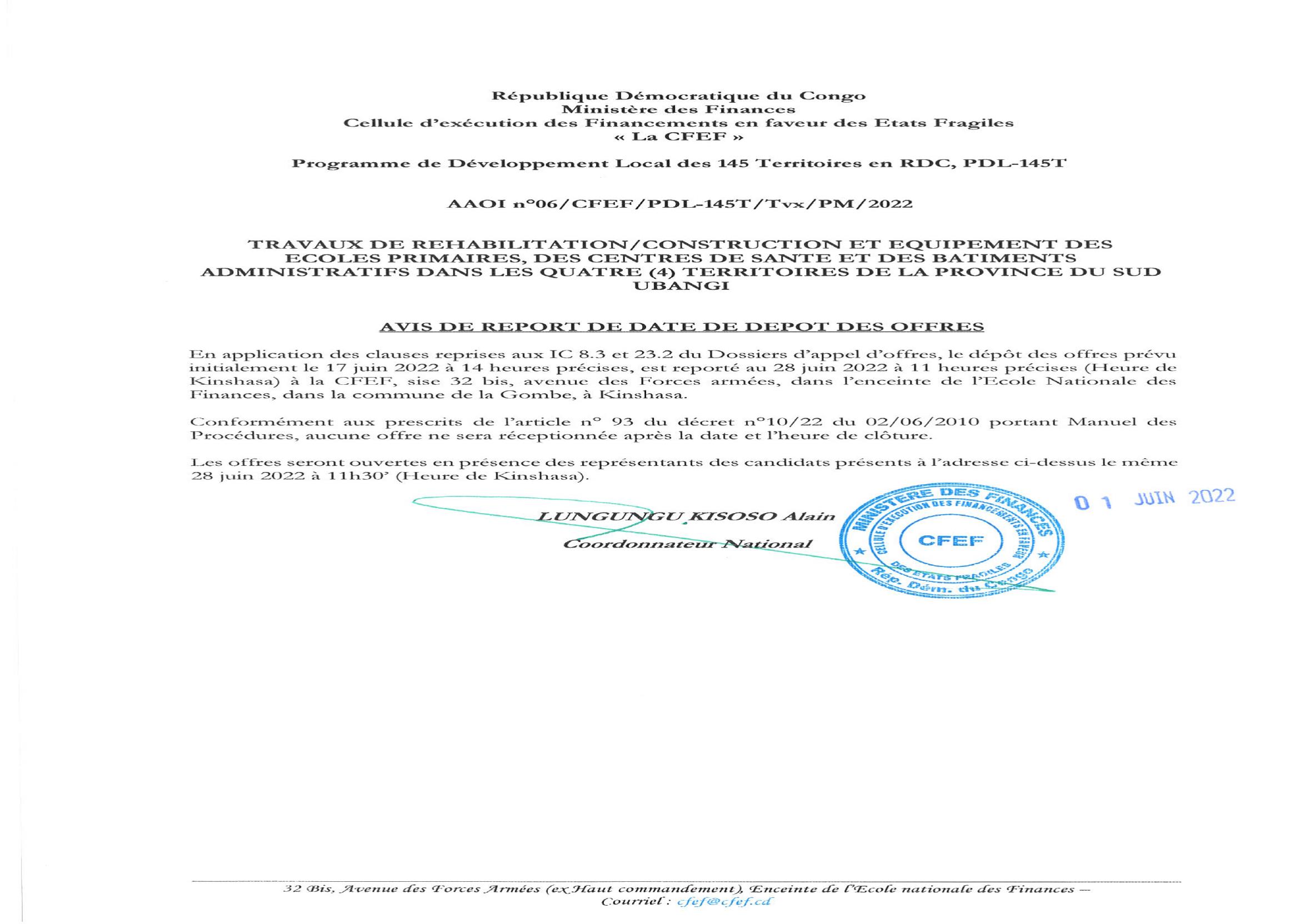 AVIS DE REPORT DE DATE DE DÉPÔT DES OFFRES POUR LA CONSTRUCTION ET ÉQUIPEMENT ECOLES PRIMAIRES, CENTRES DE SANTÉS ; … DE LA PROVINCE DU SUD UBANGI, PRÉVUS INITIALEMENT LE 17 JUIN 2022 À 14H00 PRÉCISES (HEURE DE KINSHASA), EST REPORTÉ AU 28 JUIN 2022 À