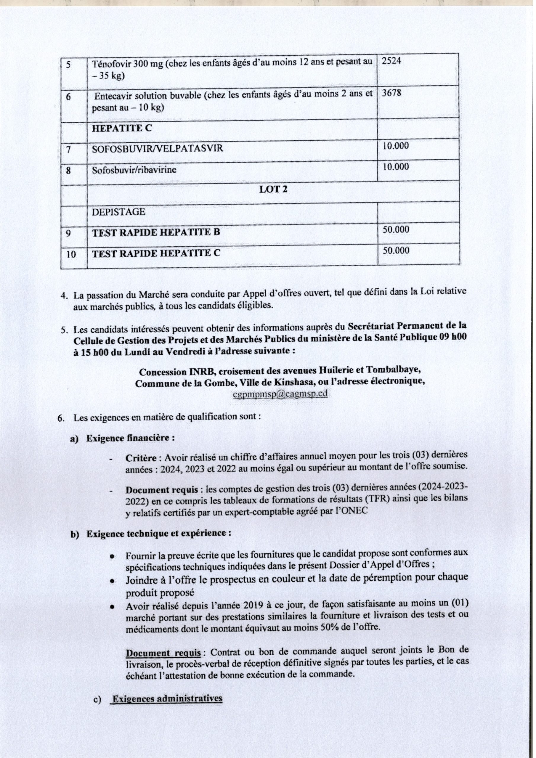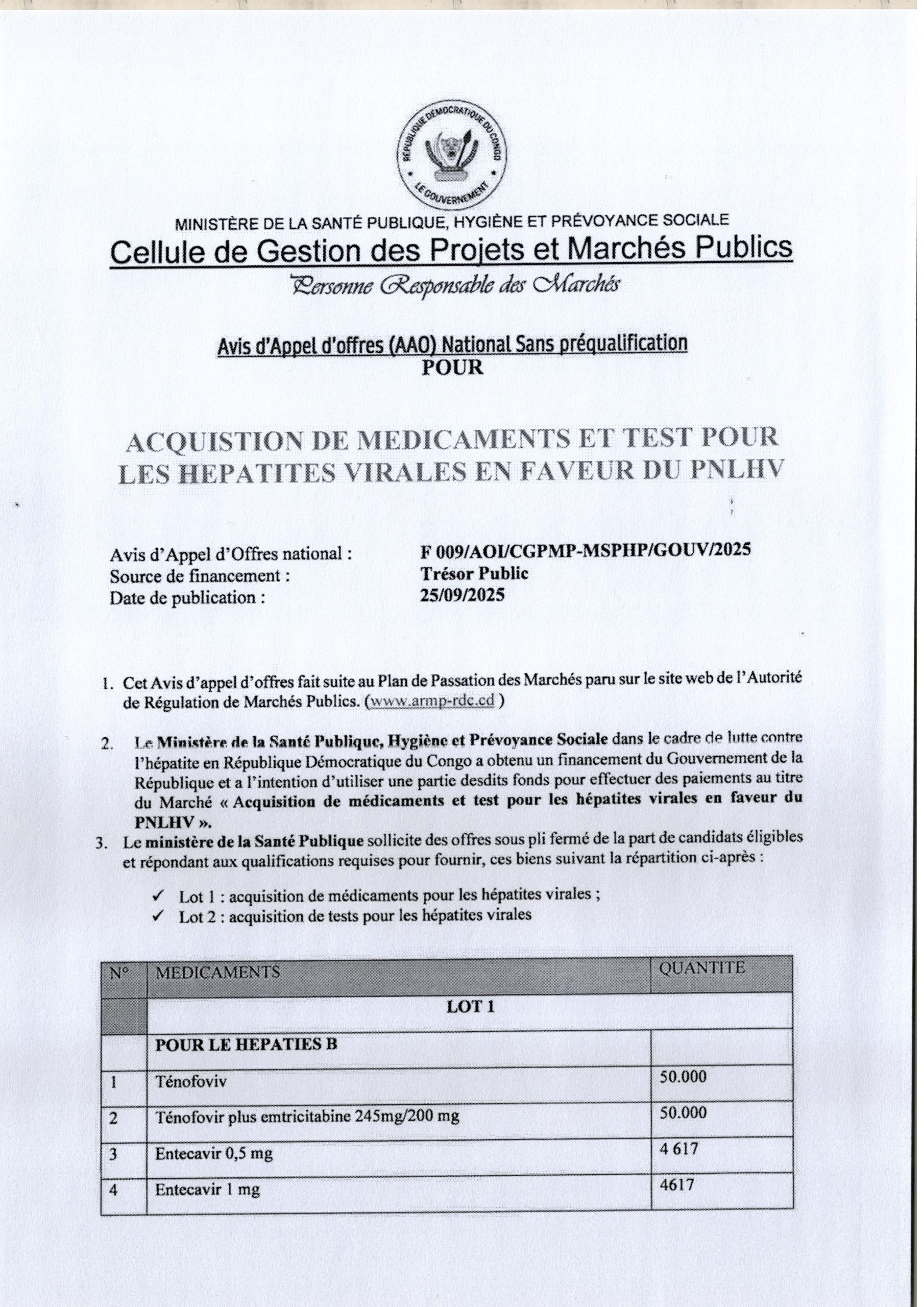 Acquisition de Médicaments et test pour les Hépatites Virales en faveur du PNLHV