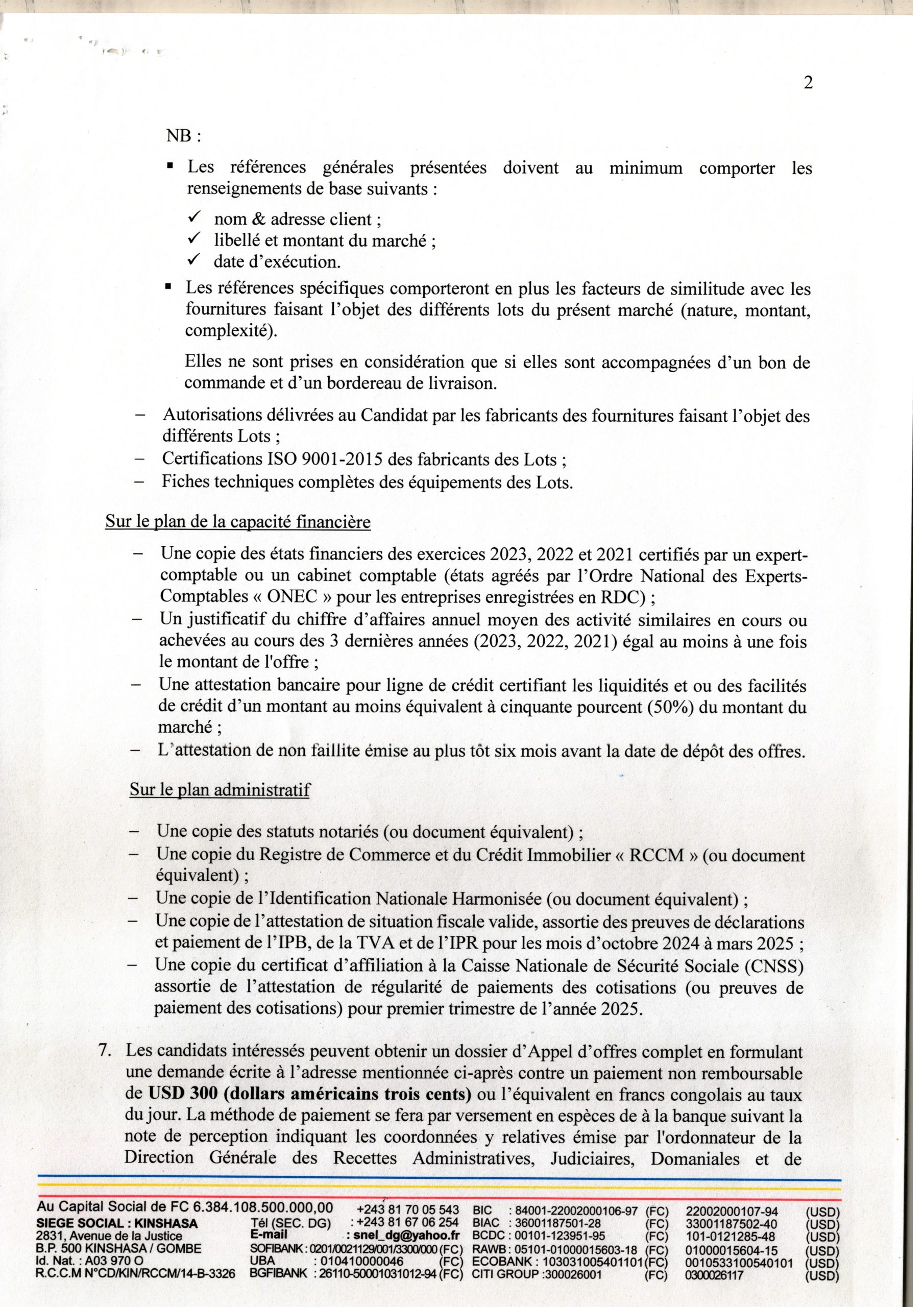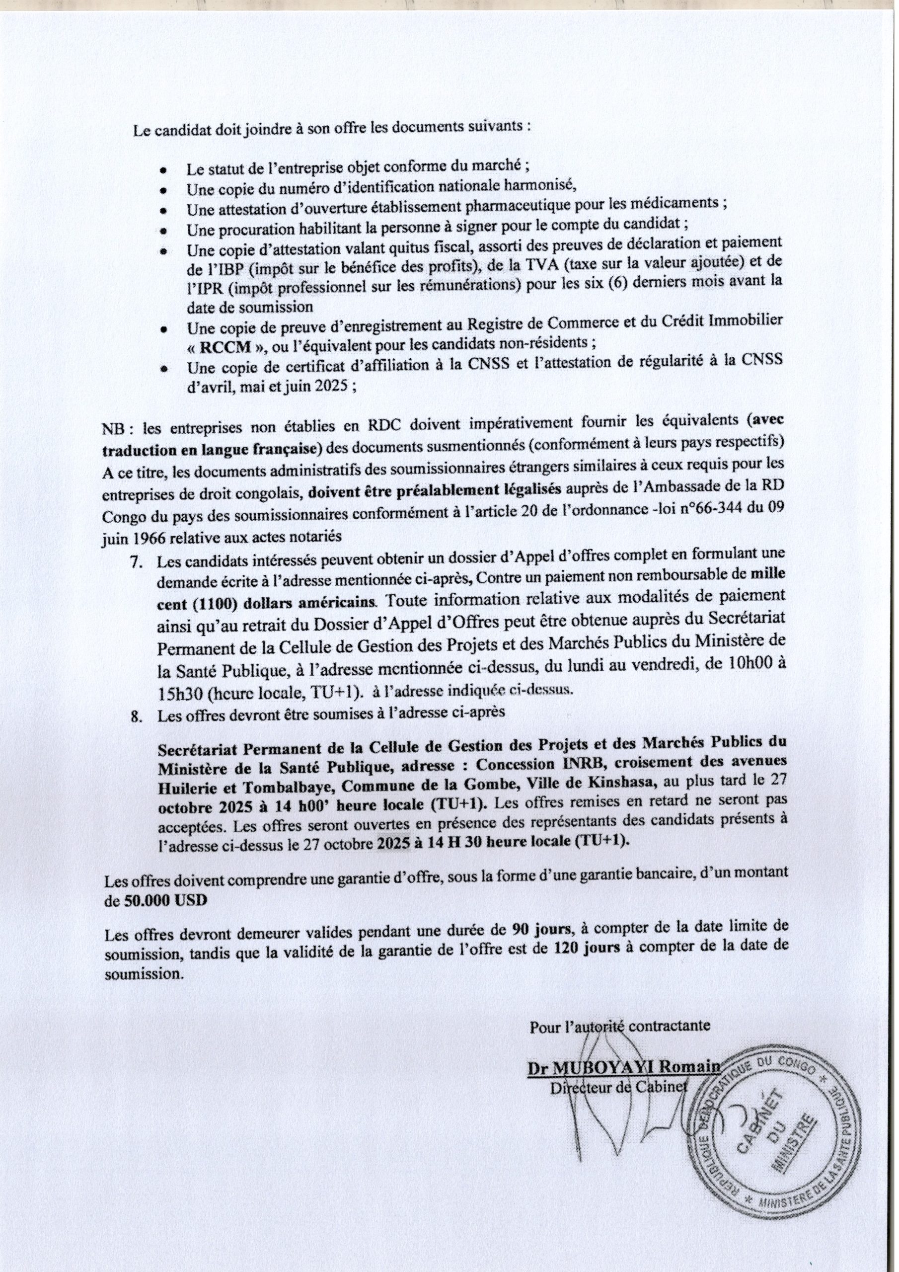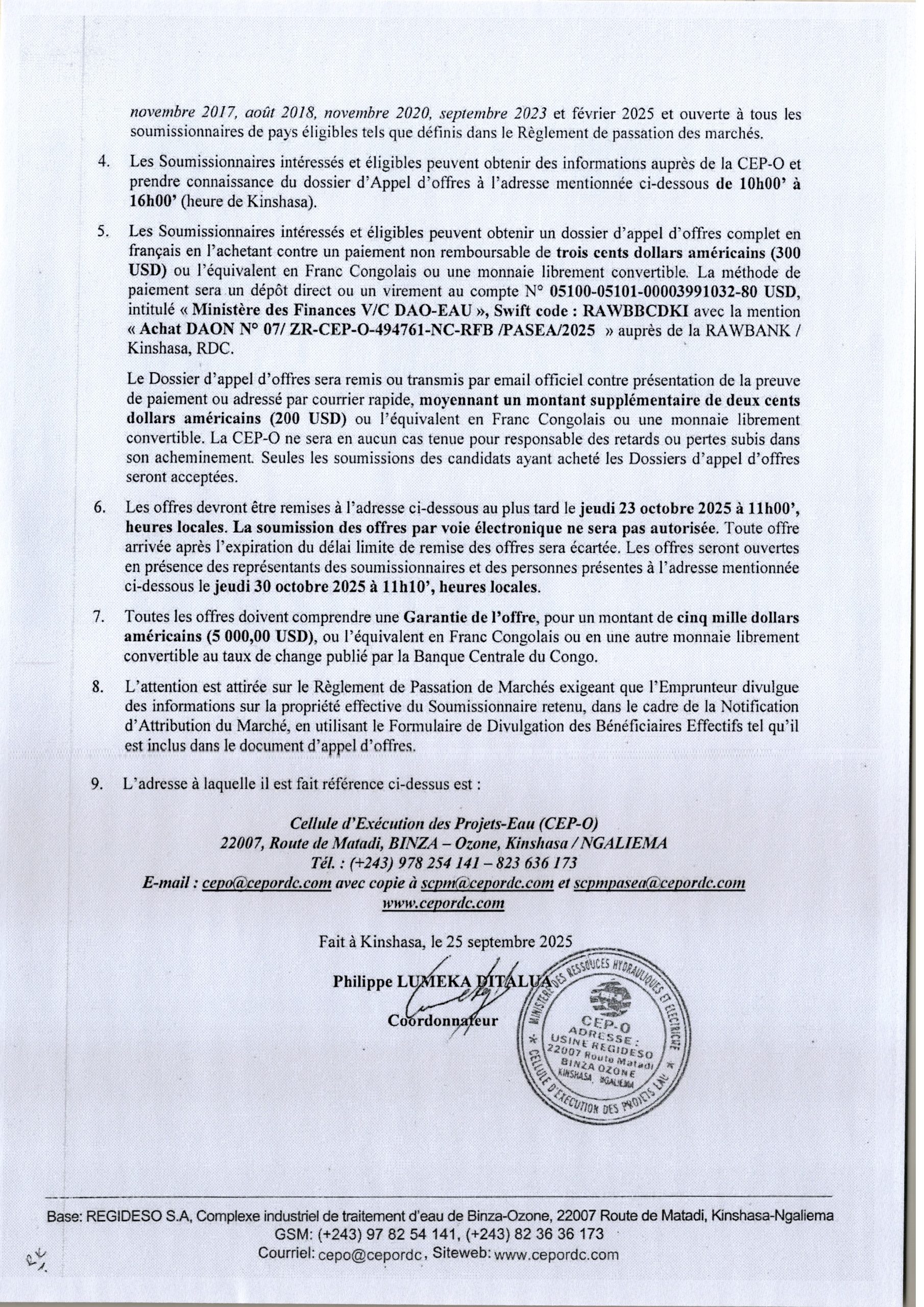 Attribution provisoire accordée à la BCECO relative à la fourniture, implantation et affichage de 240 panneaux publicitaires dans la ville de Kinshasa dans le cadre du programme PDL 145 T.