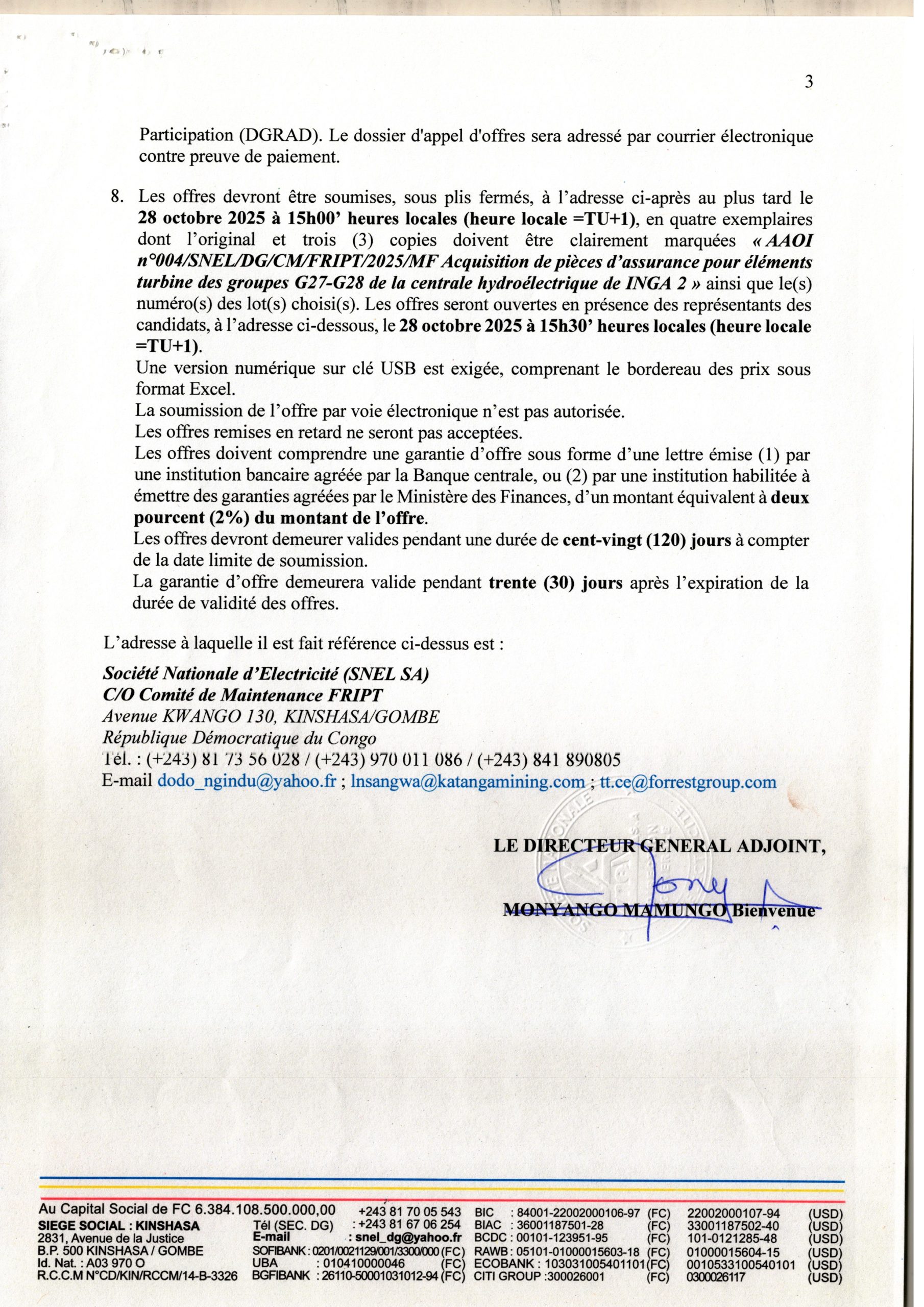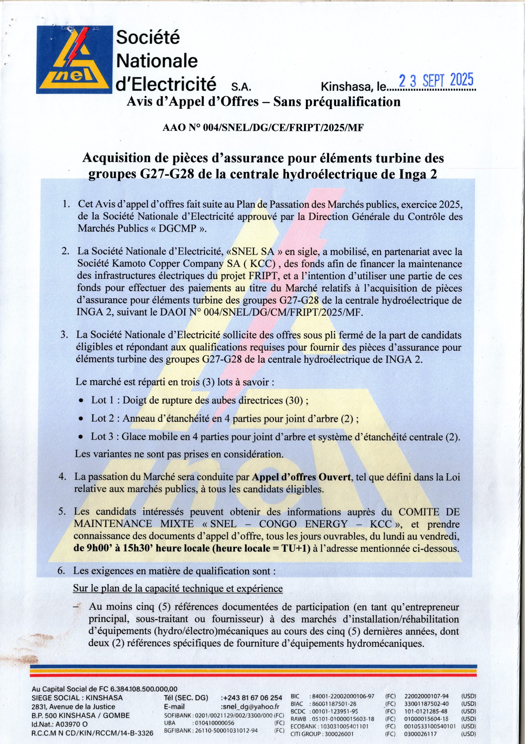 Acquisition de pièces d’assurance pour les éléments turbine des groupes G27-G28 de la centrale hydroélecrtique de Inga 2.