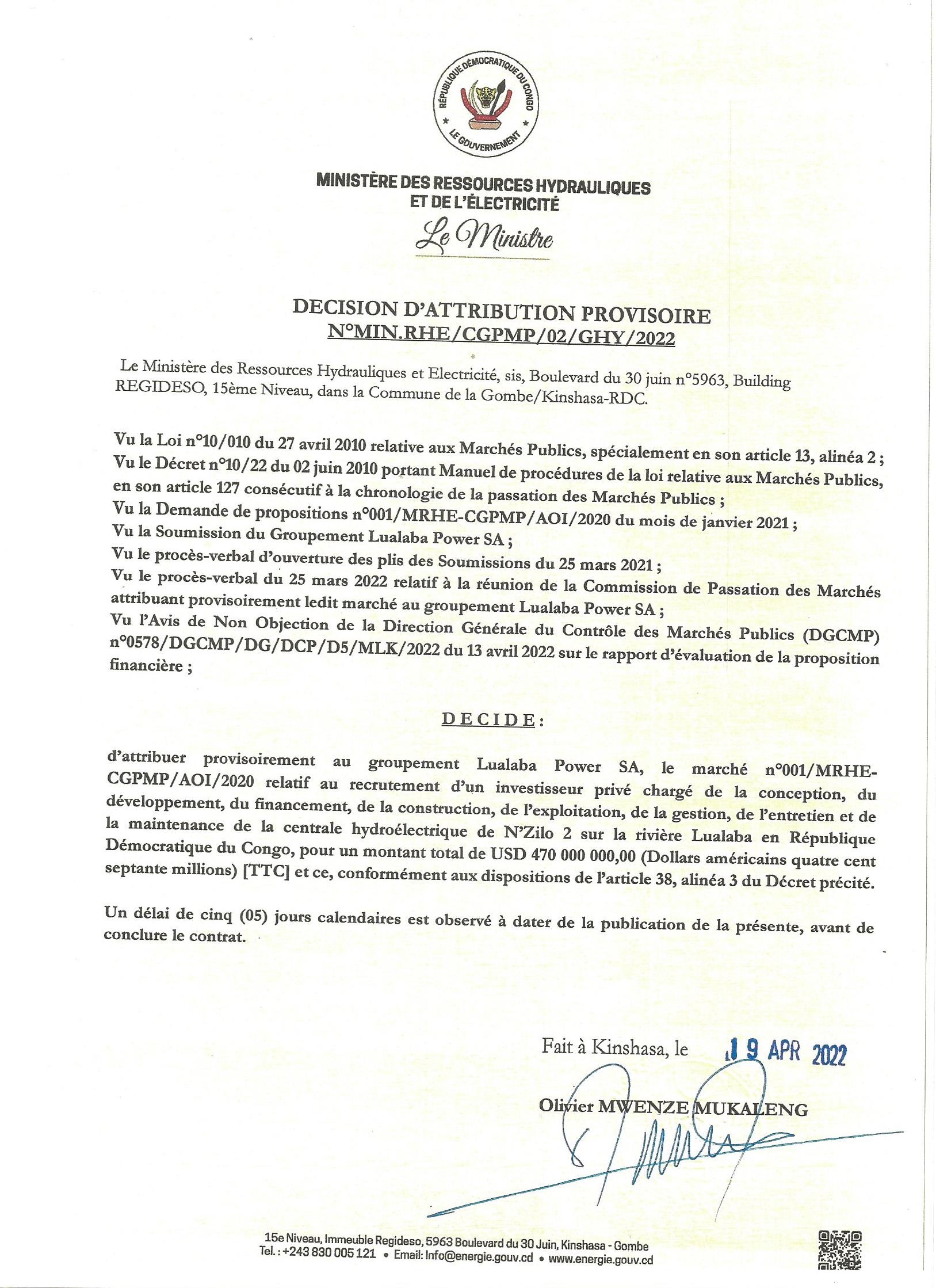 ATTRIBUTION PROVISOIRE DU MARCHÉ RELATIF AU RECRUTEMENT D’UN INVESTISSEUR PRIVÉ DE LA CONCEPTION, DU DÉVELOPPEMENT, DU FINANCEMENT, DE LA CONSTRUCTION, DE L’EXPLOITATION, DE LA GESTION, DE L’ENTRETIEN ET DE LA MAINTENANCE DE LA CENTRALE HYDRAULIQUE DE …