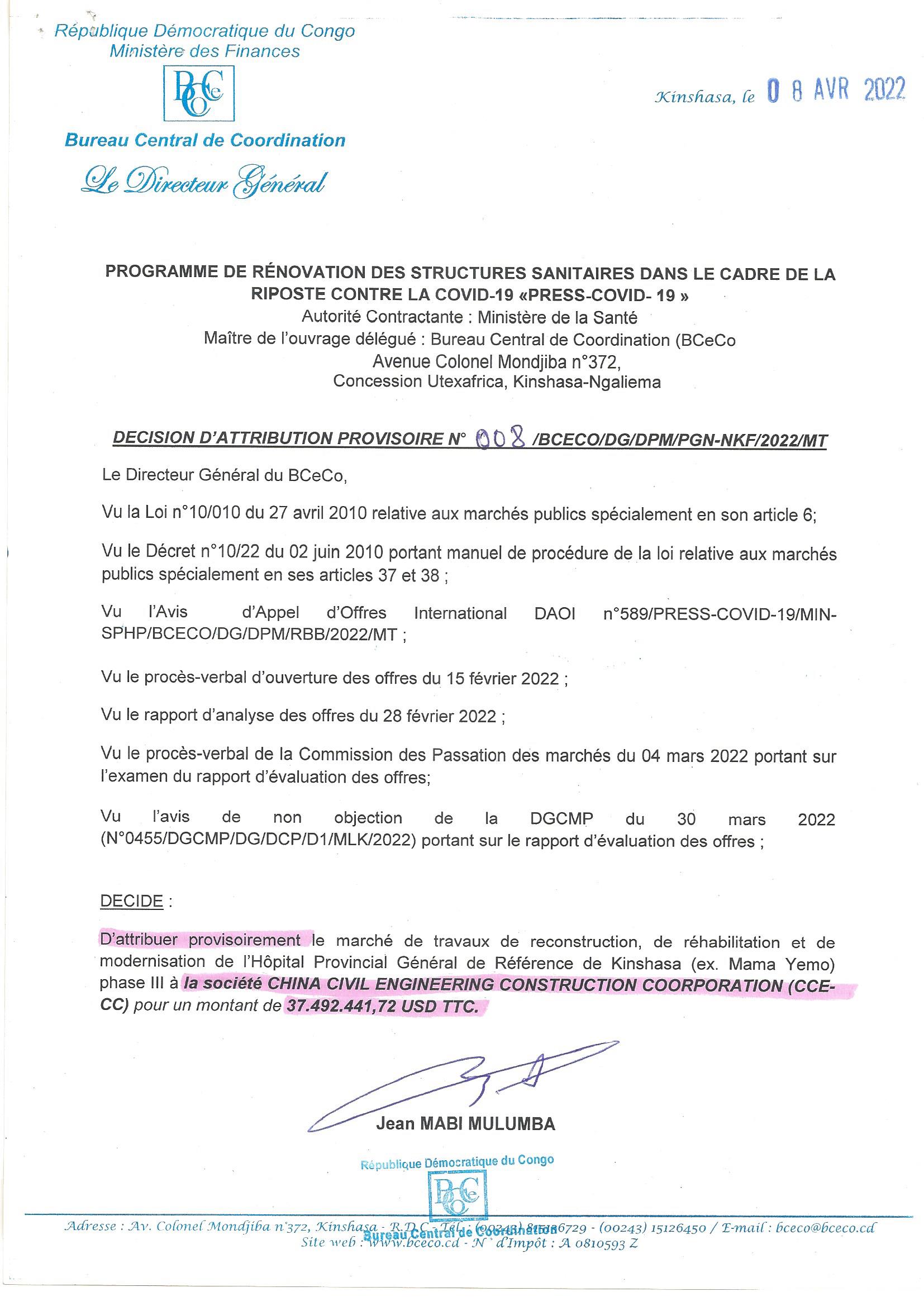 ATTRIBUTION PROVISOIRE DU MARCHE DE TRAVAUX DE RECONSTRUCTION, DE REHABILITATION ET DE MODERNISATION DE L’HOPITAL PROVINCIAL GENERAL DE REFERENCE DE KINSHASA (Ex MAMAN YEMO) ACCORDEE A LA SOCIETE CHINA CIVIL ENGINEERING.