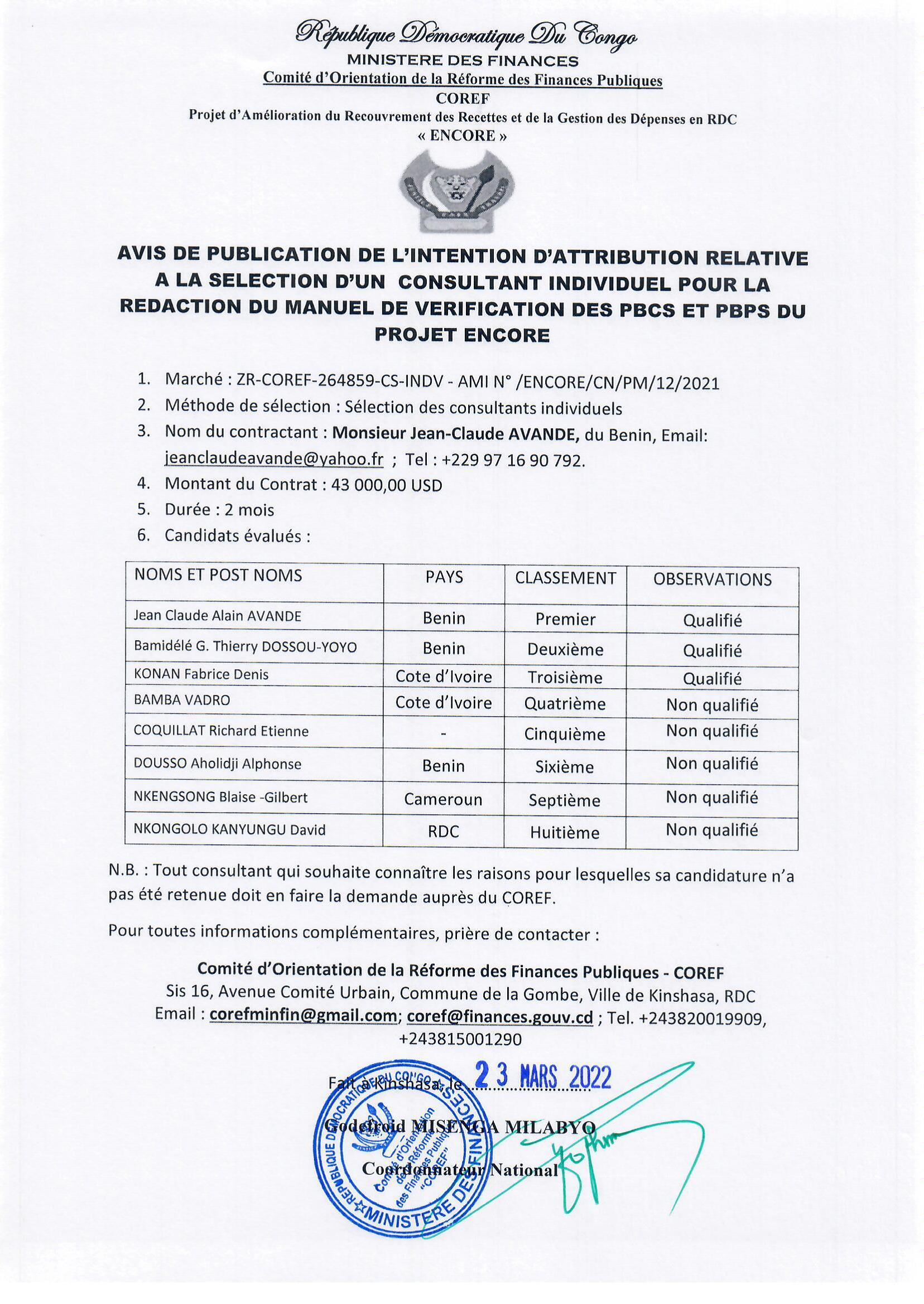 ATTRIBUTION RELATIVE À LA SÉLECTION D’UN CONSULTANT INDIVIDUEL POUR LA RÉDACTION DU MANUEL DE VÉRIFICATION DES PBCS ET PBPS DU PROJET ENCORE À MONSIEUR JEAN-CLAUDE AVANDE.