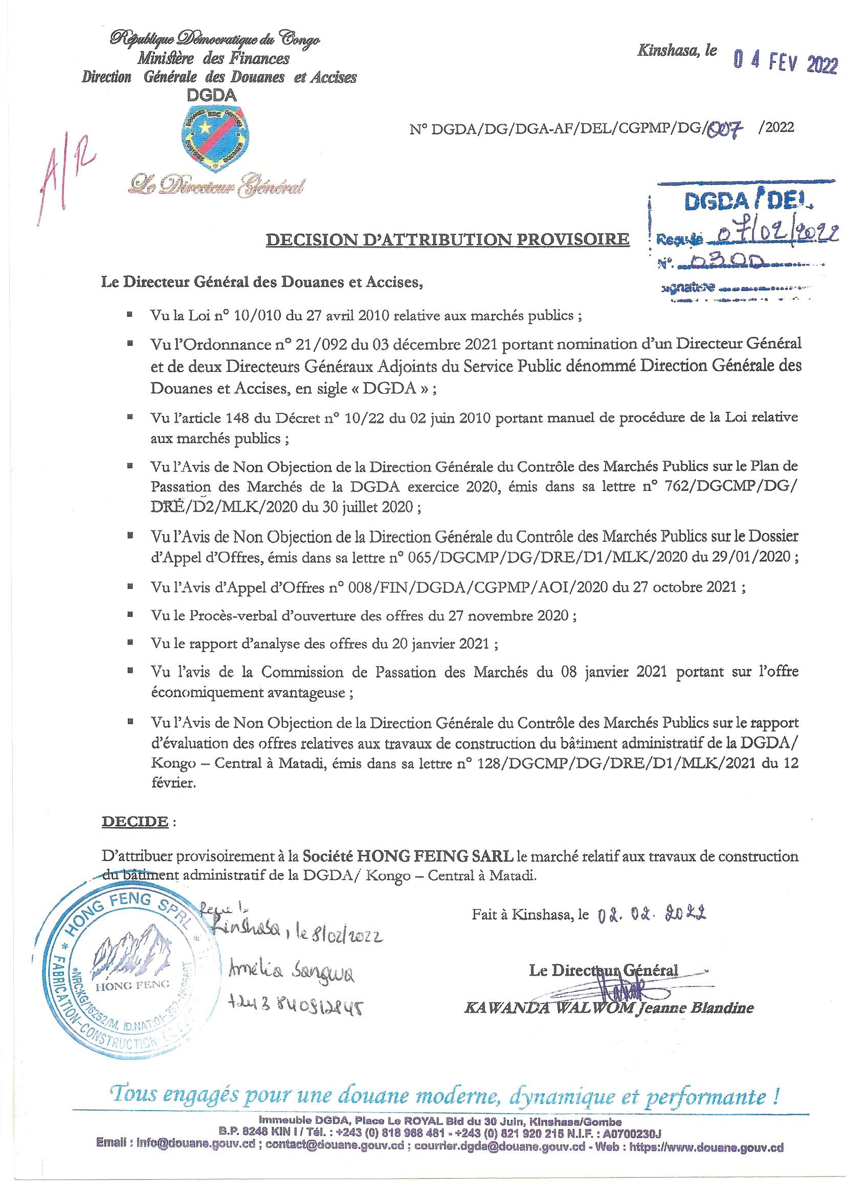 ATTRIBUTION PROVISOIRE A LA SOCIETE HONG FEING SARL LE MARCHE RELATIF AUX TRAVAUX DE CONSTRUCTION DU BATIMENT ADMINISTRATIF DE LA DGDA / AU KONGO-CENTRAL A MATADI
