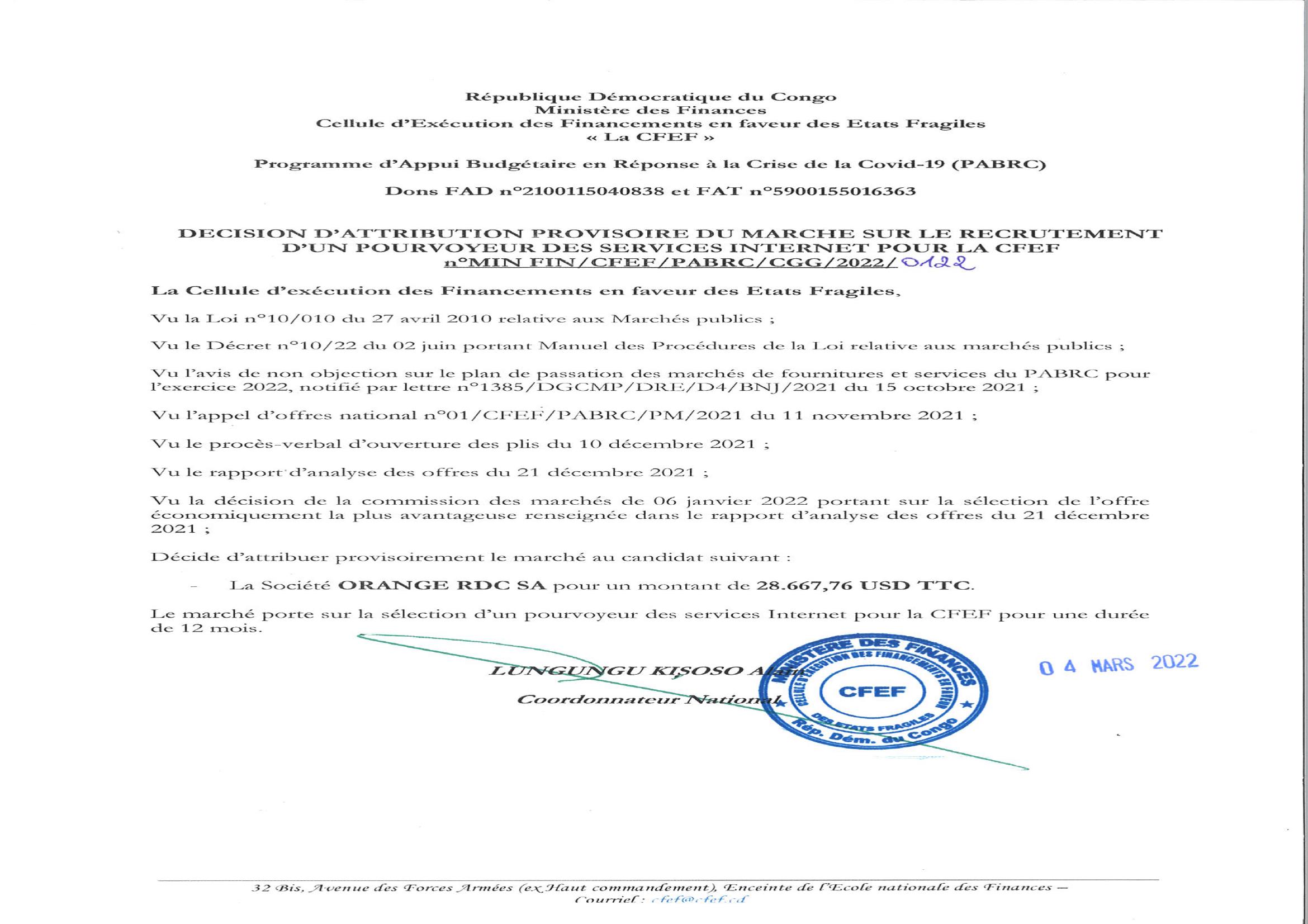 ATTRIBUTION PROVISOIRE DU MARCHÉ SUR LE RECRUTEMENT D’UN POURVOYEUR DES SERVICES INTERNET POUR LA CFEF À LA SOCIÉTÉ ORANGE RDC SA
