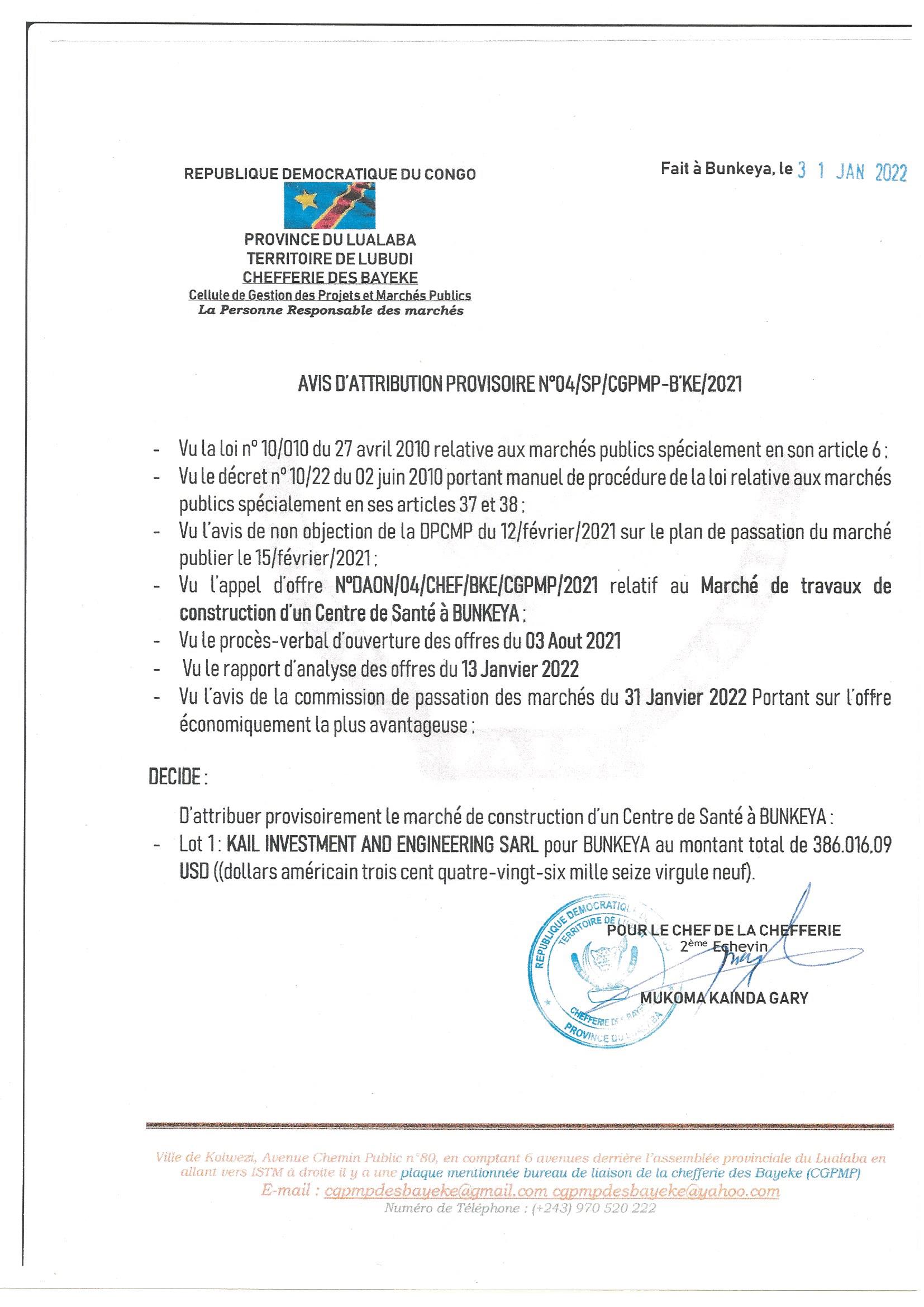 ATTRIBUTION PROVISOIRE DU MARCHE ACCORDEE A LA SOCIETE KAIL INVESTMENT AND ENGINEERING SARL RELATIVE AU lot 1 MARCHE DE TRAVAUX DE CONSTRUCTION D’UN CENTRE DE SANTE A BUNKEYA.