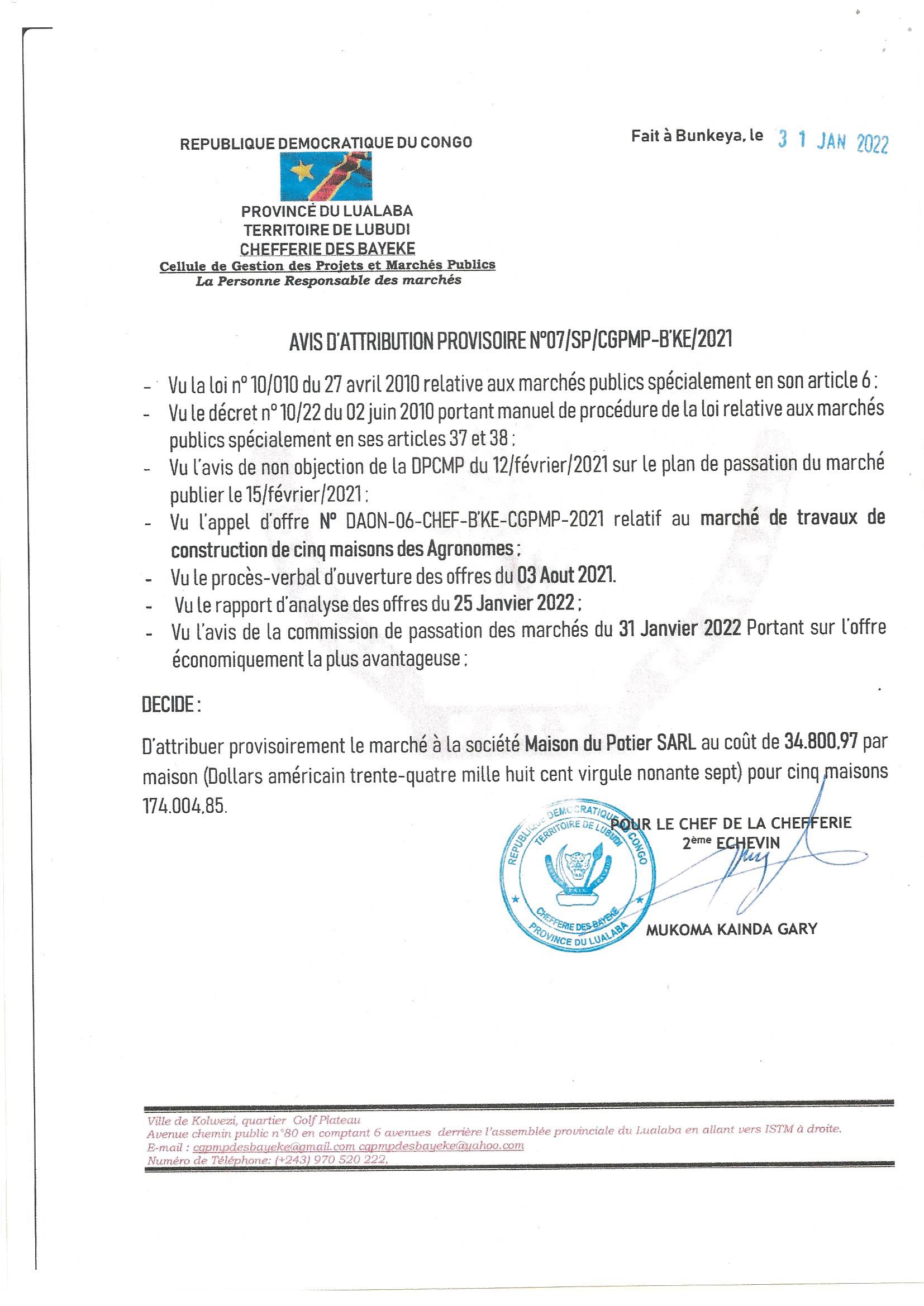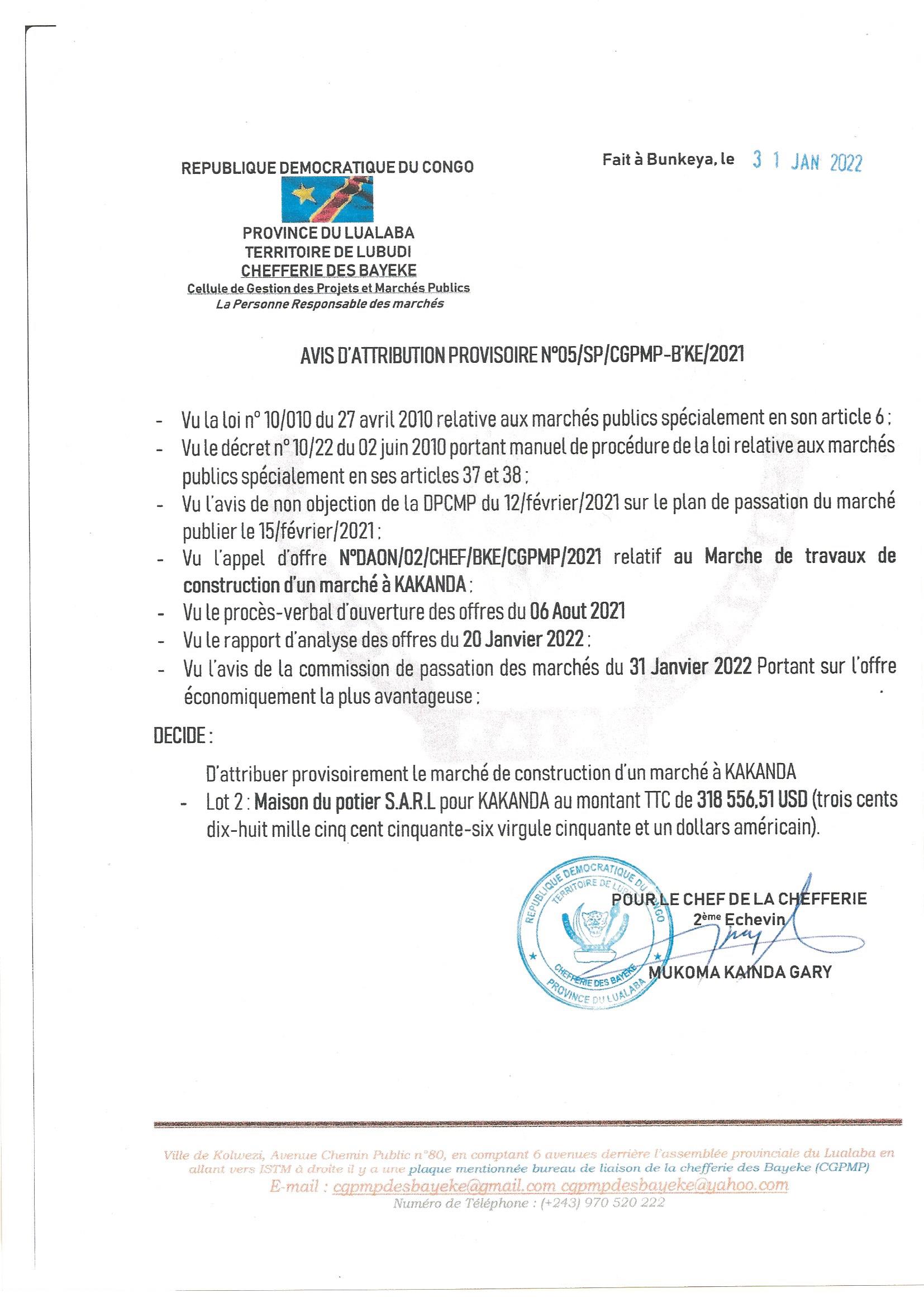 ATTRIBUTION PROVISOIRE DU MARCHE ACCORDEE A LA MAISON DU POTIER SARL RELATIVE AU LOT 2 DU MARCHE DE TRAVAUX DE CONSTRUCTION D’UN MARCHE A KAKANDA.