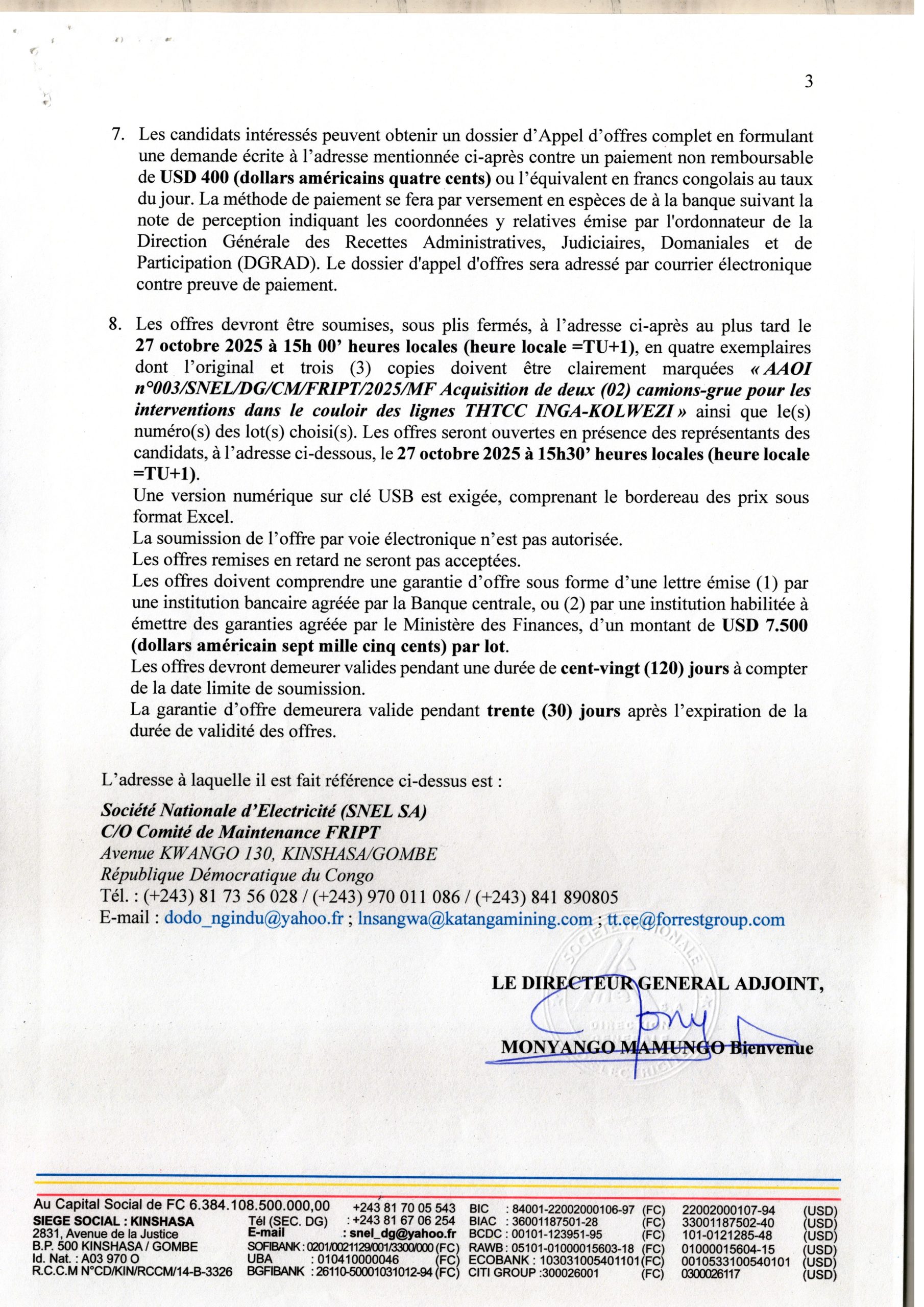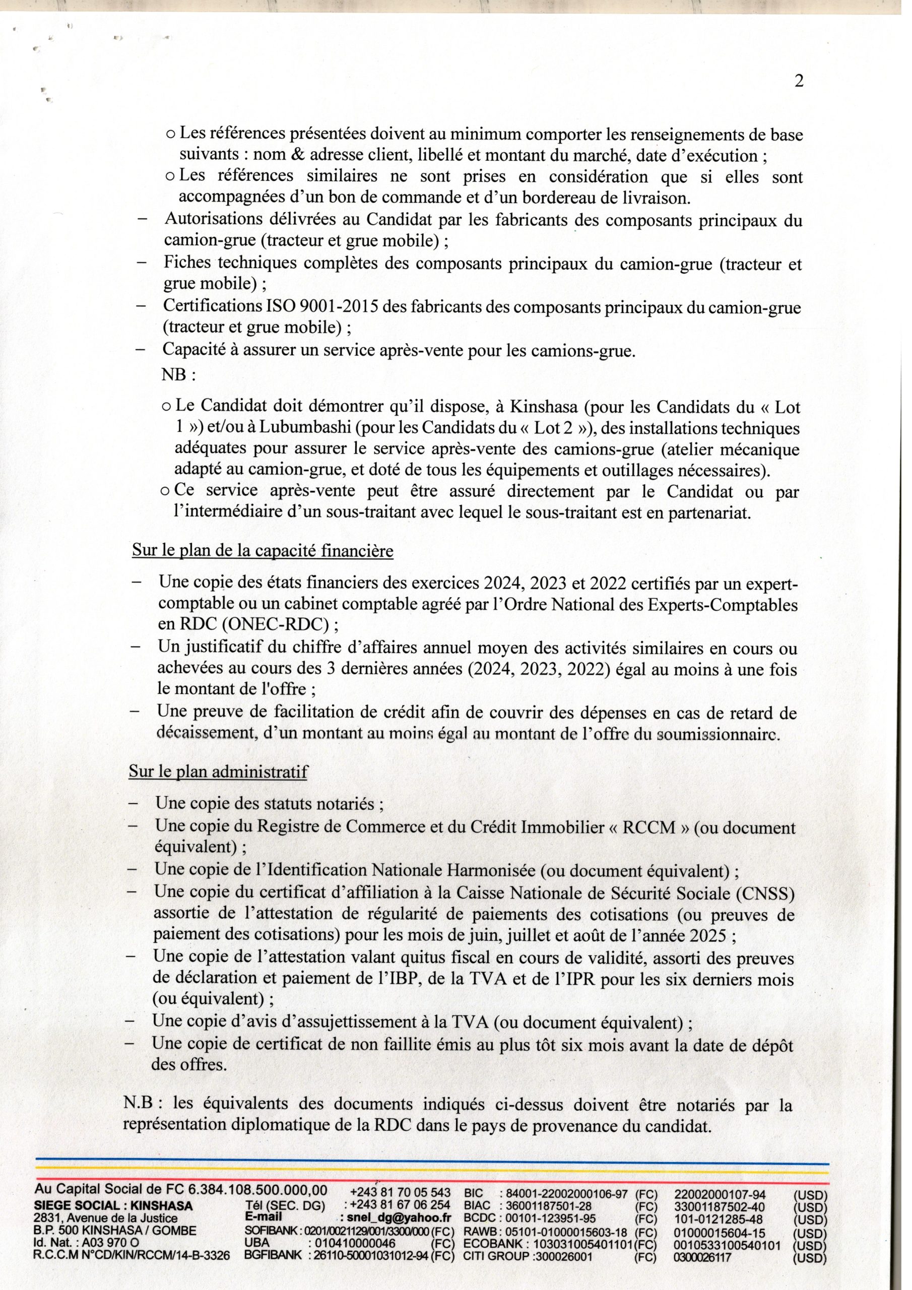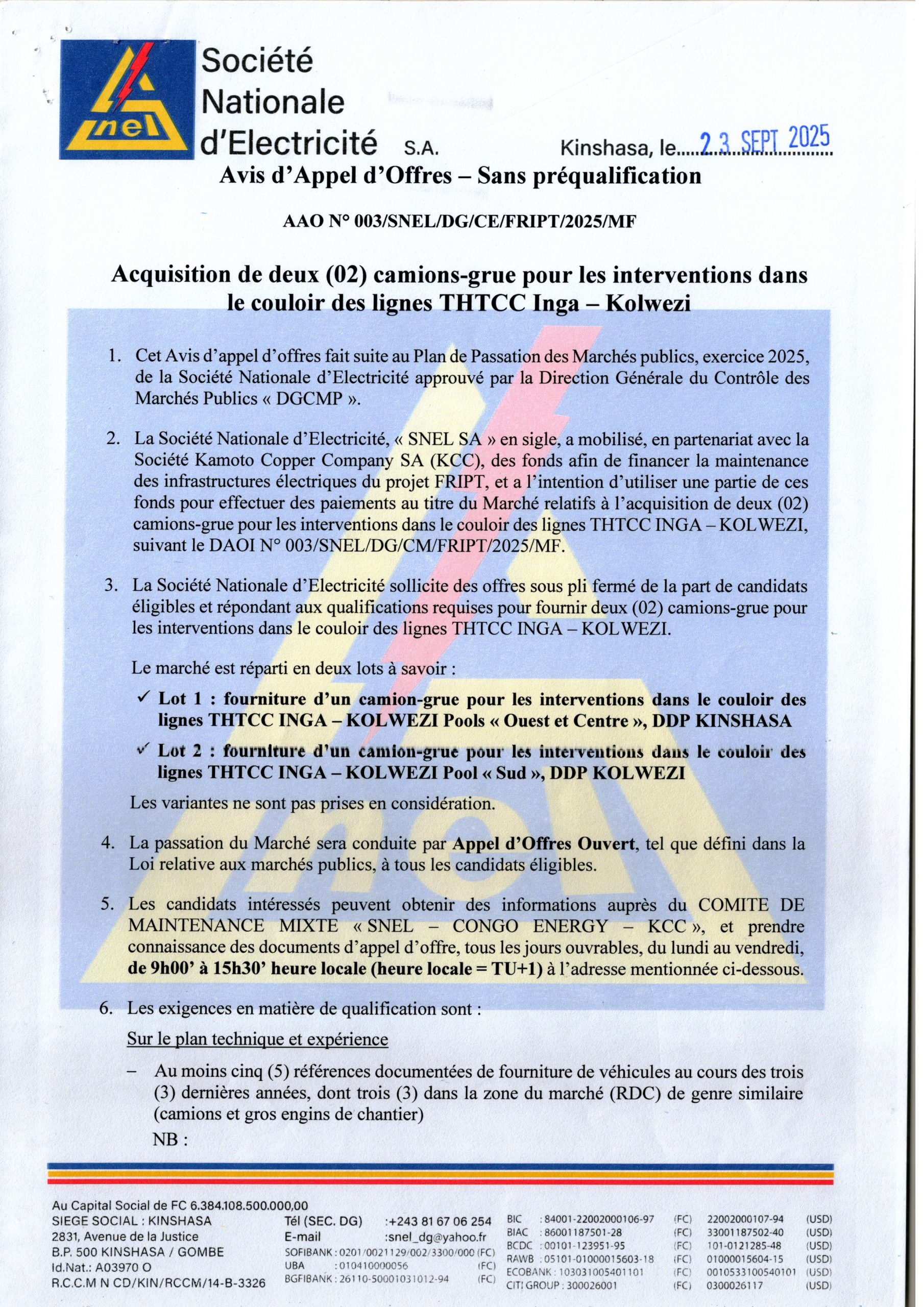 Acquisition de deux (2) camions-grue pour les interventions dans le couloir des lignes Inga-Kolwezi.