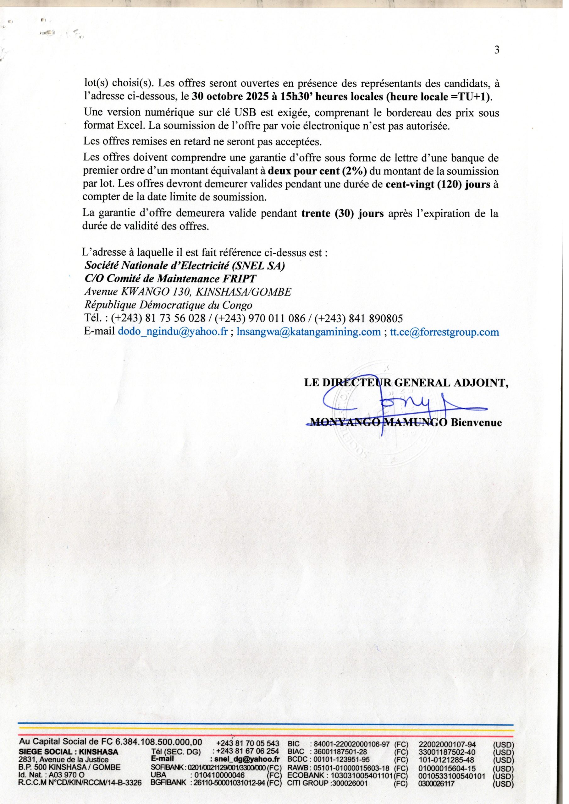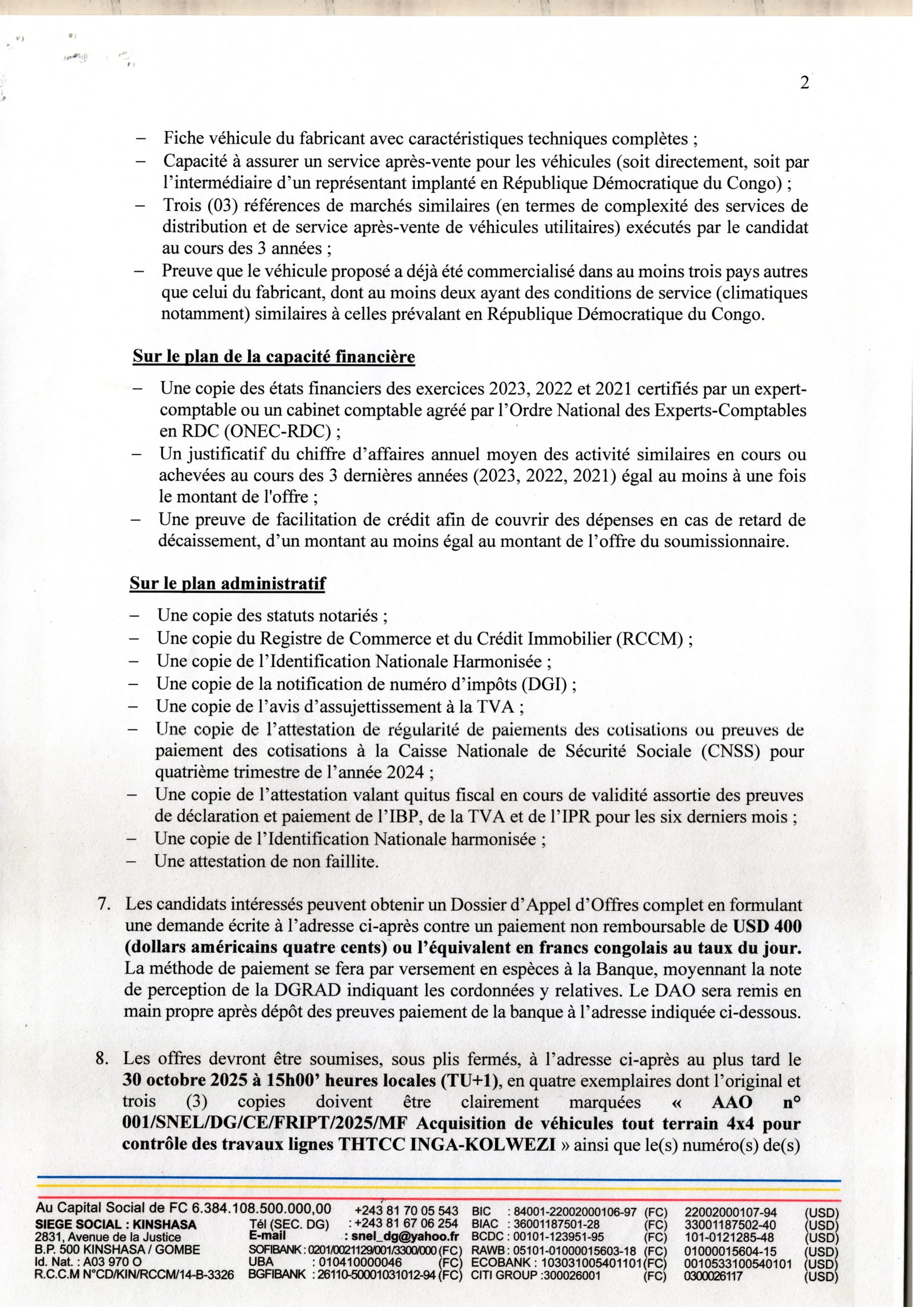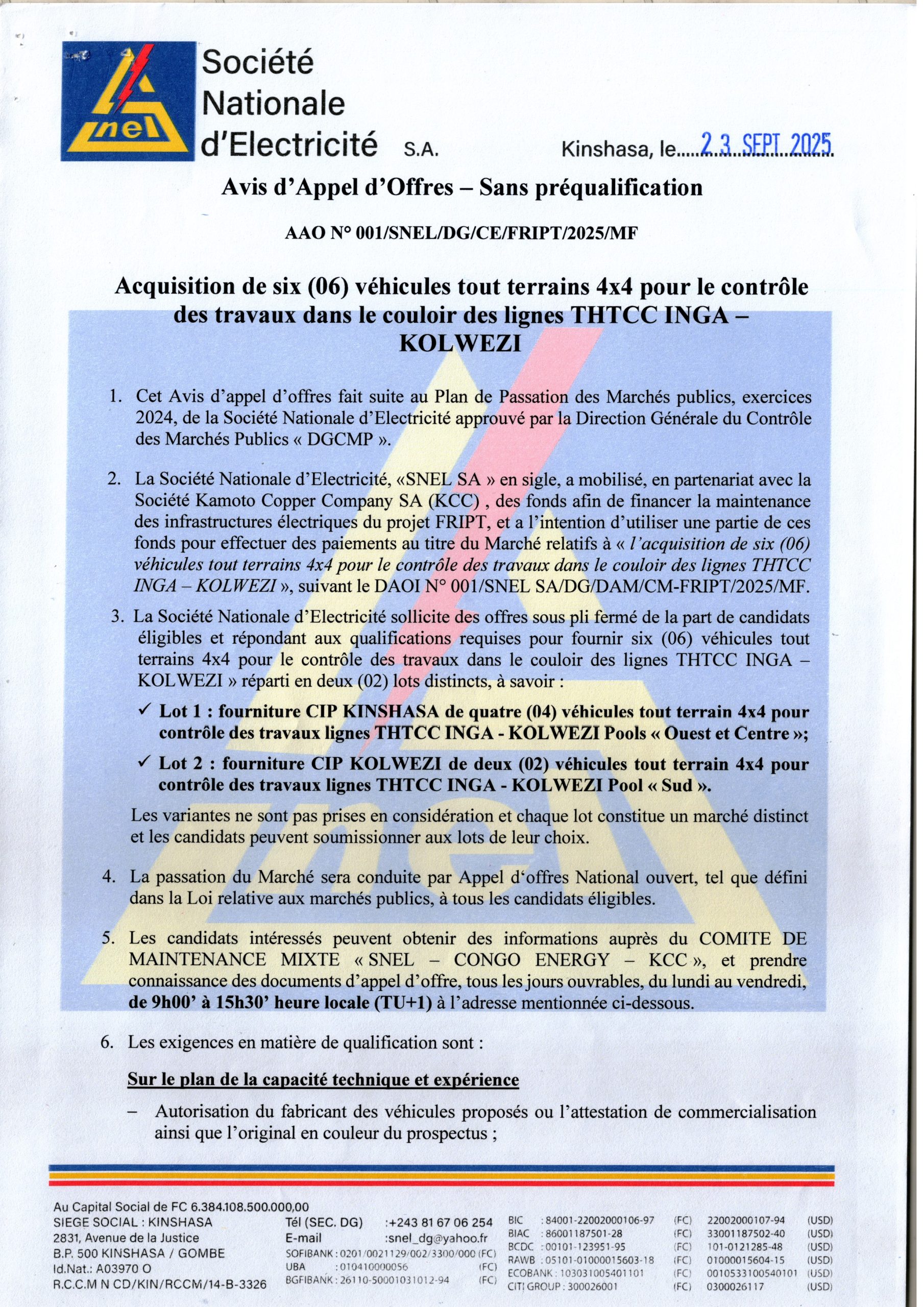 Acquisition de six (6) véhicules tout terrains 4×4 pour le contrôle des travaux dans le couloir des lignes THTCC INGA-KOLWEZI.