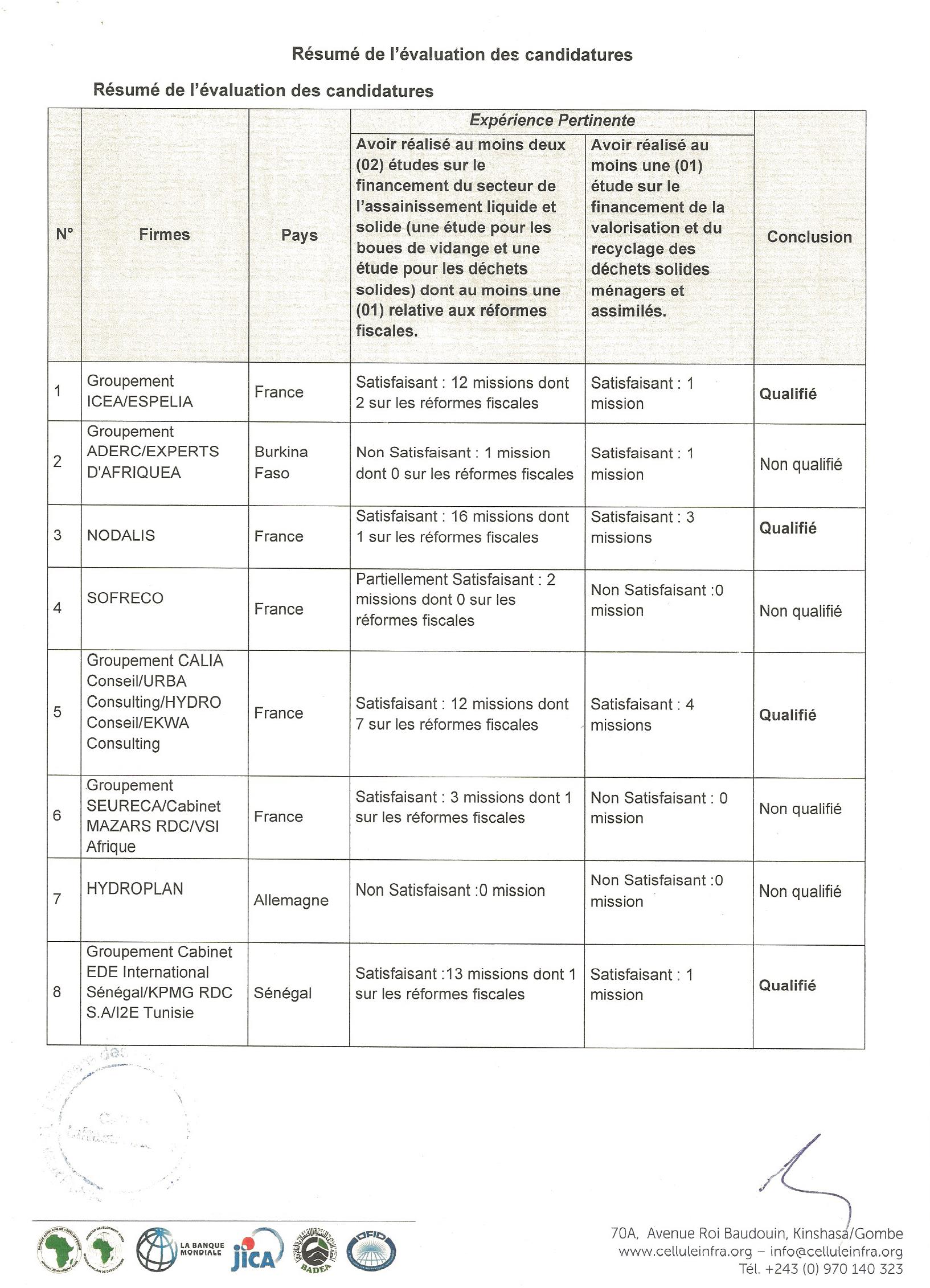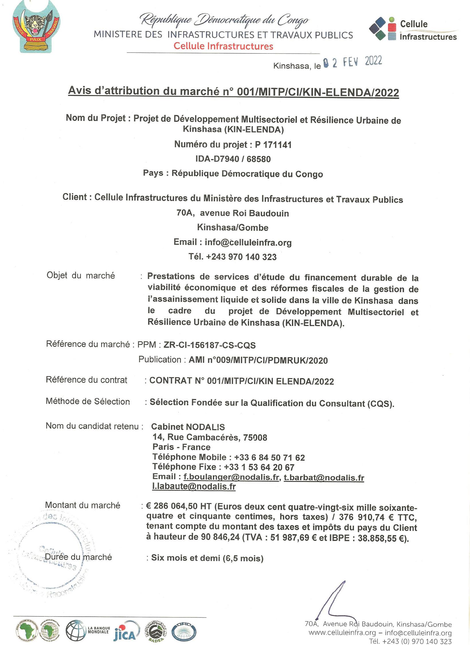 ATTRIBUTION DU MARCHÉ DE PRESTATION DE SERVICES D’ÉTUDE DU FINANCEMENT DURABLE DE LA VIABILITÉ ÉCONOMIQUE ET DES RÉFORMES FISCALES DE LA GESTION DE L’ASSAINISSEMENT LIQUIDE ET SOLIDE DANS LA VILLE DE KINSHASA,…AU CABINET NODALIS.