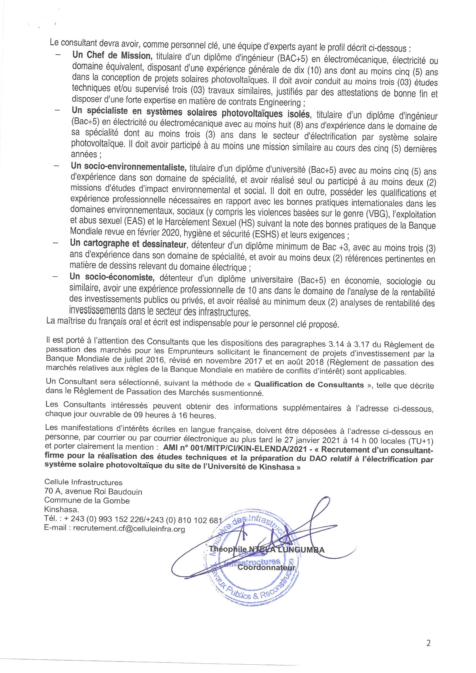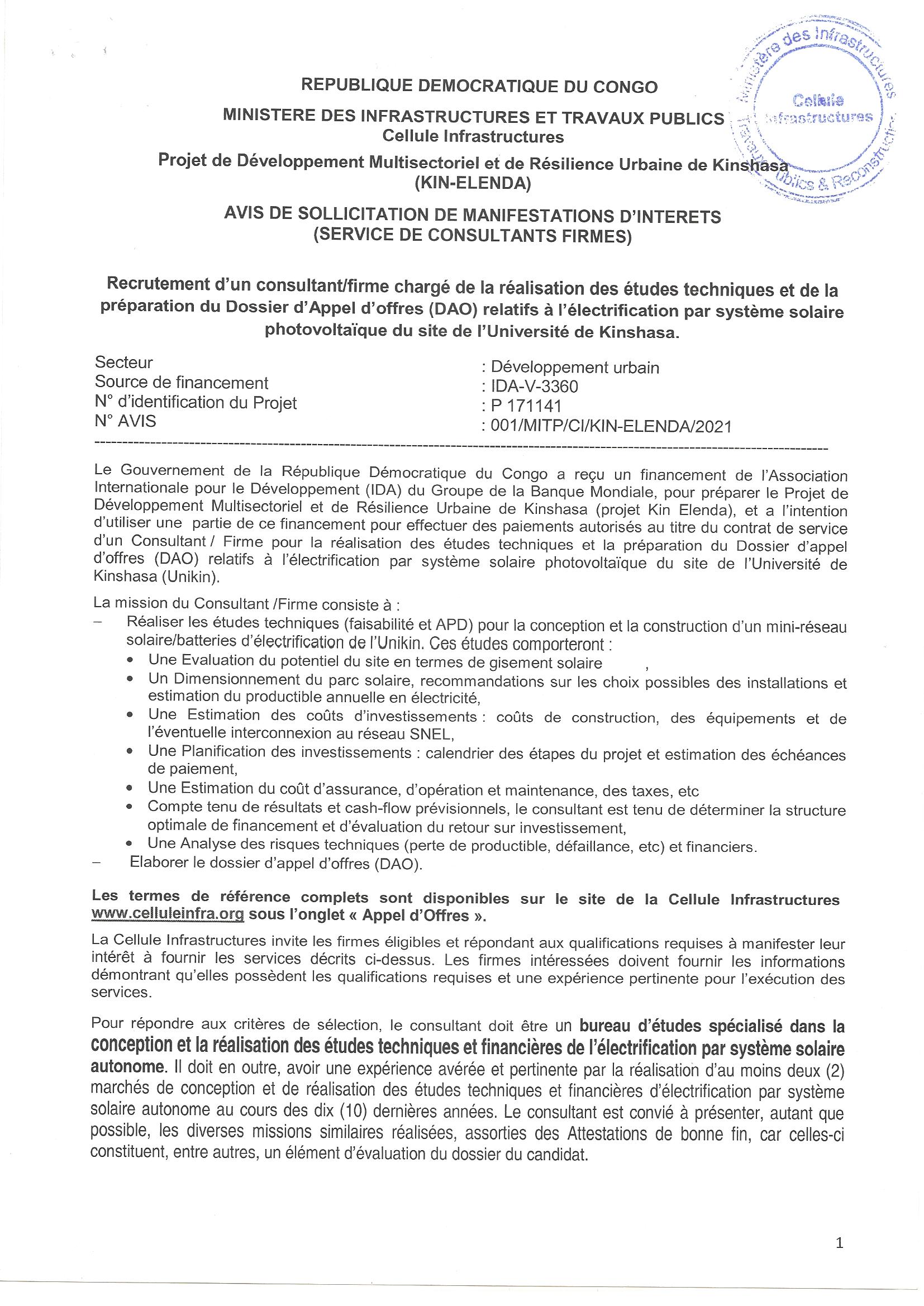 Recrutement d’un consultant (firme) charge de la réalisation des études techniques et de la préparation du dossier d’appel d’offres (DAO) relatifs à l’électrification par système solaire photovoltaïque du site de l’université de Kinshasa.