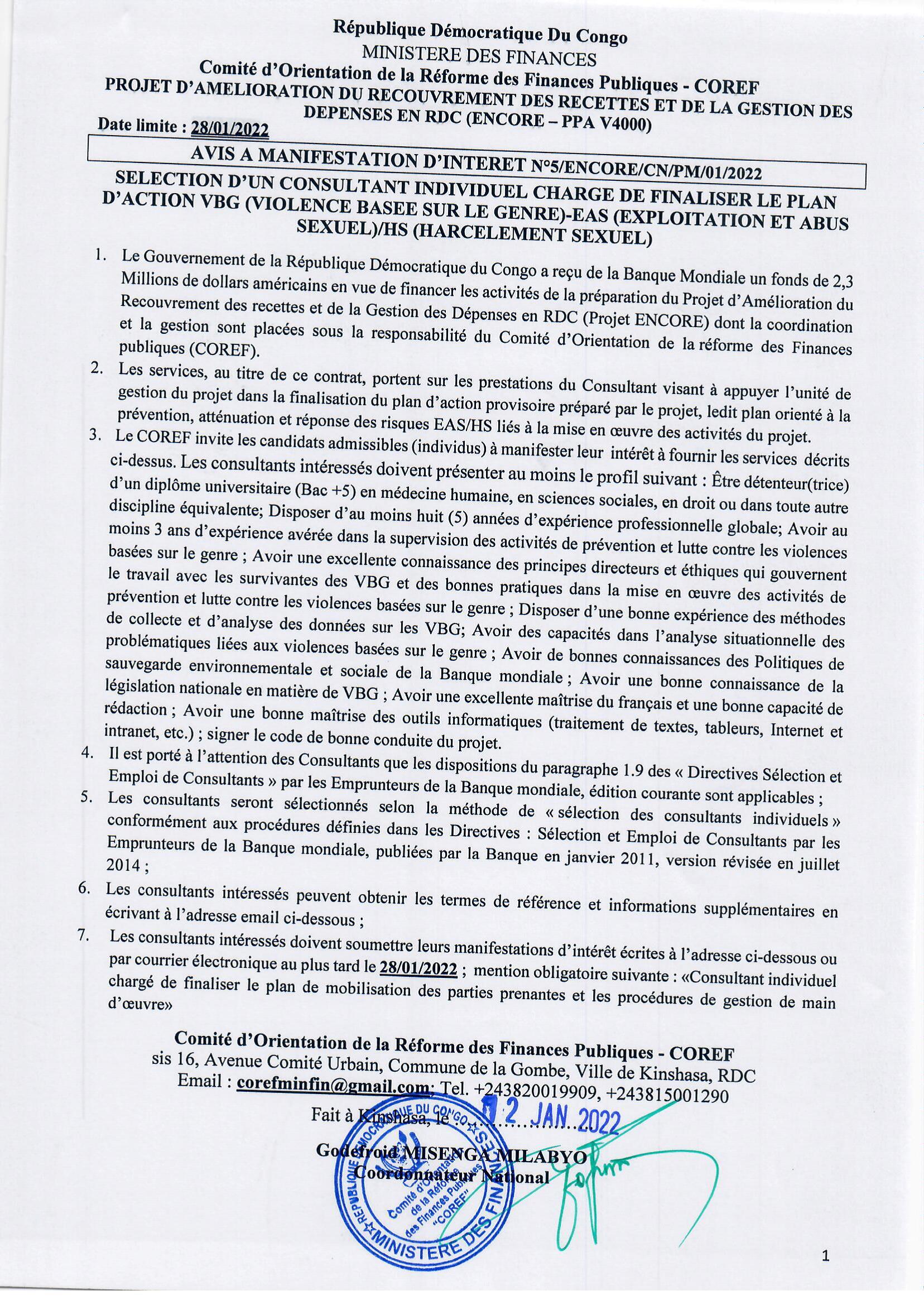 ATTRIBUTION PROVISOIRE DU MARCHE ACCORDEE A MONSIEUR MANGALU MOBHE AGBA RELATIVE AU RECRUTEMENT D’UN CONSULTANT NATIONAL SENIOR POUR LA RELECTURE DU RAPPORT FINAL DE L’ENQUETE PAR GRAPPE A INDICATEURS DES OBJECTIFS DE DEVELOPPEMENT DURABLE (EGI-ODD 2020)