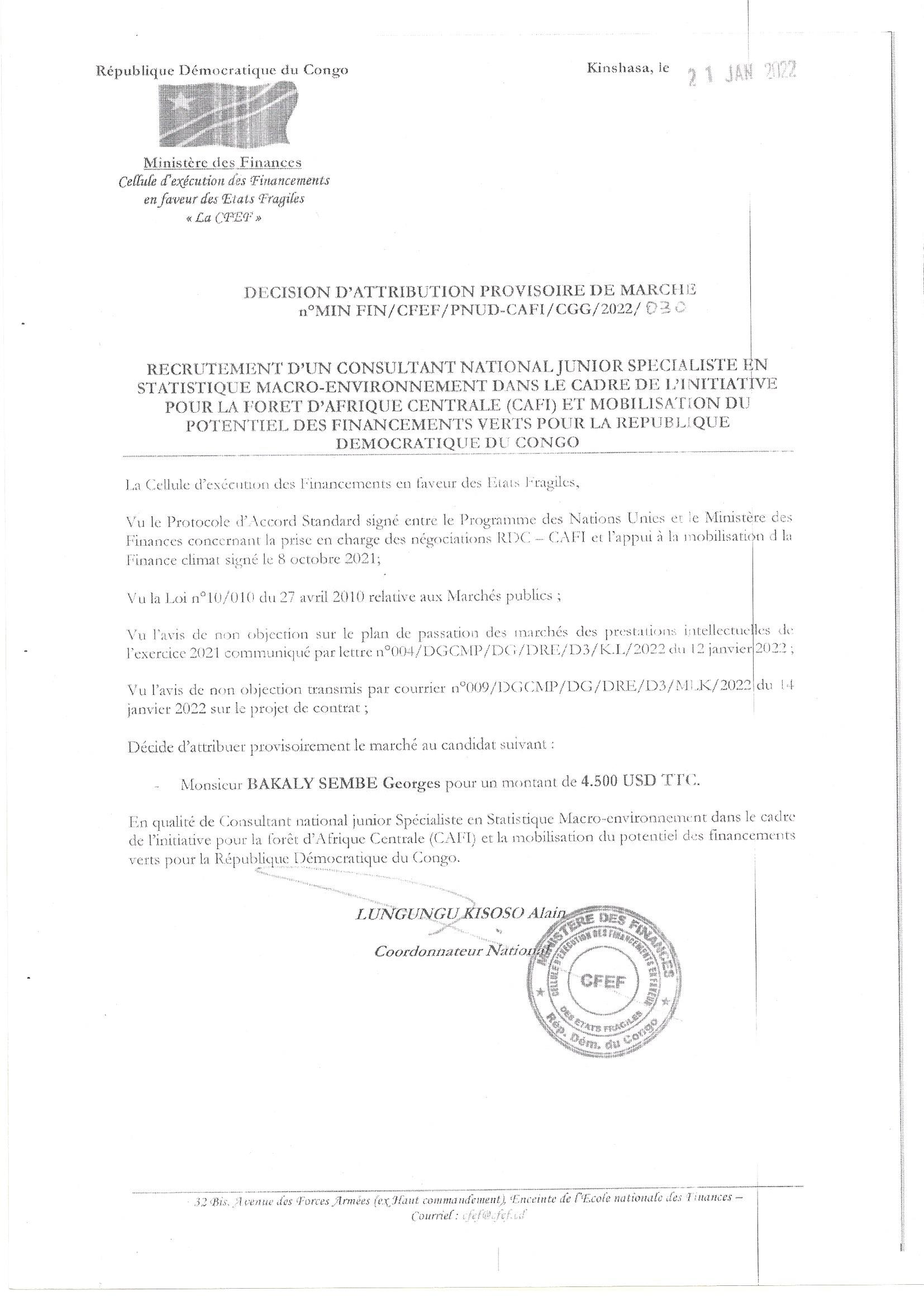 ATTRIBUTION PROVISOIRE D’UN CONSULTANT NATIONAL JUNIOR SPECIALISTE EN STATISTIQUE MACRO-ENVIRONNEMENT DANS LE CADRE DE L’INITIATIVE POUR LA FORET D’AFRIQUE CENTRAL (CAF1)ET MOBILISATION DU POTENTIEL DES FINANCEMENT VERTS POUR LA REPUBLIQUE DEMO