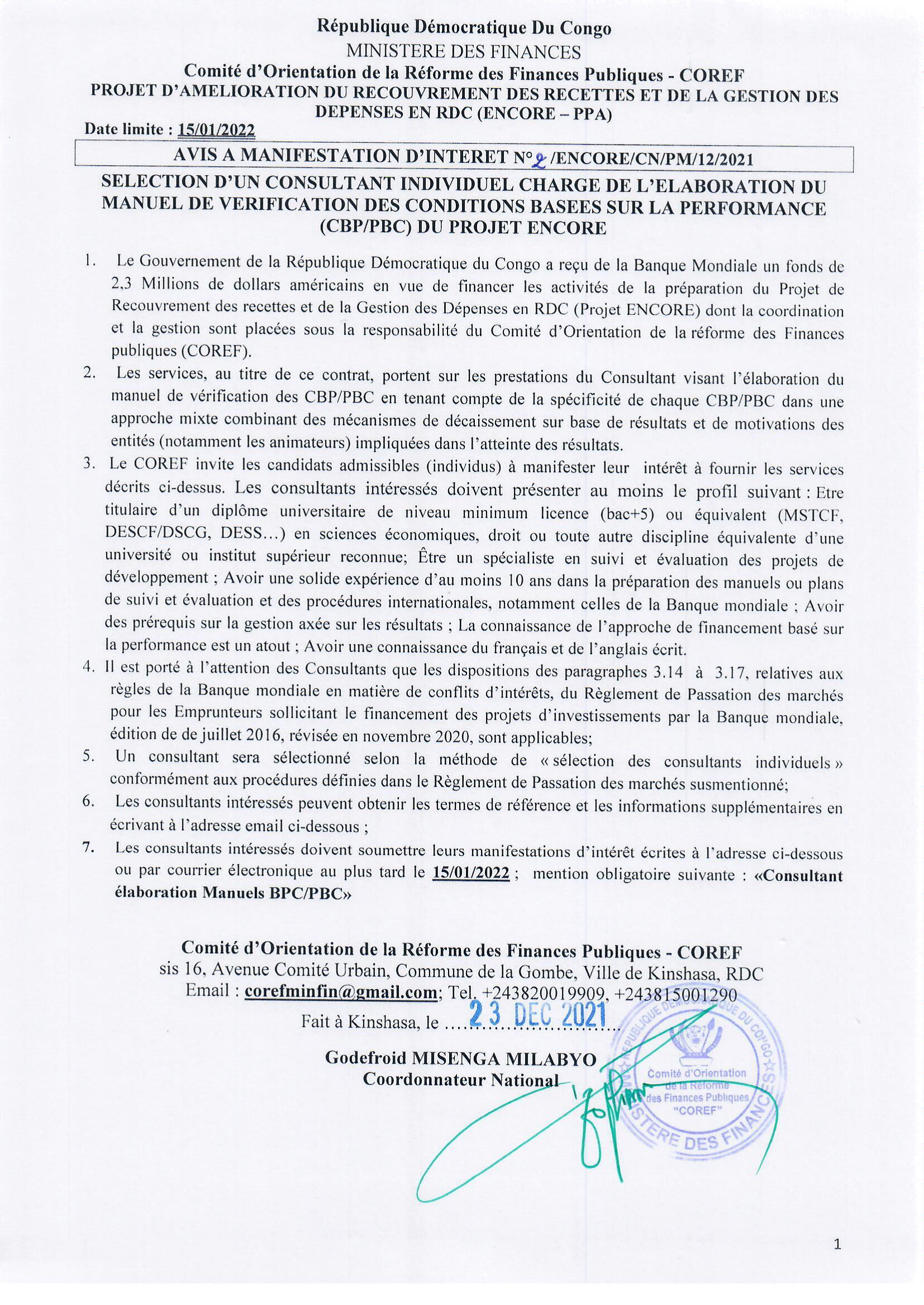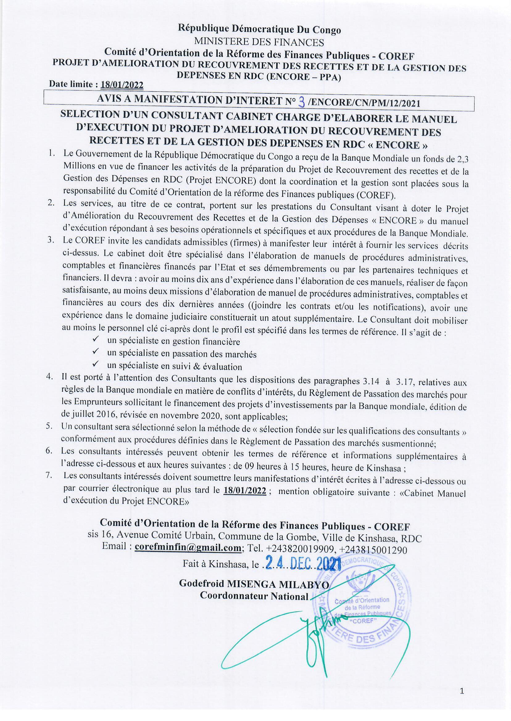 Sélection d’un consultant Cabinet chargé d’élaborer le Manuel d’exécution du Projet d’amélioration du recouvrement des Recettes et de la Gestion des dépenses en RDC « ENCORE »