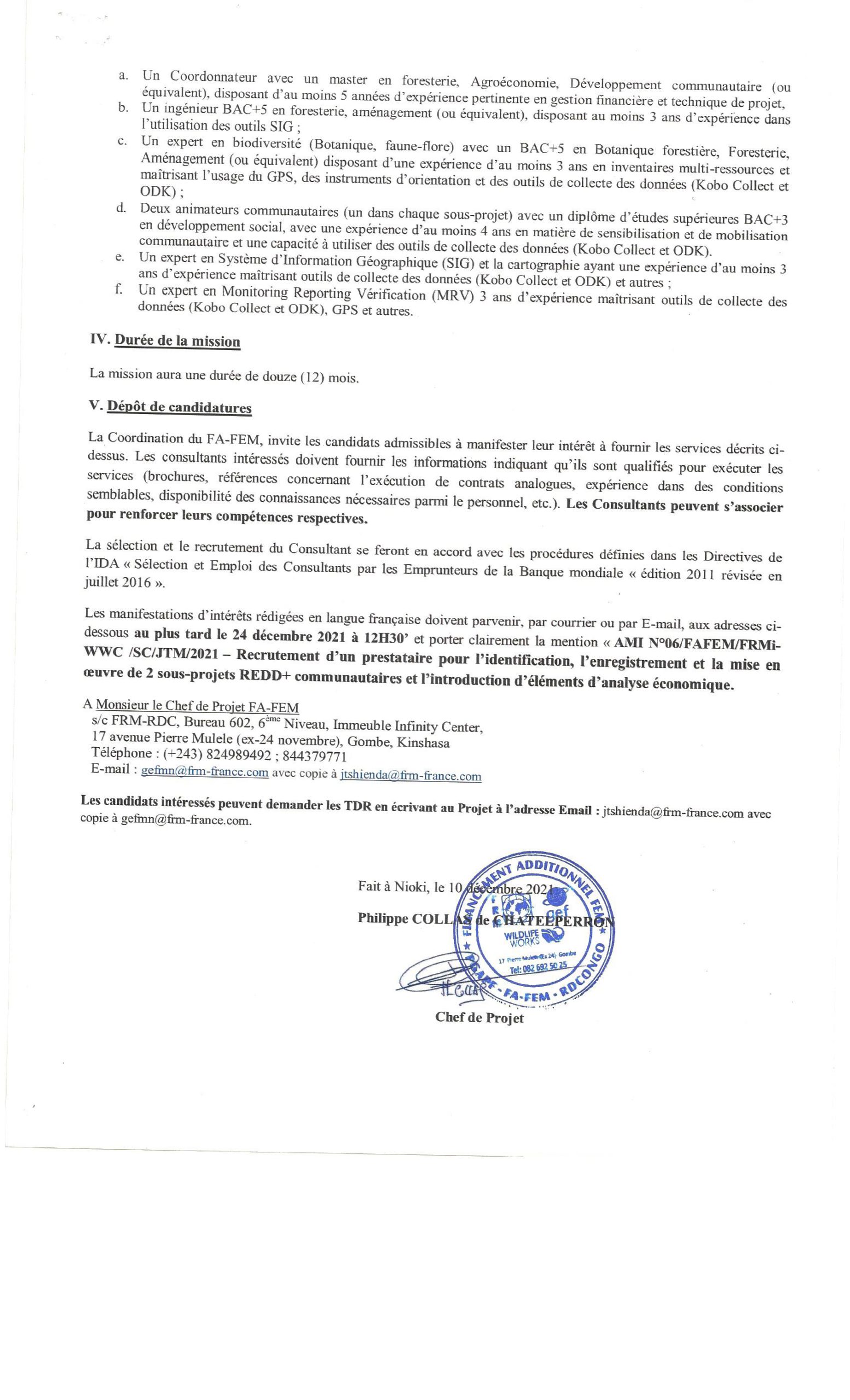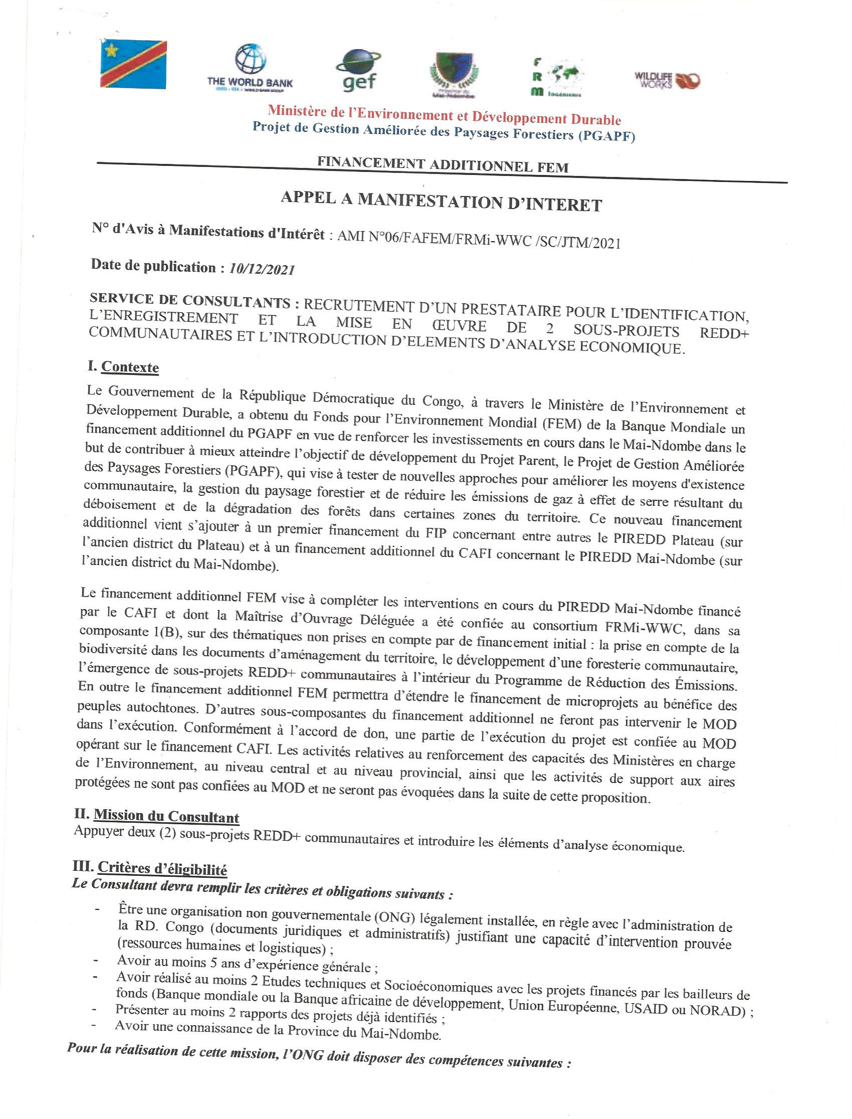 Recrutement d’un prestataire pour l’identification, l’enregistrement et la mise en œuvre de 2 sous-projets REDD+communautaires et l’introduction d’éléments d’analyse économique