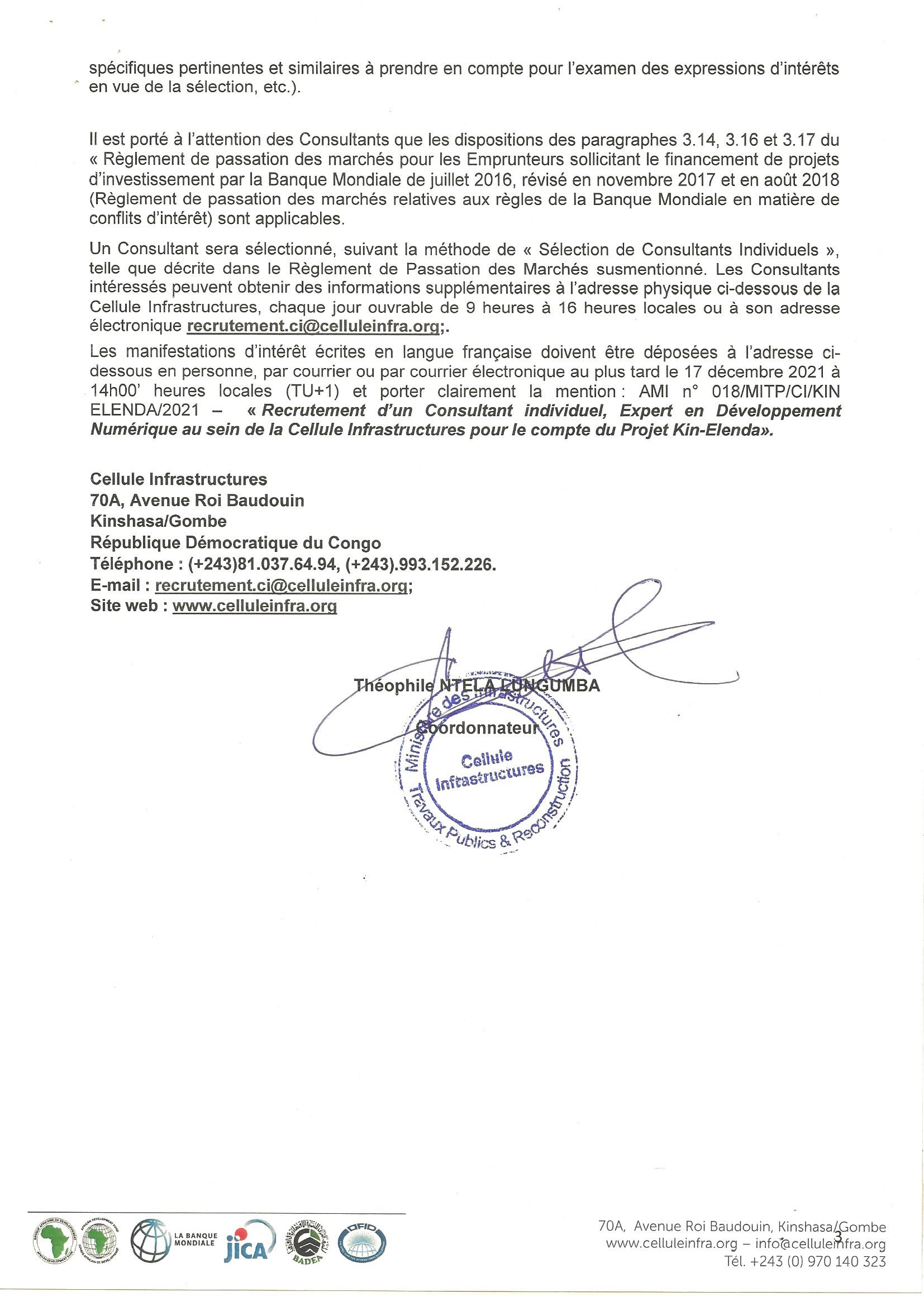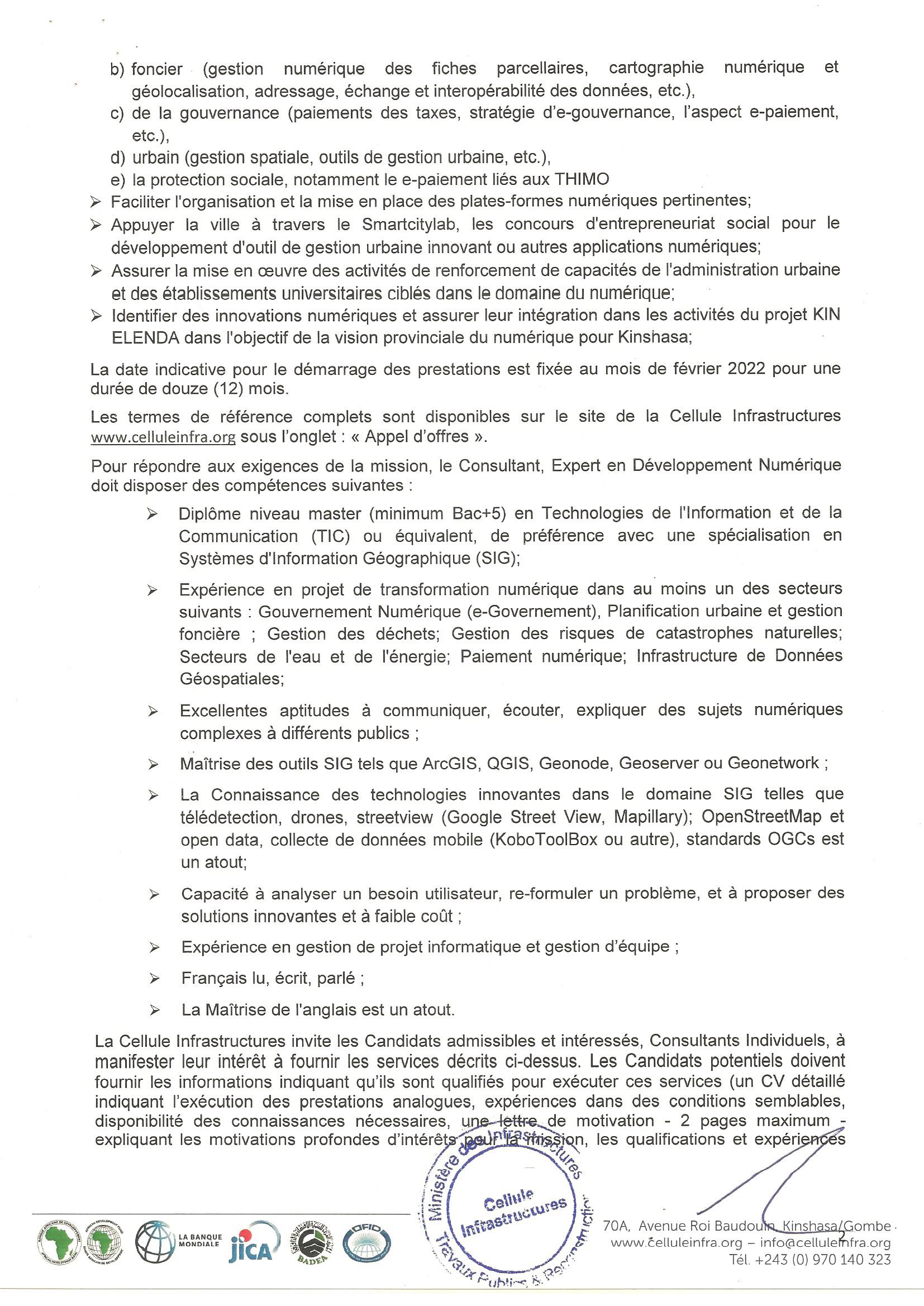 Recrutement d’Expert en développement numérique au sein de la Cellule Infrastructure pour le compte du Projet Kin-Elenda.