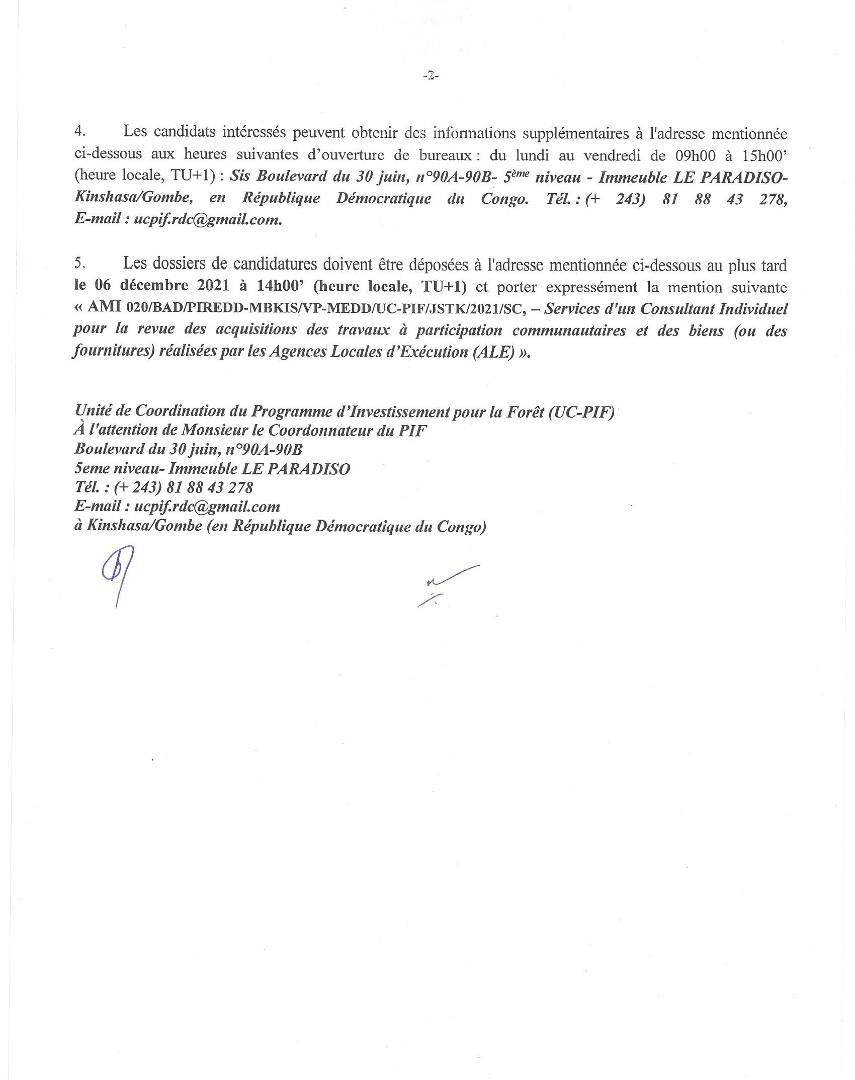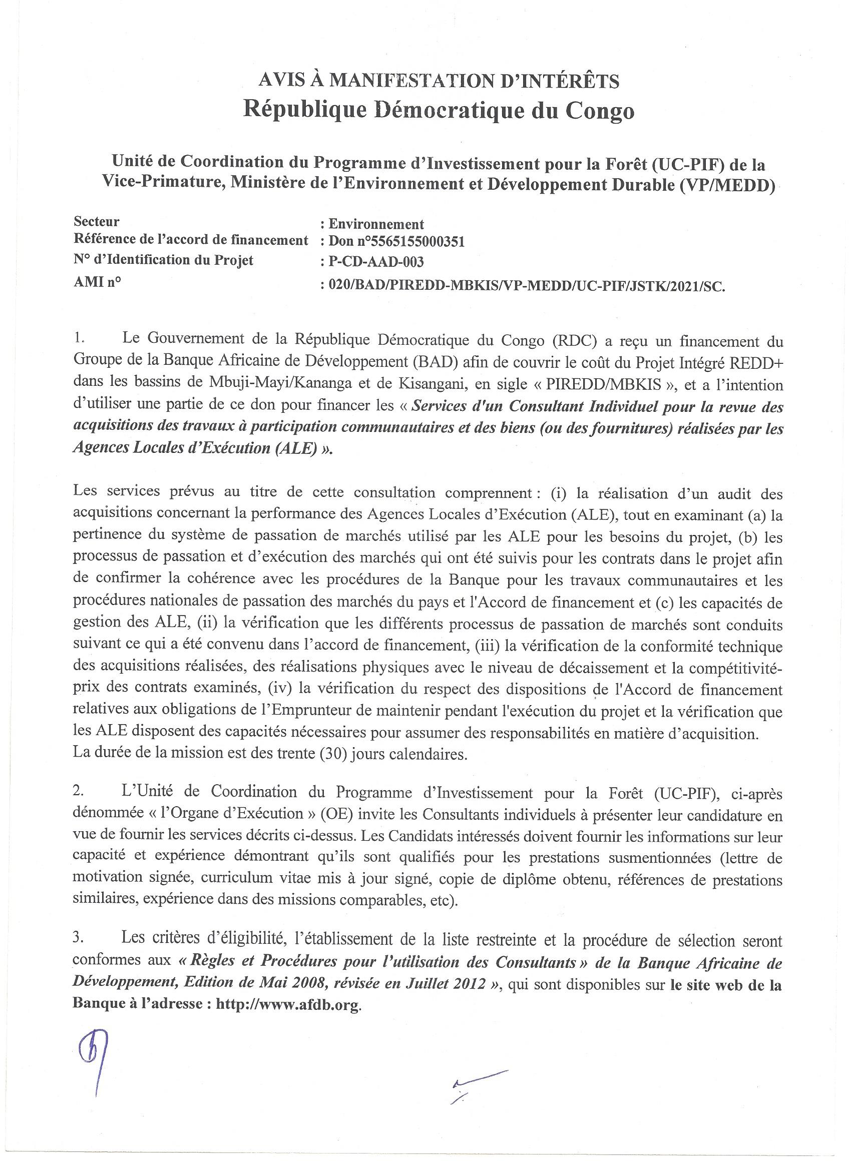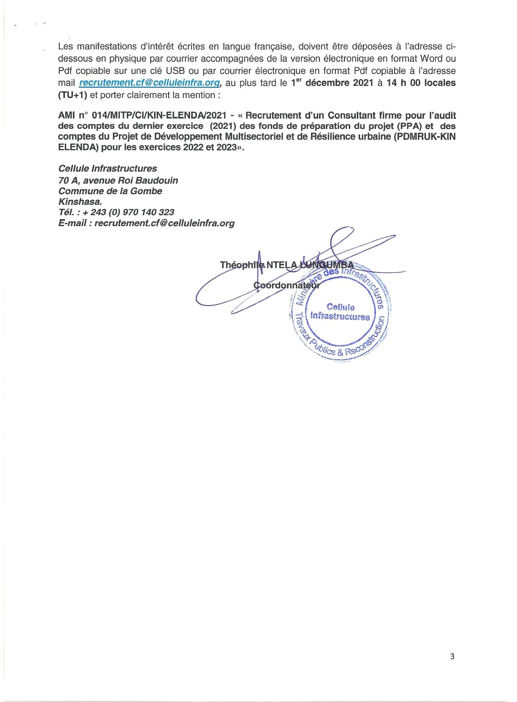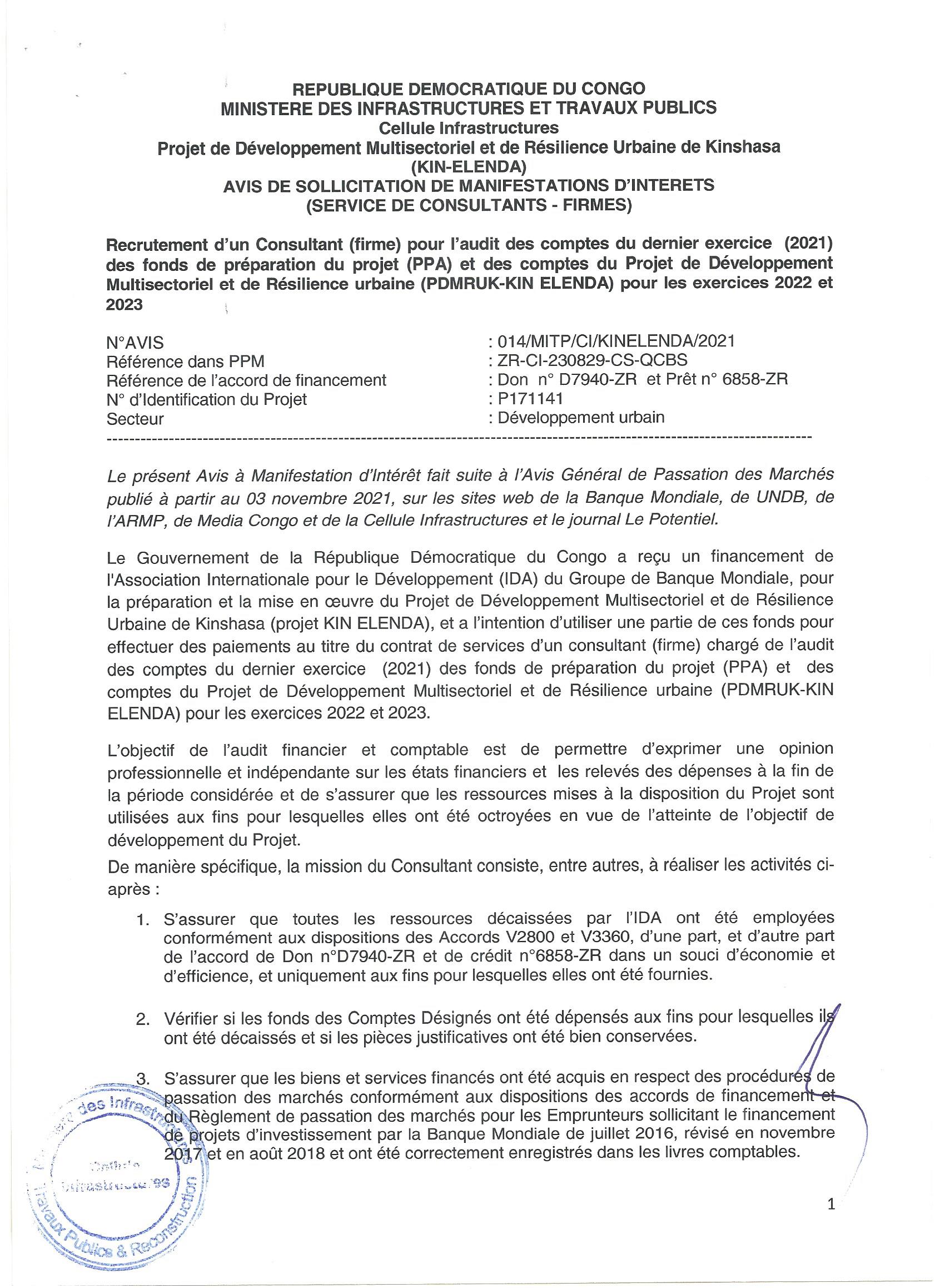 RECRUTEMENT D’UN CONSULTANT(FIRME) POUR L’AUDIT DES COMPTES DU DERNIER EXERCICE (2021) DES FONDS DE PREPARATION DU PROJET (PPA) ET DES COMPTES DU PROJET DE DEVELOPPEMENT MULTISECTORIEL ET DE RESILIENCE URBAINE(PDMRUK-KIN ELENDA) POUR LES EXERCICES 2022…