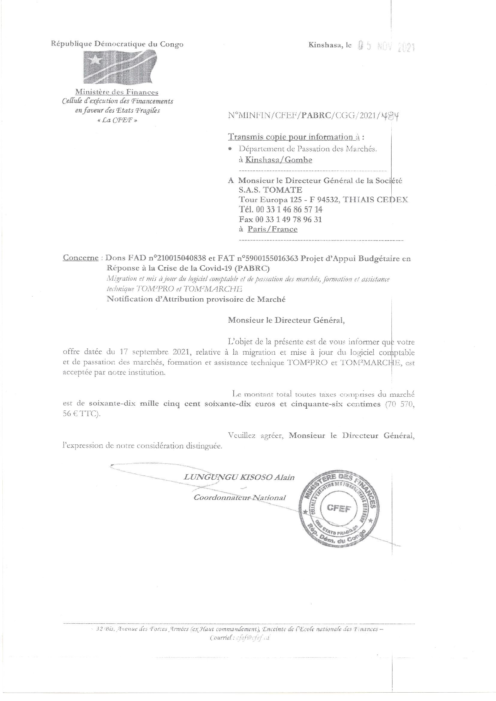 ATTRIBUTION PROVISOIRE DE MARCHÉ RELATIVE À LA MIGRATION ET MISE À JOUR DU LOGICIEL COMPTABLE ET DE PASSATION DES MARCHES, FORMATION ET ASSISTANCE TECHNIQUE TOM2PRO ET TOM2MARCHE À LA SOCIÉTÉ S.A.S. TOMATE