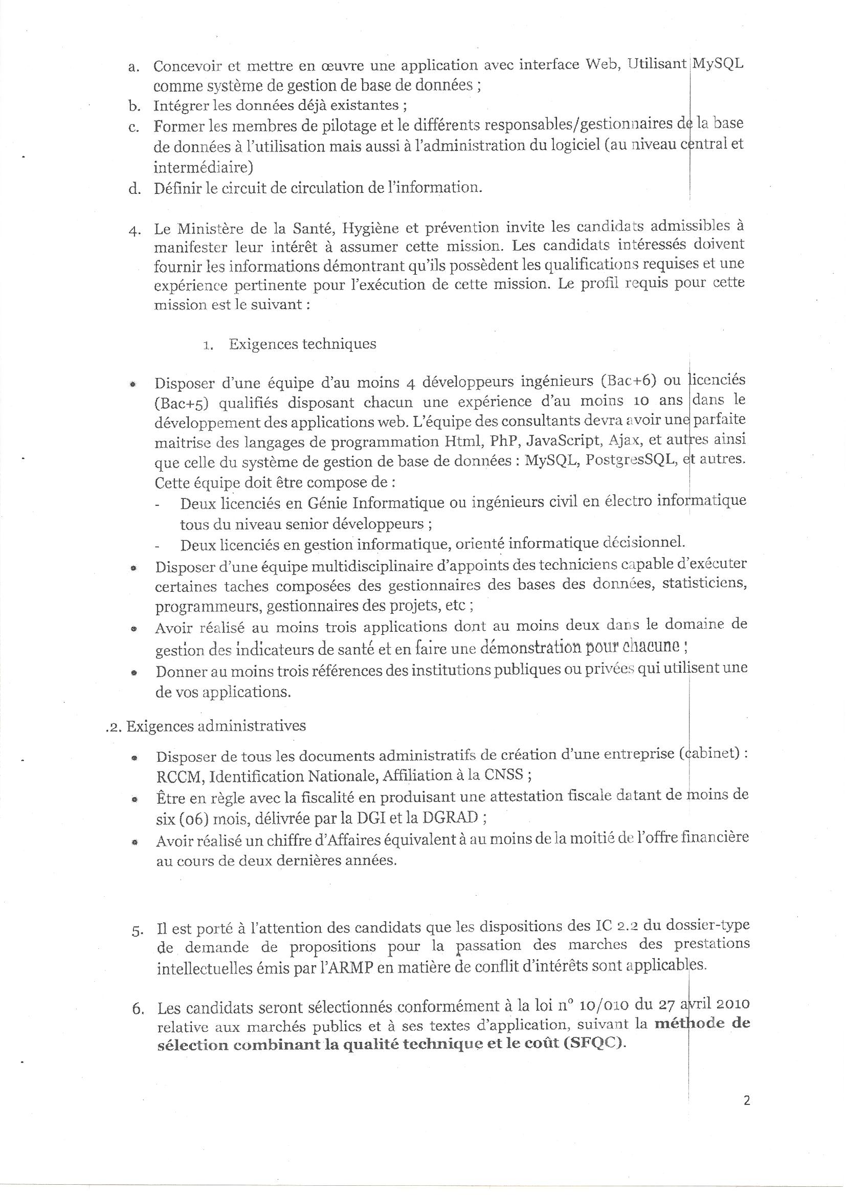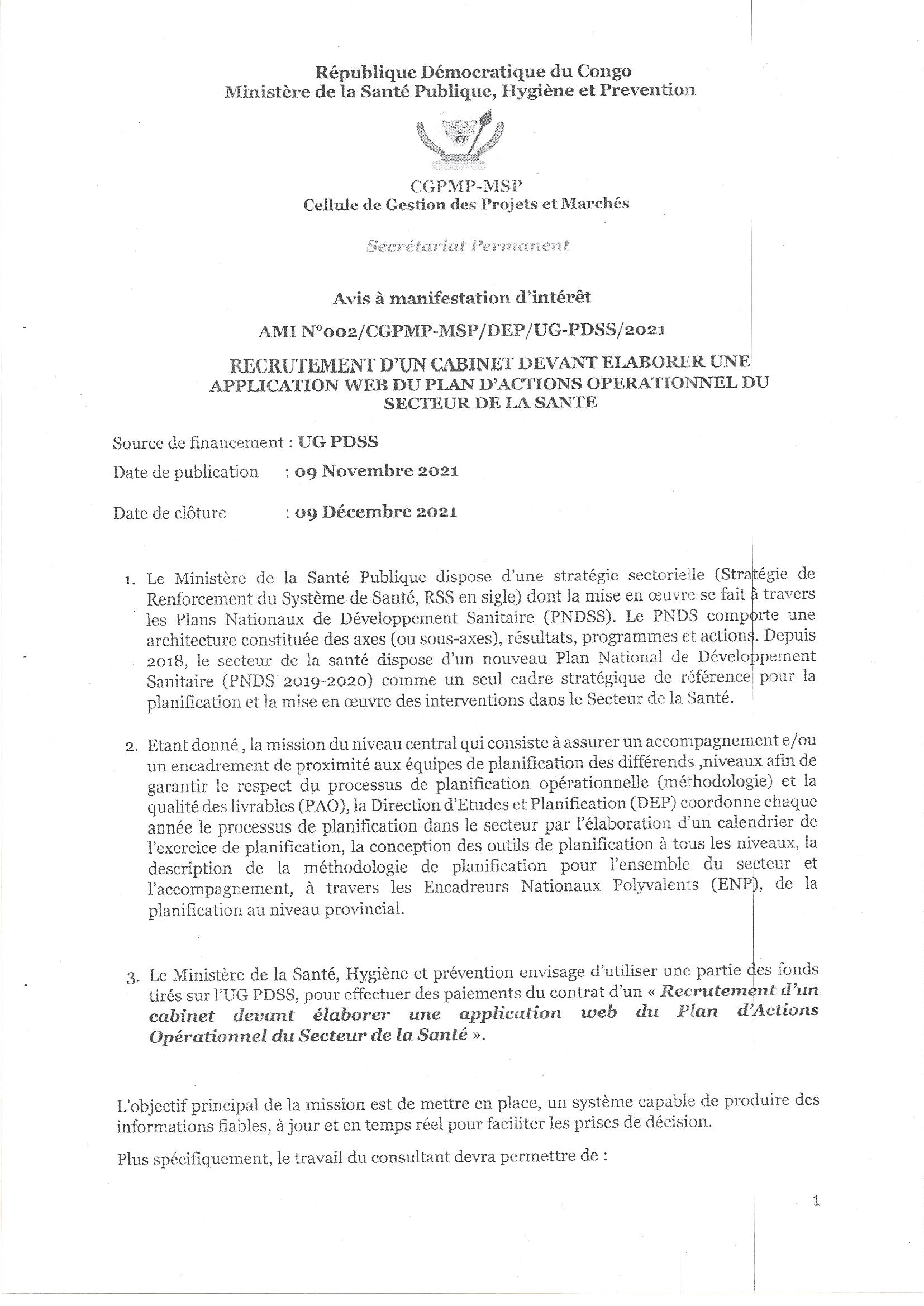 Recrutement d’un cabinet devant élaborer une application web du plan d’actions opérationnel du secteur de la santé.