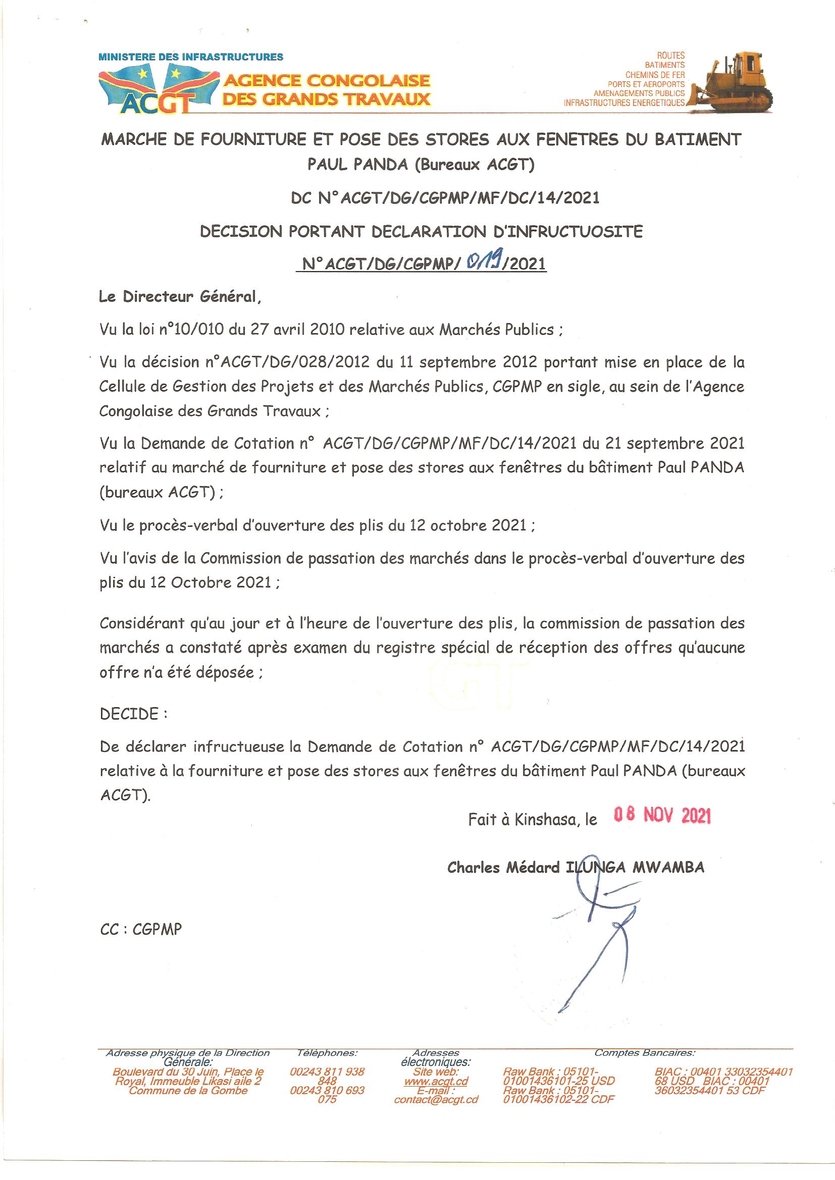 Décision portant déclaration d’infructuosité marche de fourniture et pose des stores aux fenêtres du bâtiment Paul panda (bureaux ACGT).
